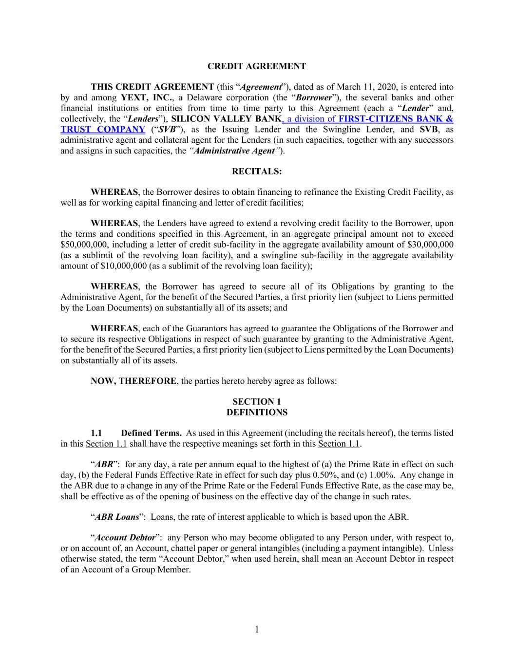 1 CREDIT AGREEMENT THIS CREDIT AGREEMENT (this “Agreement”), dated as of March 11, 2020, is entered into by and among YEXT, INC., a Delaware corporation (the “Borrower”), the several banks and other financial institutions or entities from time to time party to this Agreement (each a “Lender” and, collectively, the “Lenders”), SILICON VALLEY BANK, a division of FIRST-CITIZENS BANK & TRUST COMPANY (“SVB”), as the Issuing Lender and the Swingline Lender, and SVB, as administrative agent and collateral agent for the Lenders (in such capacities, together with any successors and assigns in such capacities, the “Administrative Agent”). RECITALS: WHEREAS, the Borrower desires to obtain financing to refinance the Existing Credit Facility, as well as for working capital financing and letter of credit facilities; WHEREAS, the Lenders have agreed to extend a revolving credit facility to the Borrower, upon the terms and conditions specified in this Agreement, in an aggregate principal amount not to exceed $50,000,000, including a letter of credit sub-facility in the aggregate availability amount of $30,000,000 (as a sublimit of the revolving loan facility), and a swingline sub-facility in the aggregate availability amount of $10,000,000 (as a sublimit of the revolving loan facility); WHEREAS, the Borrower has agreed to secure all of its Obligations by granting to the Administrative Agent, for the benefit of the Secured Parties, a first priority lien (subject to Liens permitted by the Loan Documents) on substantially all of its assets; and WHEREAS, each of the Guarantors has agreed to guarantee the Obligations of the Borrower and to secure its respective Obligations in respect of such guarantee by granting to the Administrative Agent, for the benefit of the Secured Parties, a first priority lien (subject to Liens permitted by the Loan Documents) on substantially all of its assets. NOW, THEREFORE, the parties hereto hereby agree as follows: DEFINITIONS Defined Terms. As used in this Agreement (including the recitals hereof), the terms listed in this Section 1.1 shall have the respective meanings set forth in this Section 1.1. “ABR”: for any day, a rate per annum equal to the highest of (a) the Prime Rate in effect on such day, (b) the Federal Funds Effective Rate in effect for such day plus 0.50%, and (c) 1.00%. Any change in the ABR due to a change in any of the Prime Rate or the Federal Funds Effective Rate, as the case may be, shall be effective as of the opening of business on the effective day of the change in such rates. “ABR Loans”: Loans, the rate of interest applicable to which is based upon the ABR. “Account Debtor”: any Person who may become obligated to any Person under, with respect to, or on account of, an Account, chattel paper or general intangibles (including a payment intangible). Unless otherwise stated, the term “Account Debtor,” when used herein, shall mean an Account Debtor in respect of an Account of a Group Member.