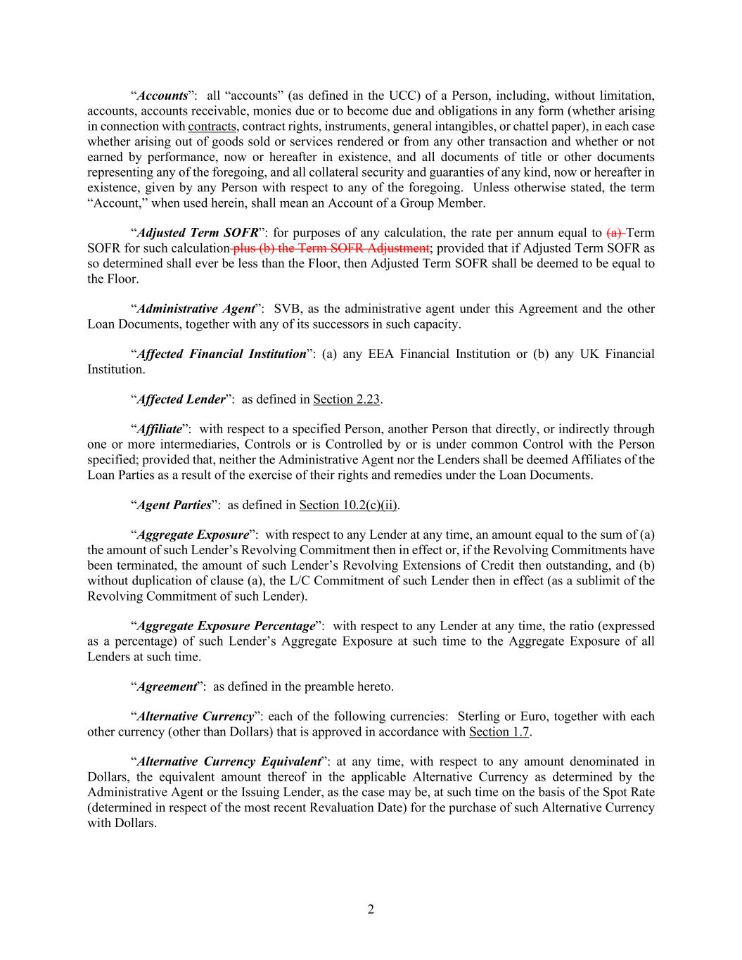 2 “Accounts”: all “accounts” (as defined in the UCC) of a Person, including, without limitation, accounts, accounts receivable, monies due or to become due and obligations in any form (whether arising in connection with contracts, contract rights, instruments, general intangibles, or chattel paper), in each case whether arising out of goods sold or services rendered or from any other transaction and whether or not earned by performance, now or hereafter in existence, and all documents of title or other documents representing any of the foregoing, and all collateral security and guaranties of any kind, now or hereafter in existence, given by any Person with respect to any of the foregoing. Unless otherwise stated, the term “Account,” when used herein, shall mean an Account of a Group Member. “Adjusted Term SOFR”: for purposes of any calculation, the rate per annum equal to (a) Term SOFR for such calculation plus (b) the Term SOFR Adjustment; provided that if Adjusted Term SOFR as so determined shall ever be less than the Floor, then Adjusted Term SOFR shall be deemed to be equal to the Floor. “Administrative Agent”: SVB, as the administrative agent under this Agreement and the other Loan Documents, together with any of its successors in such capacity. “Affected Financial Institution”: (a) any EEA Financial Institution or (b) any UK Financial Institution. “Affected Lender”: as defined in Section 2.23. “Affiliate”: with respect to a specified Person, another Person that directly, or indirectly through one or more intermediaries, Controls or is Controlled by or is under common Control with the Person specified; provided that, neither the Administrative Agent nor the Lenders shall be deemed Affiliates of the Loan Parties as a result of the exercise of their rights and remedies under the Loan Documents. “Agent Parties”: as defined in Section 10.2(c)(ii). “Aggregate Exposure”: with respect to any Lender at any time, an amount equal to the sum of (a) the amount of such Lender’s Revolving Commitment then in effect or, if the Revolving Commitments have been terminated, the amount of such Lender’s Revolving Extensions of Credit then outstanding, and (b) without duplication of clause (a), the L/C Commitment of such Lender then in effect (as a sublimit of the Revolving Commitment of such Lender). “Aggregate Exposure Percentage”: with respect to any Lender at any time, the ratio (expressed as a percentage) of such Lender’s Aggregate Exposure at such time to the Aggregate Exposure of all Lenders at such time. “Agreement”: as defined in the preamble hereto. “Alternative Currency”: each of the following currencies: Sterling or Euro, together with each other currency (other than Dollars) that is approved in accordance with Section 1.7. “Alternative Currency Equivalent”: at any time, with respect to any amount denominated in Dollars, the equivalent amount thereof in the applicable Alternative Currency as determined by the Administrative Agent or the Issuing Lender, as the case may be, at such time on the basis of the Spot Rate (determined in respect of the most recent Revaluation Date) for the purchase of such Alternative Currency with Dollars.
