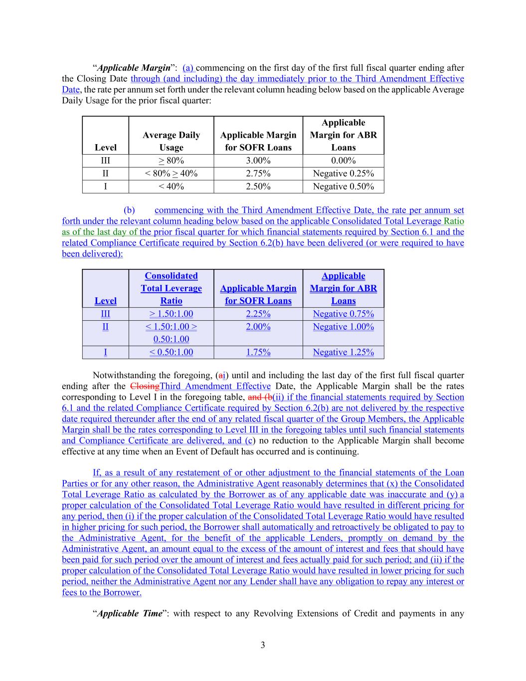 3 “Applicable Margin”: (a) commencing on the first day of the first full fiscal quarter ending after the Closing Date through (and including) the day immediately prior to the Third Amendment Effective Date, the rate per annum set forth under the relevant column heading below based on the applicable Average Daily Usage for the prior fiscal quarter: Level Average Daily Usage Applicable Margin for SOFR Loans Applicable Margin for ABR Loans III > 80% 3.00% 0.00% II < 80% > 40% 2.75% Negative 0.25% I < 40% 2.50% Negative 0.50% (b) commencing with the Third Amendment Effective Date, the rate per annum set forth under the relevant column heading below based on the applicable Consolidated Total Leverage Ratio as of the last day of the prior fiscal quarter for which financial statements required by Section 6.1 and the related Compliance Certificate required by Section 6.2(b) have been delivered (or were required to have been delivered): Level Consolidated Total Leverage Ratio Applicable Margin for SOFR Loans Applicable Margin for ABR Loans III > 1.50:1.00 2.25% Negative 0.75% II < 1.50:1.00 > 0.50:1.00 2.00% Negative 1.00% I < 0.50:1.00 1.75% Negative 1.25% Notwithstanding the foregoing, (ai) until and including the last day of the first full fiscal quarter ending after the ClosingThird Amendment Effective Date, the Applicable Margin shall be the rates corresponding to Level I in the foregoing table, and (b(ii) if the financial statements required by Section 6.1 and the related Compliance Certificate required by Section 6.2(b) are not delivered by the respective date required thereunder after the end of any related fiscal quarter of the Group Members, the Applicable Margin shall be the rates corresponding to Level III in the foregoing tables until such financial statements and Compliance Certificate are delivered, and (c) no reduction to the Applicable Margin shall become effective at any time when an Event of Default has occurred and is continuing. If, as a result of any restatement of or other adjustment to the financial statements of the Loan Parties or for any other reason, the Administrative Agent reasonably determines that (x) the Consolidated Total Leverage Ratio as calculated by the Borrower as of any applicable date was inaccurate and (y) a proper calculation of the Consolidated Total Leverage Ratio would have resulted in different pricing for any period, then (i) if the proper calculation of the Consolidated Total Leverage Ratio would have resulted in higher pricing for such period, the Borrower shall automatically and retroactively be obligated to pay to the Administrative Agent, for the benefit of the applicable Lenders, promptly on demand by the Administrative Agent, an amount equal to the excess of the amount of interest and fees that should have been paid for such period over the amount of interest and fees actually paid for such period; and (ii) if the proper calculation of the Consolidated Total Leverage Ratio would have resulted in lower pricing for such period, neither the Administrative Agent nor any Lender shall have any obligation to repay any interest or fees to the Borrower. “Applicable Time”: with respect to any Revolving Extensions of Credit and payments in any