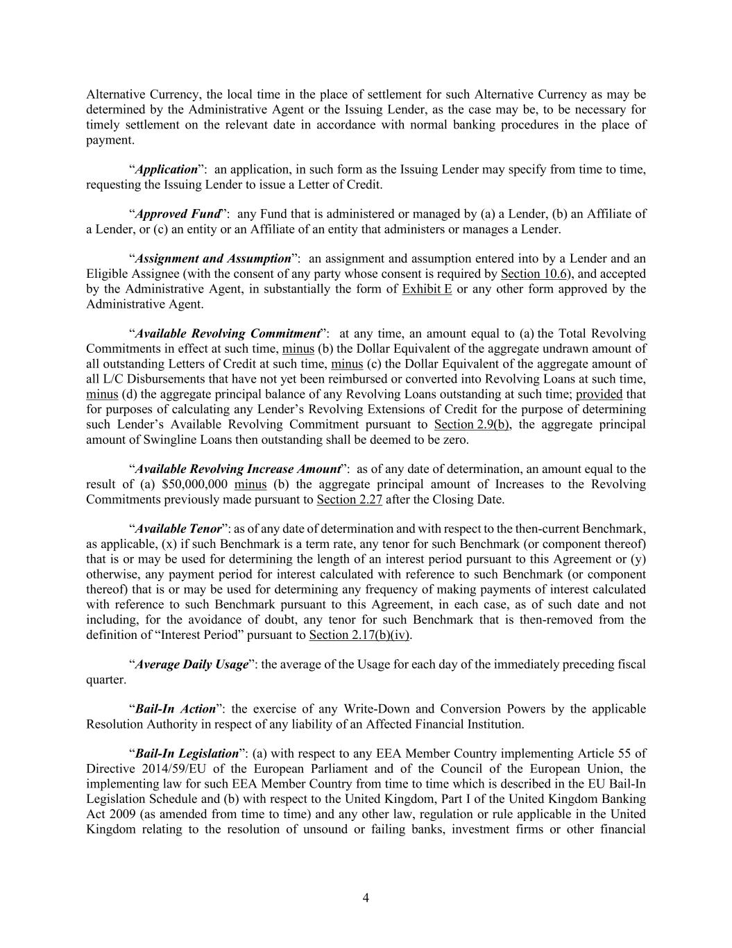 4 Alternative Currency, the local time in the place of settlement for such Alternative Currency as may be determined by the Administrative Agent or the Issuing Lender, as the case may be, to be necessary for timely settlement on the relevant date in accordance with normal banking procedures in the place of payment. “Application”: an application, in such form as the Issuing Lender may specify from time to time, requesting the Issuing Lender to issue a Letter of Credit. “Approved Fund”: any Fund that is administered or managed by (a) a Lender, (b) an Affiliate of a Lender, or (c) an entity or an Affiliate of an entity that administers or manages a Lender. “Assignment and Assumption”: an assignment and assumption entered into by a Lender and an Eligible Assignee (with the consent of any party whose consent is required by Section 10.6), and accepted by the Administrative Agent, in substantially the form of Exhibit E or any other form approved by the Administrative Agent. “Available Revolving Commitment”: at any time, an amount equal to (a) the Total Revolving Commitments in effect at such time, minus (b) the Dollar Equivalent of the aggregate undrawn amount of all outstanding Letters of Credit at such time, minus (c) the Dollar Equivalent of the aggregate amount of all L/C Disbursements that have not yet been reimbursed or converted into Revolving Loans at such time, minus (d) the aggregate principal balance of any Revolving Loans outstanding at such time; provided that for purposes of calculating any Lender’s Revolving Extensions of Credit for the purpose of determining such Lender’s Available Revolving Commitment pursuant to Section 2.9(b), the aggregate principal amount of Swingline Loans then outstanding shall be deemed to be zero. “Available Revolving Increase Amount”: as of any date of determination, an amount equal to the result of (a) $50,000,000 minus (b) the aggregate principal amount of Increases to the Revolving Commitments previously made pursuant to Section 2.27 after the Closing Date. “Available Tenor”: as of any date of determination and with respect to the then-current Benchmark, as applicable, (x) if such Benchmark is a term rate, any tenor for such Benchmark (or component thereof) that is or may be used for determining the length of an interest period pursuant to this Agreement or (y) otherwise, any payment period for interest calculated with reference to such Benchmark (or component thereof) that is or may be used for determining any frequency of making payments of interest calculated with reference to such Benchmark pursuant to this Agreement, in each case, as of such date and not including, for the avoidance of doubt, any tenor for such Benchmark that is then-removed from the definition of “Interest Period” pursuant to Section 2.17(b)(iv). “Average Daily Usage”: the average of the Usage for each day of the immediately preceding fiscal quarter. “Bail-In Action”: the exercise of any Write-Down and Conversion Powers by the applicable Resolution Authority in respect of any liability of an Affected Financial Institution. “Bail-In Legislation”: (a) with respect to any EEA Member Country implementing Article 55 of Directive 2014/59/EU of the European Parliament and of the Council of the European Union, the implementing law for such EEA Member Country from time to time which is described in the EU Bail-In Legislation Schedule and (b) with respect to the United Kingdom, Part I of the United Kingdom Banking Act 2009 (as amended from time to time) and any other law, regulation or rule applicable in the United Kingdom relating to the resolution of unsound or failing banks, investment firms or other financial