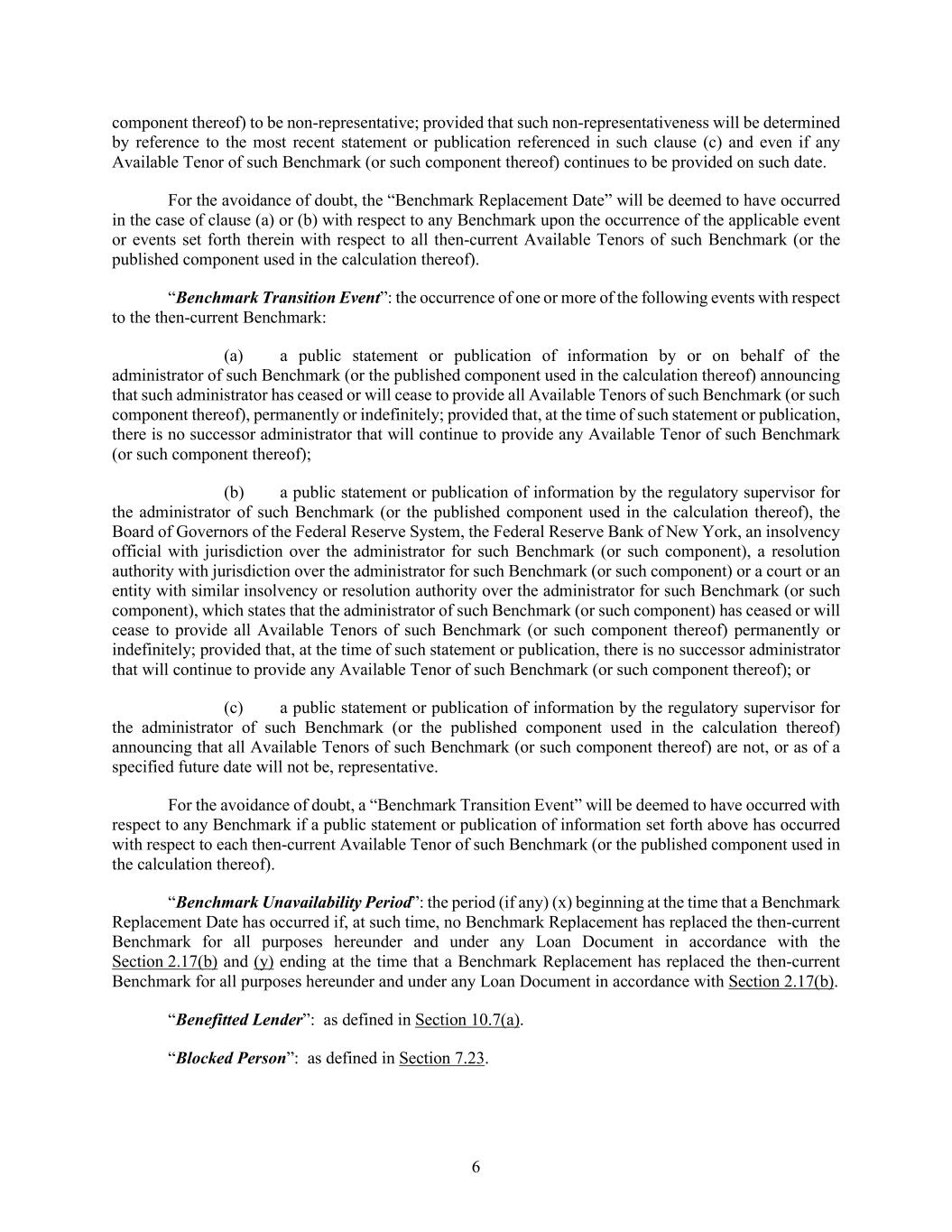 6 component thereof) to be non-representative; provided that such non-representativeness will be determined by reference to the most recent statement or publication referenced in such clause (c) and even if any Available Tenor of such Benchmark (or such component thereof) continues to be provided on such date. For the avoidance of doubt, the “Benchmark Replacement Date” will be deemed to have occurred in the case of clause (a) or (b) with respect to any Benchmark upon the occurrence of the applicable event or events set forth therein with respect to all then-current Available Tenors of such Benchmark (or the published component used in the calculation thereof). “Benchmark Transition Event”: the occurrence of one or more of the following events with respect to the then-current Benchmark: (a) a public statement or publication of information by or on behalf of the administrator of such Benchmark (or the published component used in the calculation thereof) announcing that such administrator has ceased or will cease to provide all Available Tenors of such Benchmark (or such component thereof), permanently or indefinitely; provided that, at the time of such statement or publication, there is no successor administrator that will continue to provide any Available Tenor of such Benchmark (or such component thereof); (b) a public statement or publication of information by the regulatory supervisor for the administrator of such Benchmark (or the published component used in the calculation thereof), the Board of Governors of the Federal Reserve System, the Federal Reserve Bank of New York, an insolvency official with jurisdiction over the administrator for such Benchmark (or such component), a resolution authority with jurisdiction over the administrator for such Benchmark (or such component) or a court or an entity with similar insolvency or resolution authority over the administrator for such Benchmark (or such component), which states that the administrator of such Benchmark (or such component) has ceased or will cease to provide all Available Tenors of such Benchmark (or such component thereof) permanently or indefinitely; provided that, at the time of such statement or publication, there is no successor administrator that will continue to provide any Available Tenor of such Benchmark (or such component thereof); or (c) a public statement or publication of information by the regulatory supervisor for the administrator of such Benchmark (or the published component used in the calculation thereof) announcing that all Available Tenors of such Benchmark (or such component thereof) are not, or as of a specified future date will not be, representative. For the avoidance of doubt, a “Benchmark Transition Event” will be deemed to have occurred with respect to any Benchmark if a public statement or publication of information set forth above has occurred with respect to each then-current Available Tenor of such Benchmark (or the published component used in the calculation thereof). “Benchmark Unavailability Period”: the period (if any) (x) beginning at the time that a Benchmark Replacement Date has occurred if, at such time, no Benchmark Replacement has replaced the then-current Benchmark for all purposes hereunder and under any Loan Document in accordance with the Section 2.17(b) and (y) ending at the time that a Benchmark Replacement has replaced the then-current Benchmark for all purposes hereunder and under any Loan Document in accordance with Section 2.17(b). “Benefitted Lender”: as defined in Section 10.7(a). “Blocked Person”: as defined in Section 7.23.