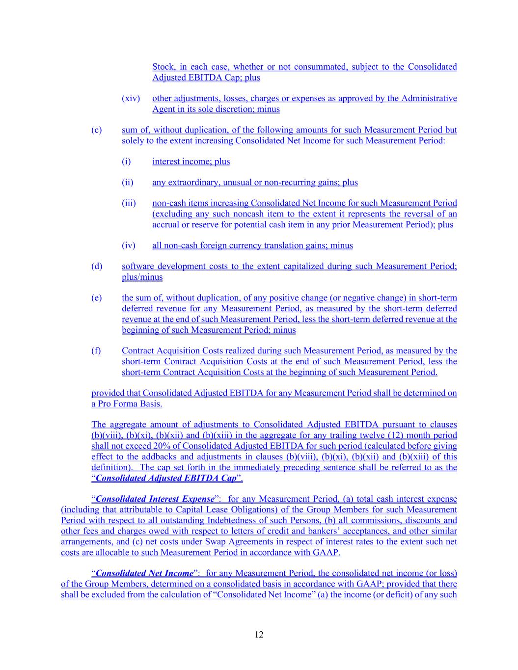 12 Stock, in each case, whether or not consummated, subject to the Consolidated Adjusted EBITDA Cap; plus (xiv) other adjustments, losses, charges or expenses as approved by the Administrative Agent in its sole discretion; minus (c) sum of, without duplication, of the following amounts for such Measurement Period but solely to the extent increasing Consolidated Net Income for such Measurement Period: (i) interest income; plus (ii) any extraordinary, unusual or non-recurring gains; plus (iii) non-cash items increasing Consolidated Net Income for such Measurement Period (excluding any such noncash item to the extent it represents the reversal of an accrual or reserve for potential cash item in any prior Measurement Period); plus (iv) all non-cash foreign currency translation gains; minus (d) software development costs to the extent capitalized during such Measurement Period; plus/minus (e) the sum of, without duplication, of any positive change (or negative change) in short-term deferred revenue for any Measurement Period, as measured by the short-term deferred revenue at the end of such Measurement Period, less the short-term deferred revenue at the beginning of such Measurement Period; minus (f) Contract Acquisition Costs realized during such Measurement Period, as measured by the short-term Contract Acquisition Costs at the end of such Measurement Period, less the short-term Contract Acquisition Costs at the beginning of such Measurement Period. provided that Consolidated Adjusted EBITDA for any Measurement Period shall be determined on a Pro Forma Basis. The aggregate amount of adjustments to Consolidated Adjusted EBITDA pursuant to clauses (b)(viii), (b)(xi), (b)(xii) and (b)(xiii) in the aggregate for any trailing twelve (12) month period shall not exceed 20% of Consolidated Adjusted EBITDA for such period (calculated before giving effect to the addbacks and adjustments in clauses (b)(viii), (b)(xi), (b)(xii) and (b)(xiii) of this definition). The cap set forth in the immediately preceding sentence shall be referred to as the “Consolidated Adjusted EBITDA Cap”. “Consolidated Interest Expense”: for any Measurement Period, (a) total cash interest expense (including that attributable to Capital Lease Obligations) of the Group Members for such Measurement Period with respect to all outstanding Indebtedness of such Persons, (b) all commissions, discounts and other fees and charges owed with respect to letters of credit and bankers’ acceptances, and other similar arrangements, and (c) net costs under Swap Agreements in respect of interest rates to the extent such net costs are allocable to such Measurement Period in accordance with GAAP. “Consolidated Net Income”: for any Measurement Period, the consolidated net income (or loss) of the Group Members, determined on a consolidated basis in accordance with GAAP; provided that there shall be excluded from the calculation of “Consolidated Net Income” (a) the income (or deficit) of any such
