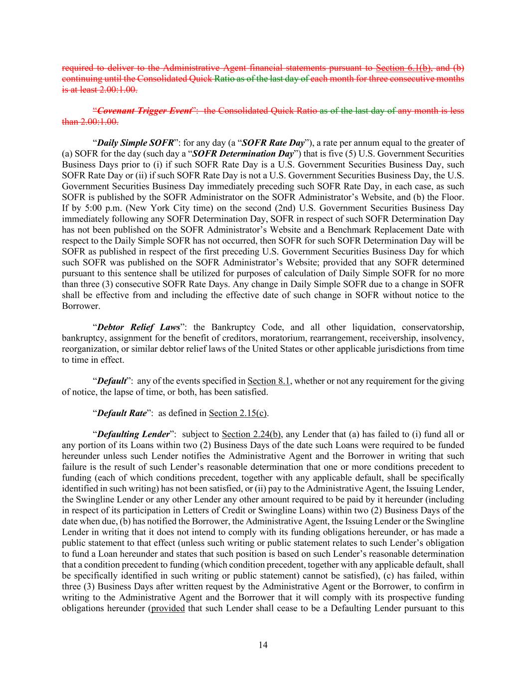 14 required to deliver to the Administrative Agent financial statements pursuant to Section 6.1(b), and (b) continuing until the Consolidated Quick Ratio as of the last day of each month for three consecutive months is at least 2.00:1.00. “Covenant Trigger Event”: the Consolidated Quick Ratio as of the last day of any month is less than 2.00:1.00. “Daily Simple SOFR”: for any day (a “SOFR Rate Day”), a rate per annum equal to the greater of (a) SOFR for the day (such day a “SOFR Determination Day”) that is five (5) U.S. Government Securities Business Days prior to (i) if such SOFR Rate Day is a U.S. Government Securities Business Day, such SOFR Rate Day or (ii) if such SOFR Rate Day is not a U.S. Government Securities Business Day, the U.S. Government Securities Business Day immediately preceding such SOFR Rate Day, in each case, as such SOFR is published by the SOFR Administrator on the SOFR Administrator’s Website, and (b) the Floor. If by 5:00 p.m. (New York City time) on the second (2nd) U.S. Government Securities Business Day immediately following any SOFR Determination Day, SOFR in respect of such SOFR Determination Day has not been published on the SOFR Administrator’s Website and a Benchmark Replacement Date with respect to the Daily Simple SOFR has not occurred, then SOFR for such SOFR Determination Day will be SOFR as published in respect of the first preceding U.S. Government Securities Business Day for which such SOFR was published on the SOFR Administrator’s Website; provided that any SOFR determined pursuant to this sentence shall be utilized for purposes of calculation of Daily Simple SOFR for no more than three (3) consecutive SOFR Rate Days. Any change in Daily Simple SOFR due to a change in SOFR shall be effective from and including the effective date of such change in SOFR without notice to the Borrower. “Debtor Relief Laws”: the Bankruptcy Code, and all other liquidation, conservatorship, bankruptcy, assignment for the benefit of creditors, moratorium, rearrangement, receivership, insolvency, reorganization, or similar debtor relief laws of the United States or other applicable jurisdictions from time to time in effect. “Default”: any of the events specified in Section 8.1, whether or not any requirement for the giving of notice, the lapse of time, or both, has been satisfied. “Default Rate”: as defined in Section 2.15(c). “Defaulting Lender”: subject to Section 2.24(b), any Lender that (a) has failed to (i) fund all or any portion of its Loans within two (2) Business Days of the date such Loans were required to be funded hereunder unless such Lender notifies the Administrative Agent and the Borrower in writing that such failure is the result of such Lender’s reasonable determination that one or more conditions precedent to funding (each of which conditions precedent, together with any applicable default, shall be specifically identified in such writing) has not been satisfied, or (ii) pay to the Administrative Agent, the Issuing Lender, the Swingline Lender or any other Lender any other amount required to be paid by it hereunder (including in respect of its participation in Letters of Credit or Swingline Loans) within two (2) Business Days of the date when due, (b) has notified the Borrower, the Administrative Agent, the Issuing Lender or the Swingline Lender in writing that it does not intend to comply with its funding obligations hereunder, or has made a public statement to that effect (unless such writing or public statement relates to such Lender’s obligation to fund a Loan hereunder and states that such position is based on such Lender’s reasonable determination that a condition precedent to funding (which condition precedent, together with any applicable default, shall be specifically identified in such writing or public statement) cannot be satisfied), (c) has failed, within three (3) Business Days after written request by the Administrative Agent or the Borrower, to confirm in writing to the Administrative Agent and the Borrower that it will comply with its prospective funding obligations hereunder (provided that such Lender shall cease to be a Defaulting Lender pursuant to this