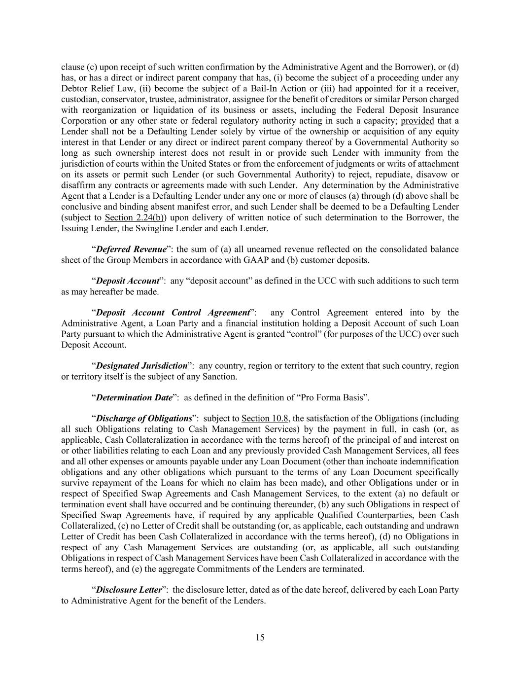 15 clause (c) upon receipt of such written confirmation by the Administrative Agent and the Borrower), or (d) has, or has a direct or indirect parent company that has, (i) become the subject of a proceeding under any Debtor Relief Law, (ii) become the subject of a Bail-In Action or (iii) had appointed for it a receiver, custodian, conservator, trustee, administrator, assignee for the benefit of creditors or similar Person charged with reorganization or liquidation of its business or assets, including the Federal Deposit Insurance Corporation or any other state or federal regulatory authority acting in such a capacity; provided that a Lender shall not be a Defaulting Lender solely by virtue of the ownership or acquisition of any equity interest in that Lender or any direct or indirect parent company thereof by a Governmental Authority so long as such ownership interest does not result in or provide such Lender with immunity from the jurisdiction of courts within the United States or from the enforcement of judgments or writs of attachment on its assets or permit such Lender (or such Governmental Authority) to reject, repudiate, disavow or disaffirm any contracts or agreements made with such Lender. Any determination by the Administrative Agent that a Lender is a Defaulting Lender under any one or more of clauses (a) through (d) above shall be conclusive and binding absent manifest error, and such Lender shall be deemed to be a Defaulting Lender (subject to Section 2.24(b)) upon delivery of written notice of such determination to the Borrower, the Issuing Lender, the Swingline Lender and each Lender. “Deferred Revenue”: the sum of (a) all unearned revenue reflected on the consolidated balance sheet of the Group Members in accordance with GAAP and (b) customer deposits. “Deposit Account”: any “deposit account” as defined in the UCC with such additions to such term as may hereafter be made. “Deposit Account Control Agreement”: any Control Agreement entered into by the Administrative Agent, a Loan Party and a financial institution holding a Deposit Account of such Loan Party pursuant to which the Administrative Agent is granted “control” (for purposes of the UCC) over such Deposit Account. “Designated Jurisdiction”: any country, region or territory to the extent that such country, region or territory itself is the subject of any Sanction. “Determination Date”: as defined in the definition of “Pro Forma Basis”. “Discharge of Obligations”: subject to Section 10.8, the satisfaction of the Obligations (including all such Obligations relating to Cash Management Services) by the payment in full, in cash (or, as applicable, Cash Collateralization in accordance with the terms hereof) of the principal of and interest on or other liabilities relating to each Loan and any previously provided Cash Management Services, all fees and all other expenses or amounts payable under any Loan Document (other than inchoate indemnification obligations and any other obligations which pursuant to the terms of any Loan Document specifically survive repayment of the Loans for which no claim has been made), and other Obligations under or in respect of Specified Swap Agreements and Cash Management Services, to the extent (a) no default or termination event shall have occurred and be continuing thereunder, (b) any such Obligations in respect of Specified Swap Agreements have, if required by any applicable Qualified Counterparties, been Cash Collateralized, (c) no Letter of Credit shall be outstanding (or, as applicable, each outstanding and undrawn Letter of Credit has been Cash Collateralized in accordance with the terms hereof), (d) no Obligations in respect of any Cash Management Services are outstanding (or, as applicable, all such outstanding Obligations in respect of Cash Management Services have been Cash Collateralized in accordance with the terms hereof), and (e) the aggregate Commitments of the Lenders are terminated. “Disclosure Letter”: the disclosure letter, dated as of the date hereof, delivered by each Loan Party to Administrative Agent for the benefit of the Lenders.