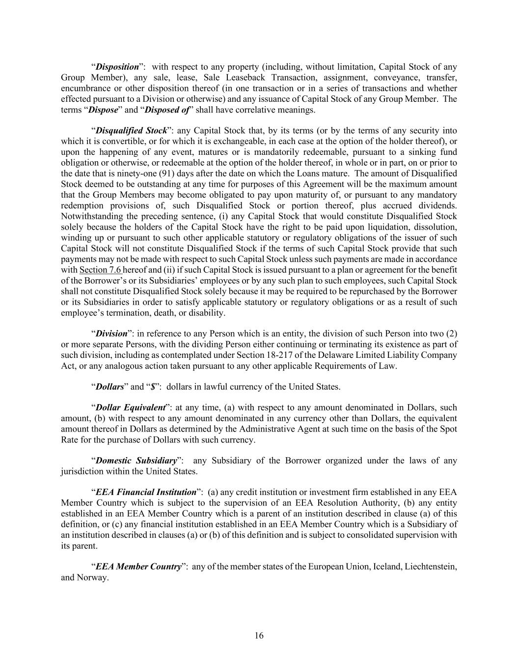 16 “Disposition”: with respect to any property (including, without limitation, Capital Stock of any Group Member), any sale, lease, Sale Leaseback Transaction, assignment, conveyance, transfer, encumbrance or other disposition thereof (in one transaction or in a series of transactions and whether effected pursuant to a Division or otherwise) and any issuance of Capital Stock of any Group Member. The terms “Dispose” and “Disposed of” shall have correlative meanings. “Disqualified Stock”: any Capital Stock that, by its terms (or by the terms of any security into which it is convertible, or for which it is exchangeable, in each case at the option of the holder thereof), or upon the happening of any event, matures or is mandatorily redeemable, pursuant to a sinking fund obligation or otherwise, or redeemable at the option of the holder thereof, in whole or in part, on or prior to the date that is ninety-one (91) days after the date on which the Loans mature. The amount of Disqualified Stock deemed to be outstanding at any time for purposes of this Agreement will be the maximum amount that the Group Members may become obligated to pay upon maturity of, or pursuant to any mandatory redemption provisions of, such Disqualified Stock or portion thereof, plus accrued dividends. Notwithstanding the preceding sentence, (i) any Capital Stock that would constitute Disqualified Stock solely because the holders of the Capital Stock have the right to be paid upon liquidation, dissolution, winding up or pursuant to such other applicable statutory or regulatory obligations of the issuer of such Capital Stock will not constitute Disqualified Stock if the terms of such Capital Stock provide that such payments may not be made with respect to such Capital Stock unless such payments are made in accordance with Section 7.6 hereof and (ii) if such Capital Stock is issued pursuant to a plan or agreement for the benefit of the Borrower’s or its Subsidiaries’ employees or by any such plan to such employees, such Capital Stock shall not constitute Disqualified Stock solely because it may be required to be repurchased by the Borrower or its Subsidiaries in order to satisfy applicable statutory or regulatory obligations or as a result of such employee’s termination, death, or disability. “Division”: in reference to any Person which is an entity, the division of such Person into two (2) or more separate Persons, with the dividing Person either continuing or terminating its existence as part of such division, including as contemplated under Section 18-217 of the Delaware Limited Liability Company Act, or any analogous action taken pursuant to any other applicable Requirements of Law. “Dollars” and “$”: dollars in lawful currency of the United States. “Dollar Equivalent”: at any time, (a) with respect to any amount denominated in Dollars, such amount, (b) with respect to any amount denominated in any currency other than Dollars, the equivalent amount thereof in Dollars as determined by the Administrative Agent at such time on the basis of the Spot Rate for the purchase of Dollars with such currency. “Domestic Subsidiary”: any Subsidiary of the Borrower organized under the laws of any jurisdiction within the United States. “EEA Financial Institution”: (a) any credit institution or investment firm established in any EEA Member Country which is subject to the supervision of an EEA Resolution Authority, (b) any entity established in an EEA Member Country which is a parent of an institution described in clause (a) of this definition, or (c) any financial institution established in an EEA Member Country which is a Subsidiary of an institution described in clauses (a) or (b) of this definition and is subject to consolidated supervision with its parent. “EEA Member Country”: any of the member states of the European Union, Iceland, Liechtenstein, and Norway.