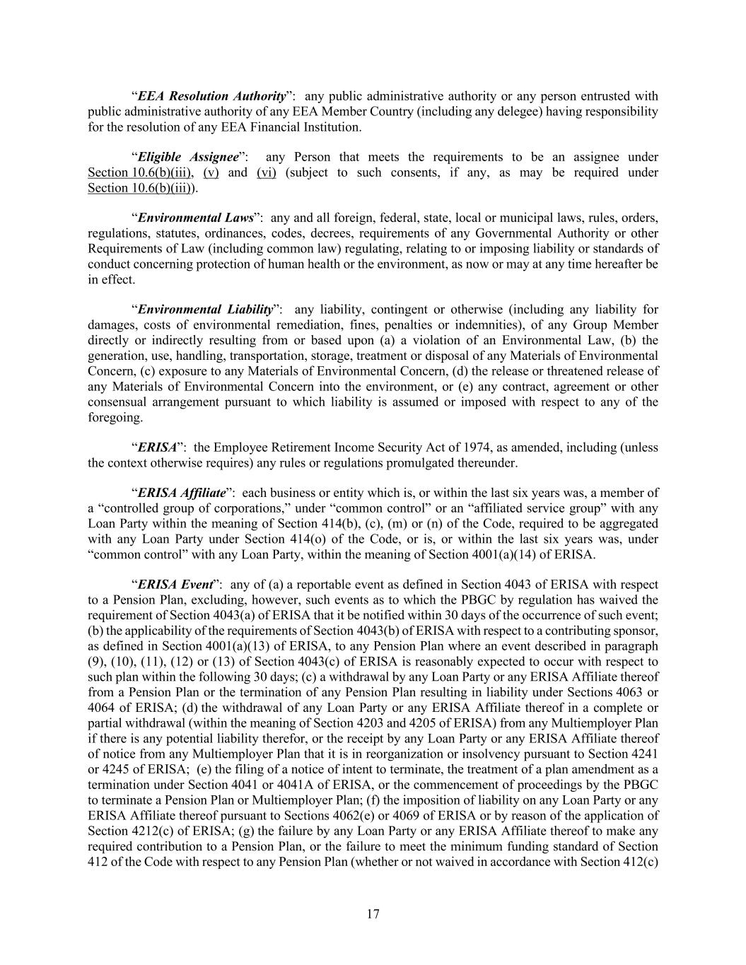 17 “EEA Resolution Authority”: any public administrative authority or any person entrusted with public administrative authority of any EEA Member Country (including any delegee) having responsibility for the resolution of any EEA Financial Institution. “Eligible Assignee”: any Person that meets the requirements to be an assignee under Section 10.6(b)(iii), (v) and (vi) (subject to such consents, if any, as may be required under Section 10.6(b)(iii)). “Environmental Laws”: any and all foreign, federal, state, local or municipal laws, rules, orders, regulations, statutes, ordinances, codes, decrees, requirements of any Governmental Authority or other Requirements of Law (including common law) regulating, relating to or imposing liability or standards of conduct concerning protection of human health or the environment, as now or may at any time hereafter be in effect. “Environmental Liability”: any liability, contingent or otherwise (including any liability for damages, costs of environmental remediation, fines, penalties or indemnities), of any Group Member directly or indirectly resulting from or based upon (a) a violation of an Environmental Law, (b) the generation, use, handling, transportation, storage, treatment or disposal of any Materials of Environmental Concern, (c) exposure to any Materials of Environmental Concern, (d) the release or threatened release of any Materials of Environmental Concern into the environment, or (e) any contract, agreement or other consensual arrangement pursuant to which liability is assumed or imposed with respect to any of the foregoing. “ERISA”: the Employee Retirement Income Security Act of 1974, as amended, including (unless the context otherwise requires) any rules or regulations promulgated thereunder. “ERISA Affiliate”: each business or entity which is, or within the last six years was, a member of a “controlled group of corporations,” under “common control” or an “affiliated service group” with any Loan Party within the meaning of Section 414(b), (c), (m) or (n) of the Code, required to be aggregated with any Loan Party under Section 414(o) of the Code, or is, or within the last six years was, under “common control” with any Loan Party, within the meaning of Section 4001(a)(14) of ERISA. “ERISA Event”: any of (a) a reportable event as defined in Section 4043 of ERISA with respect to a Pension Plan, excluding, however, such events as to which the PBGC by regulation has waived the requirement of Section 4043(a) of ERISA that it be notified within 30 days of the occurrence of such event; (b) the applicability of the requirements of Section 4043(b) of ERISA with respect to a contributing sponsor, as defined in Section 4001(a)(13) of ERISA, to any Pension Plan where an event described in paragraph (9), (10), (11), (12) or (13) of Section 4043(c) of ERISA is reasonably expected to occur with respect to such plan within the following 30 days; (c) a withdrawal by any Loan Party or any ERISA Affiliate thereof from a Pension Plan or the termination of any Pension Plan resulting in liability under Sections 4063 or 4064 of ERISA; (d) the withdrawal of any Loan Party or any ERISA Affiliate thereof in a complete or partial withdrawal (within the meaning of Section 4203 and 4205 of ERISA) from any Multiemployer Plan if there is any potential liability therefor, or the receipt by any Loan Party or any ERISA Affiliate thereof of notice from any Multiemployer Plan that it is in reorganization or insolvency pursuant to Section 4241 or 4245 of ERISA; (e) the filing of a notice of intent to terminate, the treatment of a plan amendment as a termination under Section 4041 or 4041A of ERISA, or the commencement of proceedings by the PBGC to terminate a Pension Plan or Multiemployer Plan; (f) the imposition of liability on any Loan Party or any ERISA Affiliate thereof pursuant to Sections 4062(e) or 4069 of ERISA or by reason of the application of Section 4212(c) of ERISA; (g) the failure by any Loan Party or any ERISA Affiliate thereof to make any required contribution to a Pension Plan, or the failure to meet the minimum funding standard of Section 412 of the Code with respect to any Pension Plan (whether or not waived in accordance with Section 412(c)