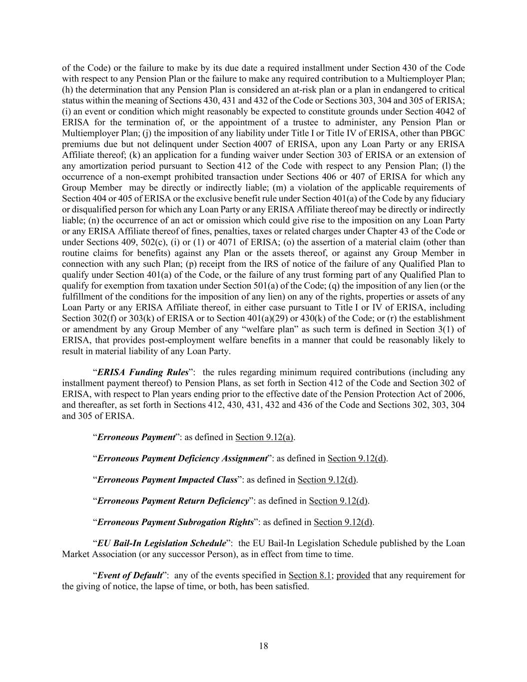 18 of the Code) or the failure to make by its due date a required installment under Section 430 of the Code with respect to any Pension Plan or the failure to make any required contribution to a Multiemployer Plan; (h) the determination that any Pension Plan is considered an at-risk plan or a plan in endangered to critical status within the meaning of Sections 430, 431 and 432 of the Code or Sections 303, 304 and 305 of ERISA; (i) an event or condition which might reasonably be expected to constitute grounds under Section 4042 of ERISA for the termination of, or the appointment of a trustee to administer, any Pension Plan or Multiemployer Plan; (j) the imposition of any liability under Title I or Title IV of ERISA, other than PBGC premiums due but not delinquent under Section 4007 of ERISA, upon any Loan Party or any ERISA Affiliate thereof; (k) an application for a funding waiver under Section 303 of ERISA or an extension of any amortization period pursuant to Section 412 of the Code with respect to any Pension Plan; (l) the occurrence of a non-exempt prohibited transaction under Sections 406 or 407 of ERISA for which any Group Member may be directly or indirectly liable; (m) a violation of the applicable requirements of Section 404 or 405 of ERISA or the exclusive benefit rule under Section 401(a) of the Code by any fiduciary or disqualified person for which any Loan Party or any ERISA Affiliate thereof may be directly or indirectly liable; (n) the occurrence of an act or omission which could give rise to the imposition on any Loan Party or any ERISA Affiliate thereof of fines, penalties, taxes or related charges under Chapter 43 of the Code or under Sections 409, 502(c), (i) or (1) or 4071 of ERISA; (o) the assertion of a material claim (other than routine claims for benefits) against any Plan or the assets thereof, or against any Group Member in connection with any such Plan; (p) receipt from the IRS of notice of the failure of any Qualified Plan to qualify under Section 401(a) of the Code, or the failure of any trust forming part of any Qualified Plan to qualify for exemption from taxation under Section 501(a) of the Code; (q) the imposition of any lien (or the fulfillment of the conditions for the imposition of any lien) on any of the rights, properties or assets of any Loan Party or any ERISA Affiliate thereof, in either case pursuant to Title I or IV of ERISA, including Section 302(f) or 303(k) of ERISA or to Section 401(a)(29) or 430(k) of the Code; or (r) the establishment or amendment by any Group Member of any “welfare plan” as such term is defined in Section 3(1) of ERISA, that provides post-employment welfare benefits in a manner that could be reasonably likely to result in material liability of any Loan Party. “ERISA Funding Rules”: the rules regarding minimum required contributions (including any installment payment thereof) to Pension Plans, as set forth in Section 412 of the Code and Section 302 of ERISA, with respect to Plan years ending prior to the effective date of the Pension Protection Act of 2006, and thereafter, as set forth in Sections 412, 430, 431, 432 and 436 of the Code and Sections 302, 303, 304 and 305 of ERISA. “Erroneous Payment”: as defined in Section 9.12(a). “Erroneous Payment Deficiency Assignment”: as defined in Section 9.12(d). “Erroneous Payment Impacted Class”: as defined in Section 9.12(d). “Erroneous Payment Return Deficiency”: as defined in Section 9.12(d). “Erroneous Payment Subrogation Rights”: as defined in Section 9.12(d). “EU Bail-In Legislation Schedule”: the EU Bail-In Legislation Schedule published by the Loan Market Association (or any successor Person), as in effect from time to time. “Event of Default”: any of the events specified in Section 8.1; provided that any requirement for the giving of notice, the lapse of time, or both, has been satisfied.