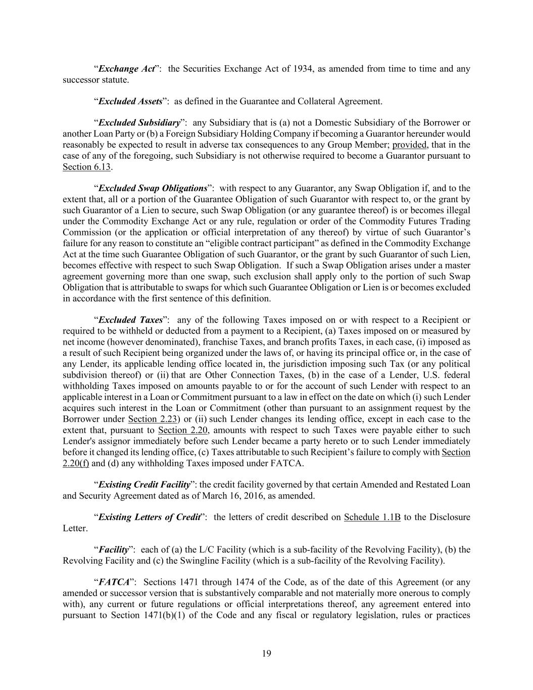 19 “Exchange Act”: the Securities Exchange Act of 1934, as amended from time to time and any successor statute. “Excluded Assets”: as defined in the Guarantee and Collateral Agreement. “Excluded Subsidiary”: any Subsidiary that is (a) not a Domestic Subsidiary of the Borrower or another Loan Party or (b) a Foreign Subsidiary Holding Company if becoming a Guarantor hereunder would reasonably be expected to result in adverse tax consequences to any Group Member; provided, that in the case of any of the foregoing, such Subsidiary is not otherwise required to become a Guarantor pursuant to Section 6.13. “Excluded Swap Obligations”: with respect to any Guarantor, any Swap Obligation if, and to the extent that, all or a portion of the Guarantee Obligation of such Guarantor with respect to, or the grant by such Guarantor of a Lien to secure, such Swap Obligation (or any guarantee thereof) is or becomes illegal under the Commodity Exchange Act or any rule, regulation or order of the Commodity Futures Trading Commission (or the application or official interpretation of any thereof) by virtue of such Guarantor’s failure for any reason to constitute an “eligible contract participant” as defined in the Commodity Exchange Act at the time such Guarantee Obligation of such Guarantor, or the grant by such Guarantor of such Lien, becomes effective with respect to such Swap Obligation. If such a Swap Obligation arises under a master agreement governing more than one swap, such exclusion shall apply only to the portion of such Swap Obligation that is attributable to swaps for which such Guarantee Obligation or Lien is or becomes excluded in accordance with the first sentence of this definition. “Excluded Taxes”: any of the following Taxes imposed on or with respect to a Recipient or required to be withheld or deducted from a payment to a Recipient, (a) Taxes imposed on or measured by net income (however denominated), franchise Taxes, and branch profits Taxes, in each case, (i) imposed as a result of such Recipient being organized under the laws of, or having its principal office or, in the case of any Lender, its applicable lending office located in, the jurisdiction imposing such Tax (or any political subdivision thereof) or (ii) that are Other Connection Taxes, (b) in the case of a Lender, U.S. federal withholding Taxes imposed on amounts payable to or for the account of such Lender with respect to an applicable interest in a Loan or Commitment pursuant to a law in effect on the date on which (i) such Lender acquires such interest in the Loan or Commitment (other than pursuant to an assignment request by the Borrower under Section 2.23) or (ii) such Lender changes its lending office, except in each case to the extent that, pursuant to Section 2.20, amounts with respect to such Taxes were payable either to such Lender's assignor immediately before such Lender became a party hereto or to such Lender immediately before it changed its lending office, (c) Taxes attributable to such Recipient’s failure to comply with Section 2.20(f) and (d) any withholding Taxes imposed under FATCA. “Existing Credit Facility”: the credit facility governed by that certain Amended and Restated Loan and Security Agreement dated as of March 16, 2016, as amended. “Existing Letters of Credit”: the letters of credit described on Schedule 1.1B to the Disclosure Letter. “Facility”: each of (a) the L/C Facility (which is a sub-facility of the Revolving Facility), (b) the Revolving Facility and (c) the Swingline Facility (which is a sub-facility of the Revolving Facility). “FATCA”: Sections 1471 through 1474 of the Code, as of the date of this Agreement (or any amended or successor version that is substantively comparable and not materially more onerous to comply with), any current or future regulations or official interpretations thereof, any agreement entered into pursuant to Section 1471(b)(1) of the Code and any fiscal or regulatory legislation, rules or practices