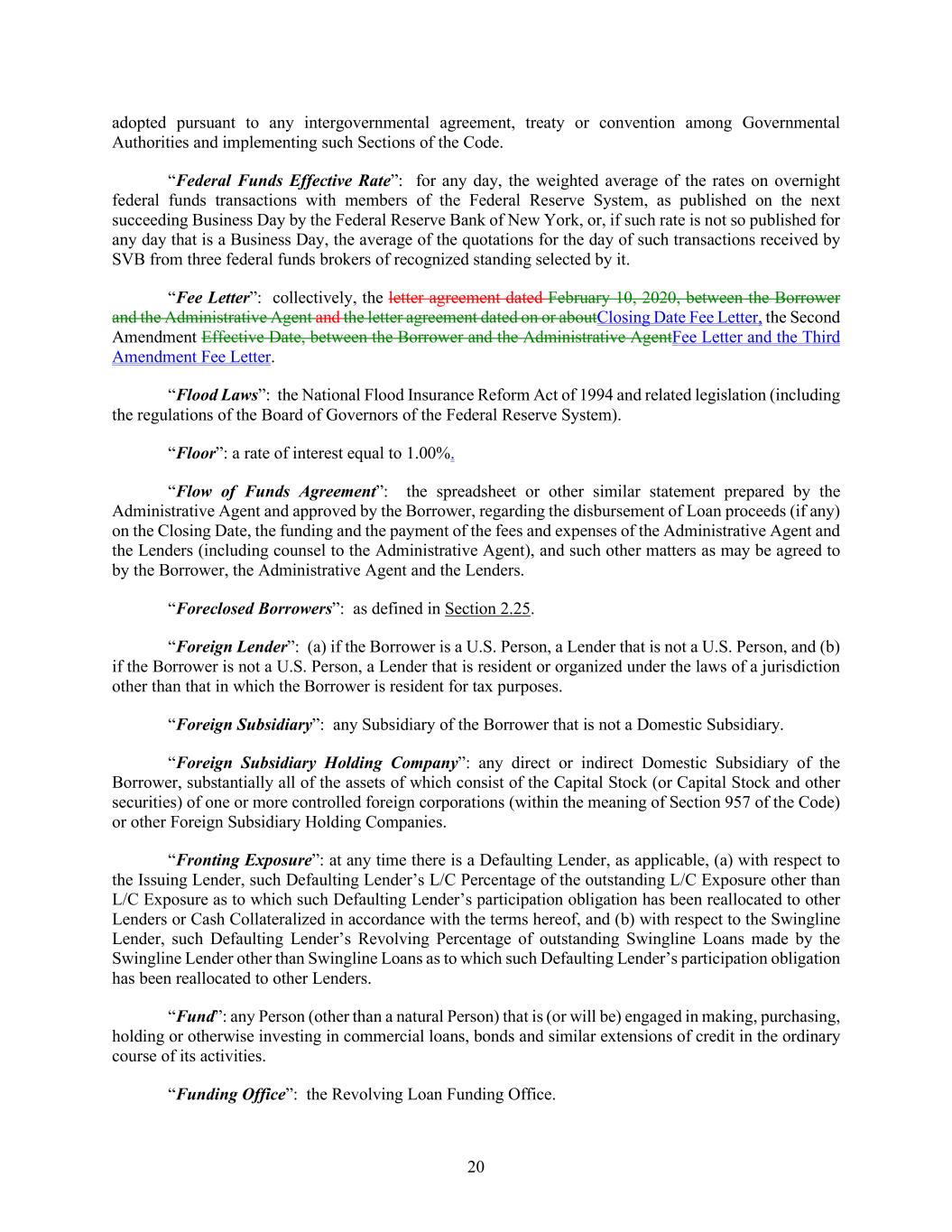 20 adopted pursuant to any intergovernmental agreement, treaty or convention among Governmental Authorities and implementing such Sections of the Code. “Federal Funds Effective Rate”: for any day, the weighted average of the rates on overnight federal funds transactions with members of the Federal Reserve System, as published on the next succeeding Business Day by the Federal Reserve Bank of New York, or, if such rate is not so published for any day that is a Business Day, the average of the quotations for the day of such transactions received by SVB from three federal funds brokers of recognized standing selected by it. “Fee Letter”: collectively, the letter agreement dated February 10, 2020, between the Borrower and the Administrative Agent and the letter agreement dated on or aboutClosing Date Fee Letter, the Second Amendment Effective Date, between the Borrower and the Administrative AgentFee Letter and the Third Amendment Fee Letter. “Flood Laws”: the National Flood Insurance Reform Act of 1994 and related legislation (including the regulations of the Board of Governors of the Federal Reserve System). “Floor”: a rate of interest equal to 1.00%. “Flow of Funds Agreement”: the spreadsheet or other similar statement prepared by the Administrative Agent and approved by the Borrower, regarding the disbursement of Loan proceeds (if any) on the Closing Date, the funding and the payment of the fees and expenses of the Administrative Agent and the Lenders (including counsel to the Administrative Agent), and such other matters as may be agreed to by the Borrower, the Administrative Agent and the Lenders. “Foreclosed Borrowers”: as defined in Section 2.25. “Foreign Lender”: (a) if the Borrower is a U.S. Person, a Lender that is not a U.S. Person, and (b) if the Borrower is not a U.S. Person, a Lender that is resident or organized under the laws of a jurisdiction other than that in which the Borrower is resident for tax purposes. “Foreign Subsidiary”: any Subsidiary of the Borrower that is not a Domestic Subsidiary. “Foreign Subsidiary Holding Company”: any direct or indirect Domestic Subsidiary of the Borrower, substantially all of the assets of which consist of the Capital Stock (or Capital Stock and other securities) of one or more controlled foreign corporations (within the meaning of Section 957 of the Code) or other Foreign Subsidiary Holding Companies. “Fronting Exposure”: at any time there is a Defaulting Lender, as applicable, (a) with respect to the Issuing Lender, such Defaulting Lender’s L/C Percentage of the outstanding L/C Exposure other than L/C Exposure as to which such Defaulting Lender’s participation obligation has been reallocated to other Lenders or Cash Collateralized in accordance with the terms hereof, and (b) with respect to the Swingline Lender, such Defaulting Lender’s Revolving Percentage of outstanding Swingline Loans made by the Swingline Lender other than Swingline Loans as to which such Defaulting Lender’s participation obligation has been reallocated to other Lenders. “Fund”: any Person (other than a natural Person) that is (or will be) engaged in making, purchasing, holding or otherwise investing in commercial loans, bonds and similar extensions of credit in the ordinary course of its activities. “Funding Office”: the Revolving Loan Funding Office.
