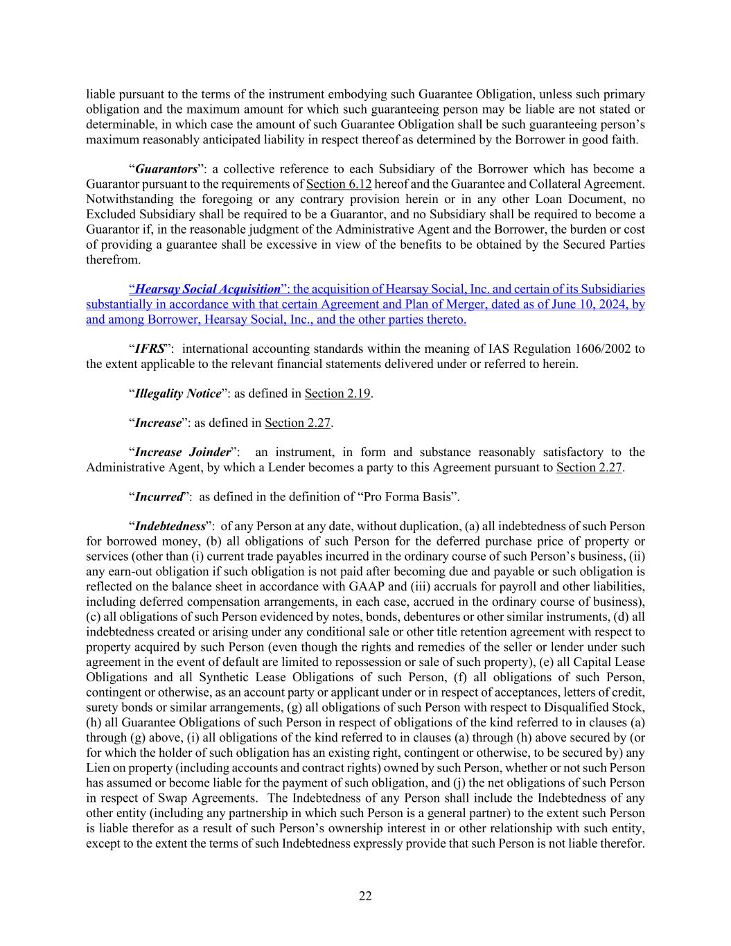 22 liable pursuant to the terms of the instrument embodying such Guarantee Obligation, unless such primary obligation and the maximum amount for which such guaranteeing person may be liable are not stated or determinable, in which case the amount of such Guarantee Obligation shall be such guaranteeing person’s maximum reasonably anticipated liability in respect thereof as determined by the Borrower in good faith. “Guarantors”: a collective reference to each Subsidiary of the Borrower which has become a Guarantor pursuant to the requirements of Section 6.12 hereof and the Guarantee and Collateral Agreement. Notwithstanding the foregoing or any contrary provision herein or in any other Loan Document, no Excluded Subsidiary shall be required to be a Guarantor, and no Subsidiary shall be required to become a Guarantor if, in the reasonable judgment of the Administrative Agent and the Borrower, the burden or cost of providing a guarantee shall be excessive in view of the benefits to be obtained by the Secured Parties therefrom. “Hearsay Social Acquisition”: the acquisition of Hearsay Social, Inc. and certain of its Subsidiaries substantially in accordance with that certain Agreement and Plan of Merger, dated as of June 10, 2024, by and among Borrower, Hearsay Social, Inc., and the other parties thereto. “IFRS”: international accounting standards within the meaning of IAS Regulation 1606/2002 to the extent applicable to the relevant financial statements delivered under or referred to herein. “Illegality Notice”: as defined in Section 2.19. “Increase”: as defined in Section 2.27. “Increase Joinder”: an instrument, in form and substance reasonably satisfactory to the Administrative Agent, by which a Lender becomes a party to this Agreement pursuant to Section 2.27. “Incurred”: as defined in the definition of “Pro Forma Basis”. “Indebtedness”: of any Person at any date, without duplication, (a) all indebtedness of such Person for borrowed money, (b) all obligations of such Person for the deferred purchase price of property or services (other than (i) current trade payables incurred in the ordinary course of such Person’s business, (ii) any earn-out obligation if such obligation is not paid after becoming due and payable or such obligation is reflected on the balance sheet in accordance with GAAP and (iii) accruals for payroll and other liabilities, including deferred compensation arrangements, in each case, accrued in the ordinary course of business), (c) all obligations of such Person evidenced by notes, bonds, debentures or other similar instruments, (d) all indebtedness created or arising under any conditional sale or other title retention agreement with respect to property acquired by such Person (even though the rights and remedies of the seller or lender under such agreement in the event of default are limited to repossession or sale of such property), (e) all Capital Lease Obligations and all Synthetic Lease Obligations of such Person, (f) all obligations of such Person, contingent or otherwise, as an account party or applicant under or in respect of acceptances, letters of credit, surety bonds or similar arrangements, (g) all obligations of such Person with respect to Disqualified Stock, (h) all Guarantee Obligations of such Person in respect of obligations of the kind referred to in clauses (a) through (g) above, (i) all obligations of the kind referred to in clauses (a) through (h) above secured by (or for which the holder of such obligation has an existing right, contingent or otherwise, to be secured by) any Lien on property (including accounts and contract rights) owned by such Person, whether or not such Person has assumed or become liable for the payment of such obligation, and (j) the net obligations of such Person in respect of Swap Agreements. The Indebtedness of any Person shall include the Indebtedness of any other entity (including any partnership in which such Person is a general partner) to the extent such Person is liable therefor as a result of such Person’s ownership interest in or other relationship with such entity, except to the extent the terms of such Indebtedness expressly provide that such Person is not liable therefor.