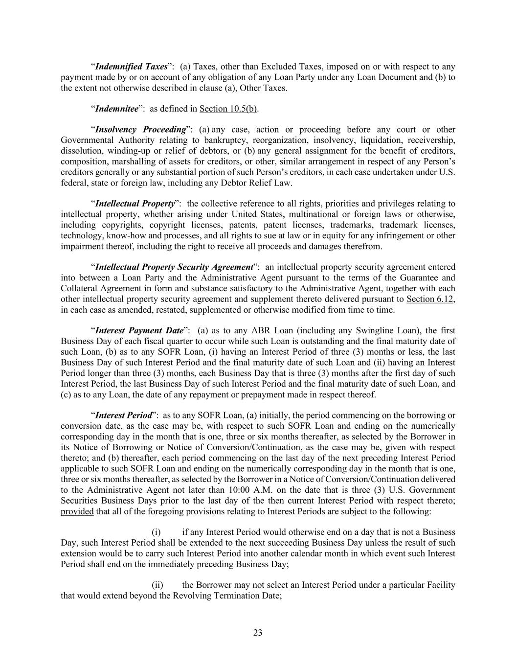 23 “Indemnified Taxes”: (a) Taxes, other than Excluded Taxes, imposed on or with respect to any payment made by or on account of any obligation of any Loan Party under any Loan Document and (b) to the extent not otherwise described in clause (a), Other Taxes. “Indemnitee”: as defined in Section 10.5(b). “Insolvency Proceeding”: (a) any case, action or proceeding before any court or other Governmental Authority relating to bankruptcy, reorganization, insolvency, liquidation, receivership, dissolution, winding-up or relief of debtors, or (b) any general assignment for the benefit of creditors, composition, marshalling of assets for creditors, or other, similar arrangement in respect of any Person’s creditors generally or any substantial portion of such Person’s creditors, in each case undertaken under U.S. federal, state or foreign law, including any Debtor Relief Law. “Intellectual Property”: the collective reference to all rights, priorities and privileges relating to intellectual property, whether arising under United States, multinational or foreign laws or otherwise, including copyrights, copyright licenses, patents, patent licenses, trademarks, trademark licenses, technology, know-how and processes, and all rights to sue at law or in equity for any infringement or other impairment thereof, including the right to receive all proceeds and damages therefrom. “Intellectual Property Security Agreement”: an intellectual property security agreement entered into between a Loan Party and the Administrative Agent pursuant to the terms of the Guarantee and Collateral Agreement in form and substance satisfactory to the Administrative Agent, together with each other intellectual property security agreement and supplement thereto delivered pursuant to Section 6.12, in each case as amended, restated, supplemented or otherwise modified from time to time. “Interest Payment Date”: (a) as to any ABR Loan (including any Swingline Loan), the first Business Day of each fiscal quarter to occur while such Loan is outstanding and the final maturity date of such Loan, (b) as to any SOFR Loan, (i) having an Interest Period of three (3) months or less, the last Business Day of such Interest Period and the final maturity date of such Loan and (ii) having an Interest Period longer than three (3) months, each Business Day that is three (3) months after the first day of such Interest Period, the last Business Day of such Interest Period and the final maturity date of such Loan, and (c) as to any Loan, the date of any repayment or prepayment made in respect thereof. “Interest Period”: as to any SOFR Loan, (a) initially, the period commencing on the borrowing or conversion date, as the case may be, with respect to such SOFR Loan and ending on the numerically corresponding day in the month that is one, three or six months thereafter, as selected by the Borrower in its Notice of Borrowing or Notice of Conversion/Continuation, as the case may be, given with respect thereto; and (b) thereafter, each period commencing on the last day of the next preceding Interest Period applicable to such SOFR Loan and ending on the numerically corresponding day in the month that is one, three or six months thereafter, as selected by the Borrower in a Notice of Conversion/Continuation delivered to the Administrative Agent not later than 10:00 A.M. on the date that is three (3) U.S. Government Securities Business Days prior to the last day of the then current Interest Period with respect thereto; provided that all of the foregoing provisions relating to Interest Periods are subject to the following: (i) if any Interest Period would otherwise end on a day that is not a Business Day, such Interest Period shall be extended to the next succeeding Business Day unless the result of such extension would be to carry such Interest Period into another calendar month in which event such Interest Period shall end on the immediately preceding Business Day; (ii) the Borrower may not select an Interest Period under a particular Facility that would extend beyond the Revolving Termination Date;