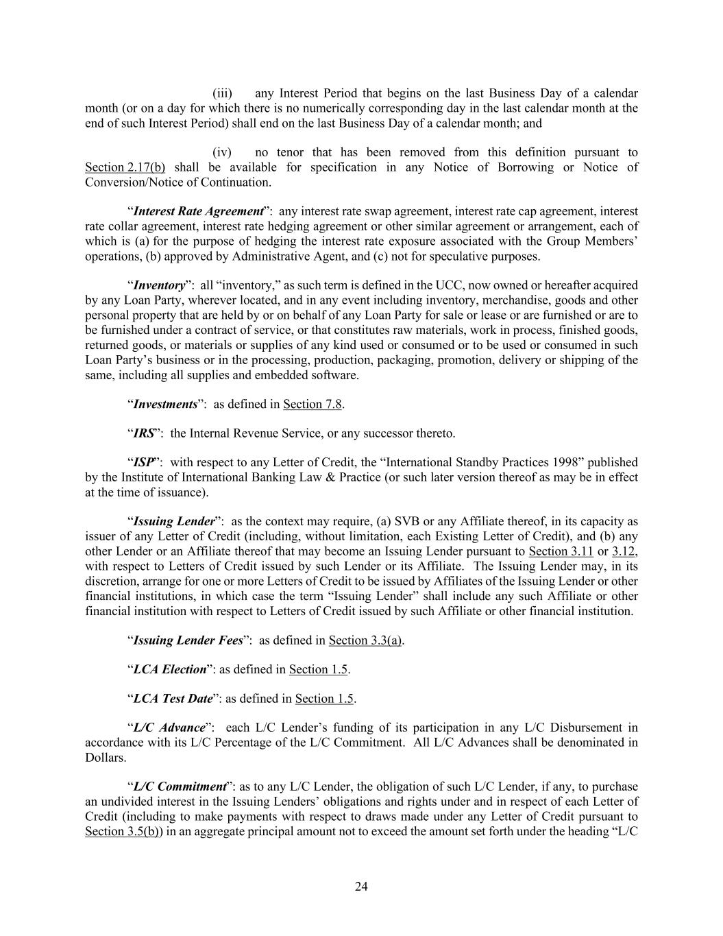 24 (iii) any Interest Period that begins on the last Business Day of a calendar month (or on a day for which there is no numerically corresponding day in the last calendar month at the end of such Interest Period) shall end on the last Business Day of a calendar month; and (iv) no tenor that has been removed from this definition pursuant to Section 2.17(b) shall be available for specification in any Notice of Borrowing or Notice of Conversion/Notice of Continuation. “Interest Rate Agreement”: any interest rate swap agreement, interest rate cap agreement, interest rate collar agreement, interest rate hedging agreement or other similar agreement or arrangement, each of which is (a) for the purpose of hedging the interest rate exposure associated with the Group Members’ operations, (b) approved by Administrative Agent, and (c) not for speculative purposes. “Inventory”: all “inventory,” as such term is defined in the UCC, now owned or hereafter acquired by any Loan Party, wherever located, and in any event including inventory, merchandise, goods and other personal property that are held by or on behalf of any Loan Party for sale or lease or are furnished or are to be furnished under a contract of service, or that constitutes raw materials, work in process, finished goods, returned goods, or materials or supplies of any kind used or consumed or to be used or consumed in such Loan Party’s business or in the processing, production, packaging, promotion, delivery or shipping of the same, including all supplies and embedded software. “Investments”: as defined in Section 7.8. “IRS”: the Internal Revenue Service, or any successor thereto. “ISP”: with respect to any Letter of Credit, the “International Standby Practices 1998” published by the Institute of International Banking Law & Practice (or such later version thereof as may be in effect at the time of issuance). “Issuing Lender”: as the context may require, (a) SVB or any Affiliate thereof, in its capacity as issuer of any Letter of Credit (including, without limitation, each Existing Letter of Credit), and (b) any other Lender or an Affiliate thereof that may become an Issuing Lender pursuant to Section 3.11 or 3.12, with respect to Letters of Credit issued by such Lender or its Affiliate. The Issuing Lender may, in its discretion, arrange for one or more Letters of Credit to be issued by Affiliates of the Issuing Lender or other financial institutions, in which case the term “Issuing Lender” shall include any such Affiliate or other financial institution with respect to Letters of Credit issued by such Affiliate or other financial institution. “Issuing Lender Fees”: as defined in Section 3.3(a). “LCA Election”: as defined in Section 1.5. “LCA Test Date”: as defined in Section 1.5. “L/C Advance”: each L/C Lender’s funding of its participation in any L/C Disbursement in accordance with its L/C Percentage of the L/C Commitment. All L/C Advances shall be denominated in Dollars. “L/C Commitment”: as to any L/C Lender, the obligation of such L/C Lender, if any, to purchase an undivided interest in the Issuing Lenders’ obligations and rights under and in respect of each Letter of Credit (including to make payments with respect to draws made under any Letter of Credit pursuant to Section 3.5(b)) in an aggregate principal amount not to exceed the amount set forth under the heading “L/C