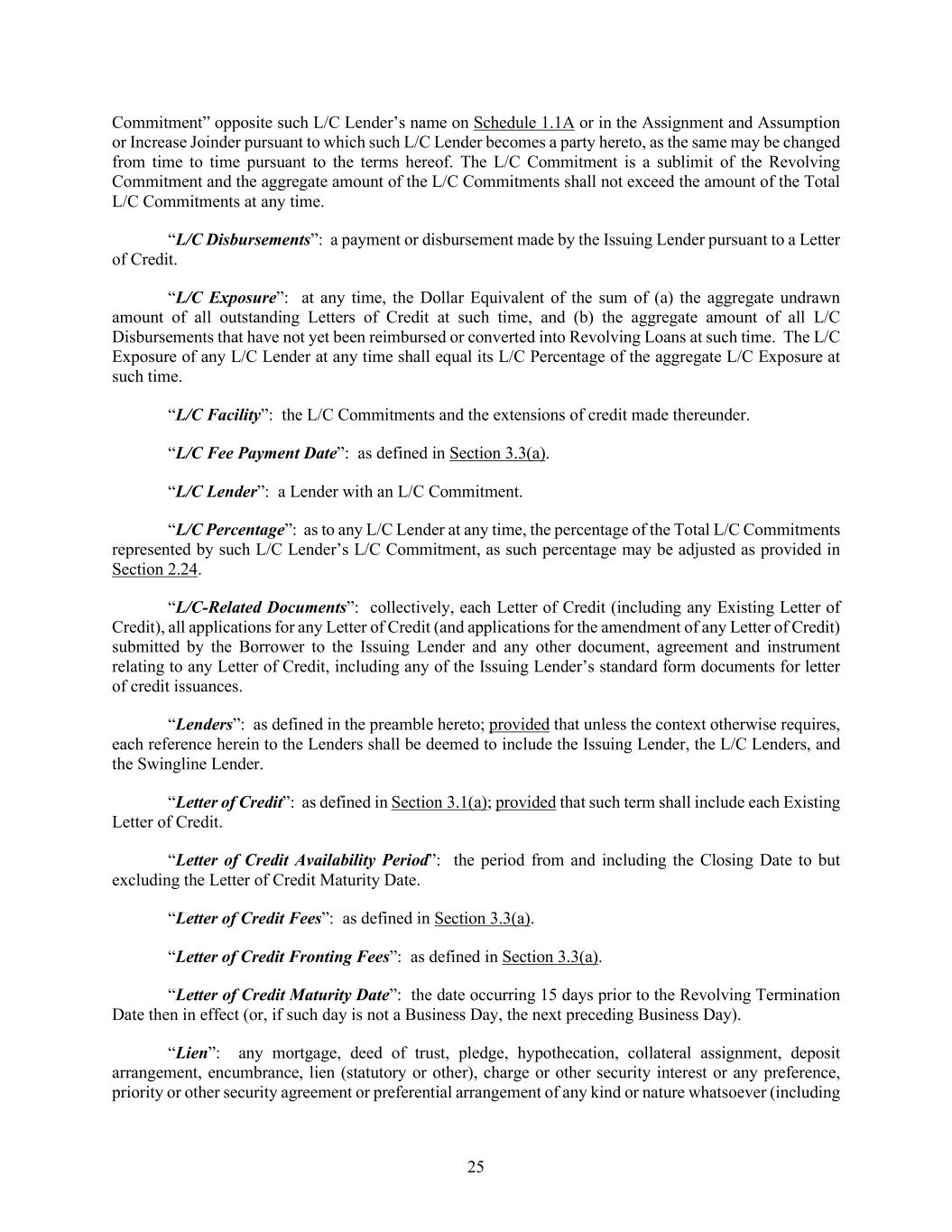 25 Commitment” opposite such L/C Lender’s name on Schedule 1.1A or in the Assignment and Assumption or Increase Joinder pursuant to which such L/C Lender becomes a party hereto, as the same may be changed from time to time pursuant to the terms hereof. The L/C Commitment is a sublimit of the Revolving Commitment and the aggregate amount of the L/C Commitments shall not exceed the amount of the Total L/C Commitments at any time. “L/C Disbursements”: a payment or disbursement made by the Issuing Lender pursuant to a Letter of Credit. “L/C Exposure”: at any time, the Dollar Equivalent of the sum of (a) the aggregate undrawn amount of all outstanding Letters of Credit at such time, and (b) the aggregate amount of all L/C Disbursements that have not yet been reimbursed or converted into Revolving Loans at such time. The L/C Exposure of any L/C Lender at any time shall equal its L/C Percentage of the aggregate L/C Exposure at such time. “L/C Facility”: the L/C Commitments and the extensions of credit made thereunder. “L/C Fee Payment Date”: as defined in Section 3.3(a). “L/C Lender”: a Lender with an L/C Commitment. “L/C Percentage”: as to any L/C Lender at any time, the percentage of the Total L/C Commitments represented by such L/C Lender’s L/C Commitment, as such percentage may be adjusted as provided in Section 2.24. “L/C-Related Documents”: collectively, each Letter of Credit (including any Existing Letter of Credit), all applications for any Letter of Credit (and applications for the amendment of any Letter of Credit) submitted by the Borrower to the Issuing Lender and any other document, agreement and instrument relating to any Letter of Credit, including any of the Issuing Lender’s standard form documents for letter of credit issuances. “Lenders”: as defined in the preamble hereto; provided that unless the context otherwise requires, each reference herein to the Lenders shall be deemed to include the Issuing Lender, the L/C Lenders, and the Swingline Lender. “Letter of Credit”: as defined in Section 3.1(a); provided that such term shall include each Existing Letter of Credit. “Letter of Credit Availability Period”: the period from and including the Closing Date to but excluding the Letter of Credit Maturity Date. “Letter of Credit Fees”: as defined in Section 3.3(a). “Letter of Credit Fronting Fees”: as defined in Section 3.3(a). “Letter of Credit Maturity Date”: the date occurring 15 days prior to the Revolving Termination Date then in effect (or, if such day is not a Business Day, the next preceding Business Day). “Lien”: any mortgage, deed of trust, pledge, hypothecation, collateral assignment, deposit arrangement, encumbrance, lien (statutory or other), charge or other security interest or any preference, priority or other security agreement or preferential arrangement of any kind or nature whatsoever (including