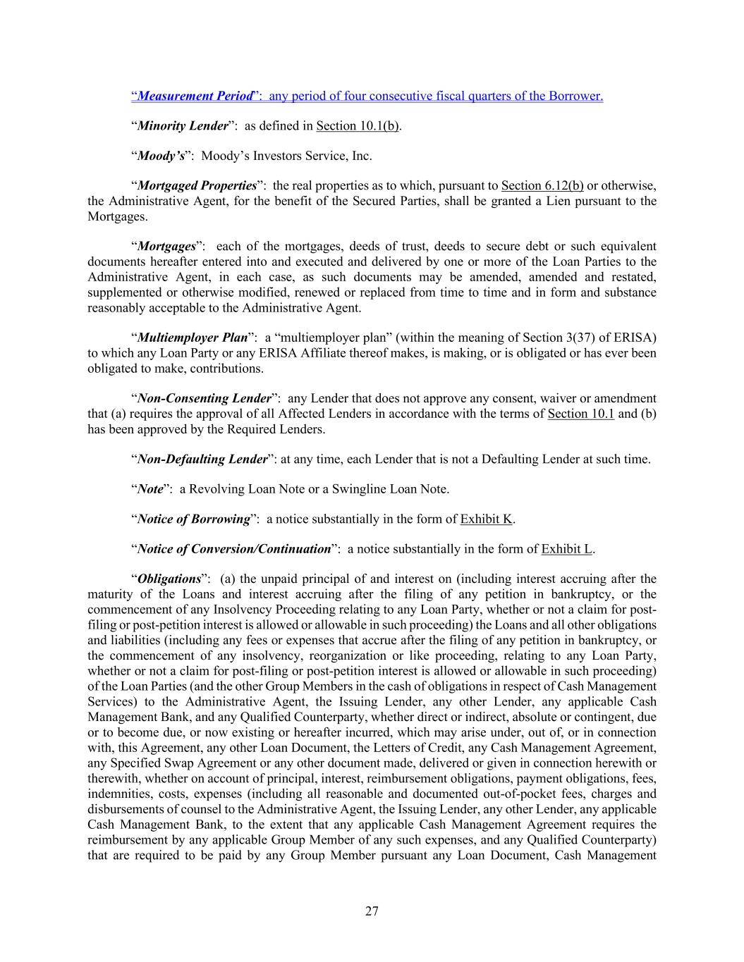 27 “Measurement Period”: any period of four consecutive fiscal quarters of the Borrower. “Minority Lender”: as defined in Section 10.1(b). “Moody’s”: Moody’s Investors Service, Inc. “Mortgaged Properties”: the real properties as to which, pursuant to Section 6.12(b) or otherwise, the Administrative Agent, for the benefit of the Secured Parties, shall be granted a Lien pursuant to the Mortgages. “Mortgages”: each of the mortgages, deeds of trust, deeds to secure debt or such equivalent documents hereafter entered into and executed and delivered by one or more of the Loan Parties to the Administrative Agent, in each case, as such documents may be amended, amended and restated, supplemented or otherwise modified, renewed or replaced from time to time and in form and substance reasonably acceptable to the Administrative Agent. “Multiemployer Plan”: a “multiemployer plan” (within the meaning of Section 3(37) of ERISA) to which any Loan Party or any ERISA Affiliate thereof makes, is making, or is obligated or has ever been obligated to make, contributions. “Non-Consenting Lender”: any Lender that does not approve any consent, waiver or amendment that (a) requires the approval of all Affected Lenders in accordance with the terms of Section 10.1 and (b) has been approved by the Required Lenders. “Non-Defaulting Lender”: at any time, each Lender that is not a Defaulting Lender at such time. “Note”: a Revolving Loan Note or a Swingline Loan Note. “Notice of Borrowing”: a notice substantially in the form of Exhibit K. “Notice of Conversion/Continuation”: a notice substantially in the form of Exhibit L. “Obligations”: (a) the unpaid principal of and interest on (including interest accruing after the maturity of the Loans and interest accruing after the filing of any petition in bankruptcy, or the commencement of any Insolvency Proceeding relating to any Loan Party, whether or not a claim for post- filing or post-petition interest is allowed or allowable in such proceeding) the Loans and all other obligations and liabilities (including any fees or expenses that accrue after the filing of any petition in bankruptcy, or the commencement of any insolvency, reorganization or like proceeding, relating to any Loan Party, whether or not a claim for post-filing or post-petition interest is allowed or allowable in such proceeding) of the Loan Parties (and the other Group Members in the cash of obligations in respect of Cash Management Services) to the Administrative Agent, the Issuing Lender, any other Lender, any applicable Cash Management Bank, and any Qualified Counterparty, whether direct or indirect, absolute or contingent, due or to become due, or now existing or hereafter incurred, which may arise under, out of, or in connection with, this Agreement, any other Loan Document, the Letters of Credit, any Cash Management Agreement, any Specified Swap Agreement or any other document made, delivered or given in connection herewith or therewith, whether on account of principal, interest, reimbursement obligations, payment obligations, fees, indemnities, costs, expenses (including all reasonable and documented out-of-pocket fees, charges and disbursements of counsel to the Administrative Agent, the Issuing Lender, any other Lender, any applicable Cash Management Bank, to the extent that any applicable Cash Management Agreement requires the reimbursement by any applicable Group Member of any such expenses, and any Qualified Counterparty) that are required to be paid by any Group Member pursuant any Loan Document, Cash Management