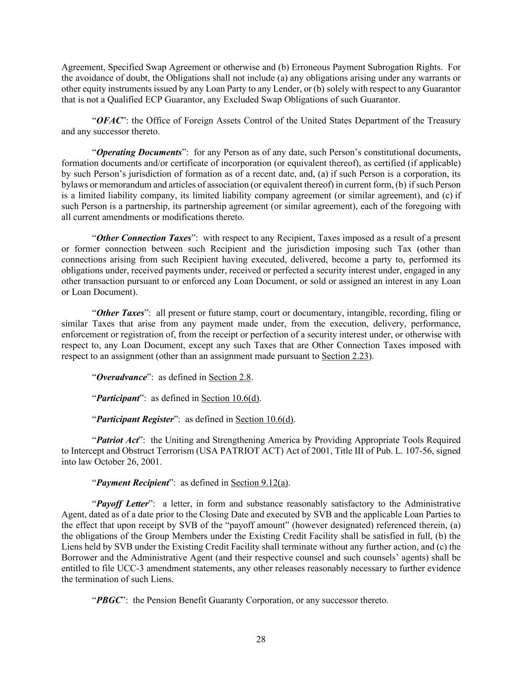 28 Agreement, Specified Swap Agreement or otherwise and (b) Erroneous Payment Subrogation Rights. For the avoidance of doubt, the Obligations shall not include (a) any obligations arising under any warrants or other equity instruments issued by any Loan Party to any Lender, or (b) solely with respect to any Guarantor that is not a Qualified ECP Guarantor, any Excluded Swap Obligations of such Guarantor. “OFAC”: the Office of Foreign Assets Control of the United States Department of the Treasury and any successor thereto. “Operating Documents”: for any Person as of any date, such Person’s constitutional documents, formation documents and/or certificate of incorporation (or equivalent thereof), as certified (if applicable) by such Person’s jurisdiction of formation as of a recent date, and, (a) if such Person is a corporation, its bylaws or memorandum and articles of association (or equivalent thereof) in current form, (b) if such Person is a limited liability company, its limited liability company agreement (or similar agreement), and (c) if such Person is a partnership, its partnership agreement (or similar agreement), each of the foregoing with all current amendments or modifications thereto. “Other Connection Taxes”: with respect to any Recipient, Taxes imposed as a result of a present or former connection between such Recipient and the jurisdiction imposing such Tax (other than connections arising from such Recipient having executed, delivered, become a party to, performed its obligations under, received payments under, received or perfected a security interest under, engaged in any other transaction pursuant to or enforced any Loan Document, or sold or assigned an interest in any Loan or Loan Document). “Other Taxes”: all present or future stamp, court or documentary, intangible, recording, filing or similar Taxes that arise from any payment made under, from the execution, delivery, performance, enforcement or registration of, from the receipt or perfection of a security interest under, or otherwise with respect to, any Loan Document, except any such Taxes that are Other Connection Taxes imposed with respect to an assignment (other than an assignment made pursuant to Section 2.23). “Overadvance”: as defined in Section 2.8. “Participant”: as defined in Section 10.6(d). “Participant Register”: as defined in Section 10.6(d). “Patriot Act”: the Uniting and Strengthening America by Providing Appropriate Tools Required to Intercept and Obstruct Terrorism (USA PATRIOT ACT) Act of 2001, Title III of Pub. L. 107-56, signed into law October 26, 2001. “Payment Recipient”: as defined in Section 9.12(a). “Payoff Letter”: a letter, in form and substance reasonably satisfactory to the Administrative Agent, dated as of a date prior to the Closing Date and executed by SVB and the applicable Loan Parties to the effect that upon receipt by SVB of the “payoff amount” (however designated) referenced therein, (a) the obligations of the Group Members under the Existing Credit Facility shall be satisfied in full, (b) the Liens held by SVB under the Existing Credit Facility shall terminate without any further action, and (c) the Borrower and the Administrative Agent (and their respective counsel and such counsels’ agents) shall be entitled to file UCC-3 amendment statements, any other releases reasonably necessary to further evidence the termination of such Liens. “PBGC”: the Pension Benefit Guaranty Corporation, or any successor thereto.
