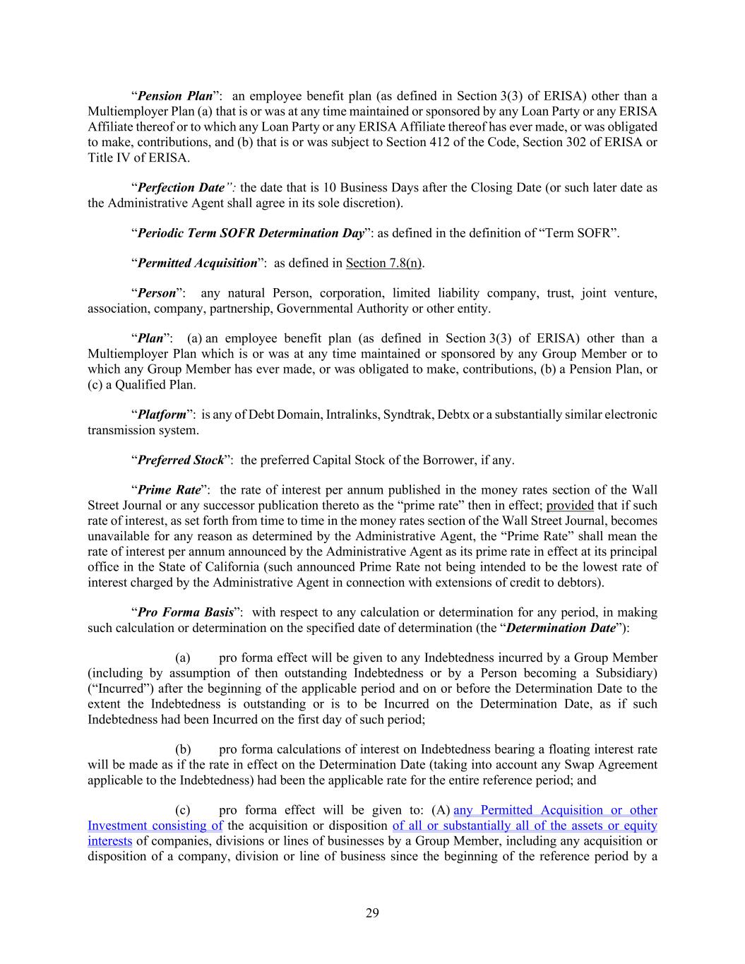 29 “Pension Plan”: an employee benefit plan (as defined in Section 3(3) of ERISA) other than a Multiemployer Plan (a) that is or was at any time maintained or sponsored by any Loan Party or any ERISA Affiliate thereof or to which any Loan Party or any ERISA Affiliate thereof has ever made, or was obligated to make, contributions, and (b) that is or was subject to Section 412 of the Code, Section 302 of ERISA or Title IV of ERISA. “Perfection Date”: the date that is 10 Business Days after the Closing Date (or such later date as the Administrative Agent shall agree in its sole discretion). “Periodic Term SOFR Determination Day”: as defined in the definition of “Term SOFR”. “Permitted Acquisition”: as defined in Section 7.8(n). “Person”: any natural Person, corporation, limited liability company, trust, joint venture, association, company, partnership, Governmental Authority or other entity. “Plan”: (a) an employee benefit plan (as defined in Section 3(3) of ERISA) other than a Multiemployer Plan which is or was at any time maintained or sponsored by any Group Member or to which any Group Member has ever made, or was obligated to make, contributions, (b) a Pension Plan, or (c) a Qualified Plan. “Platform”: is any of Debt Domain, Intralinks, Syndtrak, Debtx or a substantially similar electronic transmission system. “Preferred Stock”: the preferred Capital Stock of the Borrower, if any. “Prime Rate”: the rate of interest per annum published in the money rates section of the Wall Street Journal or any successor publication thereto as the “prime rate” then in effect; provided that if such rate of interest, as set forth from time to time in the money rates section of the Wall Street Journal, becomes unavailable for any reason as determined by the Administrative Agent, the “Prime Rate” shall mean the rate of interest per annum announced by the Administrative Agent as its prime rate in effect at its principal office in the State of California (such announced Prime Rate not being intended to be the lowest rate of interest charged by the Administrative Agent in connection with extensions of credit to debtors). “Pro Forma Basis”: with respect to any calculation or determination for any period, in making such calculation or determination on the specified date of determination (the “Determination Date”): (a) pro forma effect will be given to any Indebtedness incurred by a Group Member (including by assumption of then outstanding Indebtedness or by a Person becoming a Subsidiary) (“Incurred”) after the beginning of the applicable period and on or before the Determination Date to the extent the Indebtedness is outstanding or is to be Incurred on the Determination Date, as if such Indebtedness had been Incurred on the first day of such period; (b) pro forma calculations of interest on Indebtedness bearing a floating interest rate will be made as if the rate in effect on the Determination Date (taking into account any Swap Agreement applicable to the Indebtedness) had been the applicable rate for the entire reference period; and (c) pro forma effect will be given to: (A) any Permitted Acquisition or other Investment consisting of the acquisition or disposition of all or substantially all of the assets or equity interests of companies, divisions or lines of businesses by a Group Member, including any acquisition or disposition of a company, division or line of business since the beginning of the reference period by a