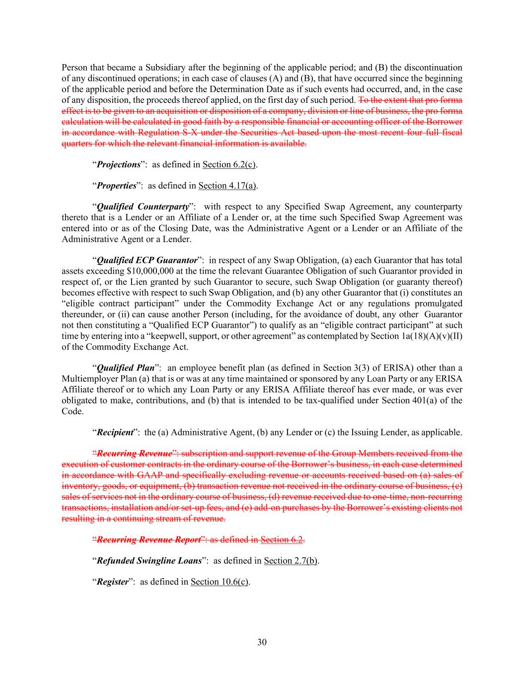 30 Person that became a Subsidiary after the beginning of the applicable period; and (B) the discontinuation of any discontinued operations; in each case of clauses (A) and (B), that have occurred since the beginning of the applicable period and before the Determination Date as if such events had occurred, and, in the case of any disposition, the proceeds thereof applied, on the first day of such period. To the extent that pro forma effect is to be given to an acquisition or disposition of a company, division or line of business, the pro forma calculation will be calculated in good faith by a responsible financial or accounting officer of the Borrower in accordance with Regulation S-X under the Securities Act based upon the most recent four full fiscal quarters for which the relevant financial information is available. “Projections”: as defined in Section 6.2(c). “Properties”: as defined in Section 4.17(a). “Qualified Counterparty”: with respect to any Specified Swap Agreement, any counterparty thereto that is a Lender or an Affiliate of a Lender or, at the time such Specified Swap Agreement was entered into or as of the Closing Date, was the Administrative Agent or a Lender or an Affiliate of the Administrative Agent or a Lender. “Qualified ECP Guarantor”: in respect of any Swap Obligation, (a) each Guarantor that has total assets exceeding $10,000,000 at the time the relevant Guarantee Obligation of such Guarantor provided in respect of, or the Lien granted by such Guarantor to secure, such Swap Obligation (or guaranty thereof) becomes effective with respect to such Swap Obligation, and (b) any other Guarantor that (i) constitutes an “eligible contract participant” under the Commodity Exchange Act or any regulations promulgated thereunder, or (ii) can cause another Person (including, for the avoidance of doubt, any other Guarantor not then constituting a “Qualified ECP Guarantor”) to qualify as an “eligible contract participant” at such time by entering into a “keepwell, support, or other agreement” as contemplated by Section 1a(18)(A)(v)(II) of the Commodity Exchange Act. “Qualified Plan”: an employee benefit plan (as defined in Section 3(3) of ERISA) other than a Multiemployer Plan (a) that is or was at any time maintained or sponsored by any Loan Party or any ERISA Affiliate thereof or to which any Loan Party or any ERISA Affiliate thereof has ever made, or was ever obligated to make, contributions, and (b) that is intended to be tax-qualified under Section 401(a) of the Code. “Recipient”: the (a) Administrative Agent, (b) any Lender or (c) the Issuing Lender, as applicable. “Recurring Revenue”: subscription and support revenue of the Group Members received from the execution of customer contracts in the ordinary course of the Borrower’s business, in each case determined in accordance with GAAP and specifically excluding revenue or accounts received based on (a) sales of inventory, goods, or equipment, (b) transaction revenue not received in the ordinary course of business, (c) sales of services not in the ordinary course of business, (d) revenue received due to one-time, non-recurring transactions, installation and/or set-up fees, and (e) add-on purchases by the Borrower’s existing clients not resulting in a continuing stream of revenue. “Recurring Revenue Report”: as defined in Section 6.2. “Refunded Swingline Loans”: as defined in Section 2.7(b). “Register”: as defined in Section 10.6(c).