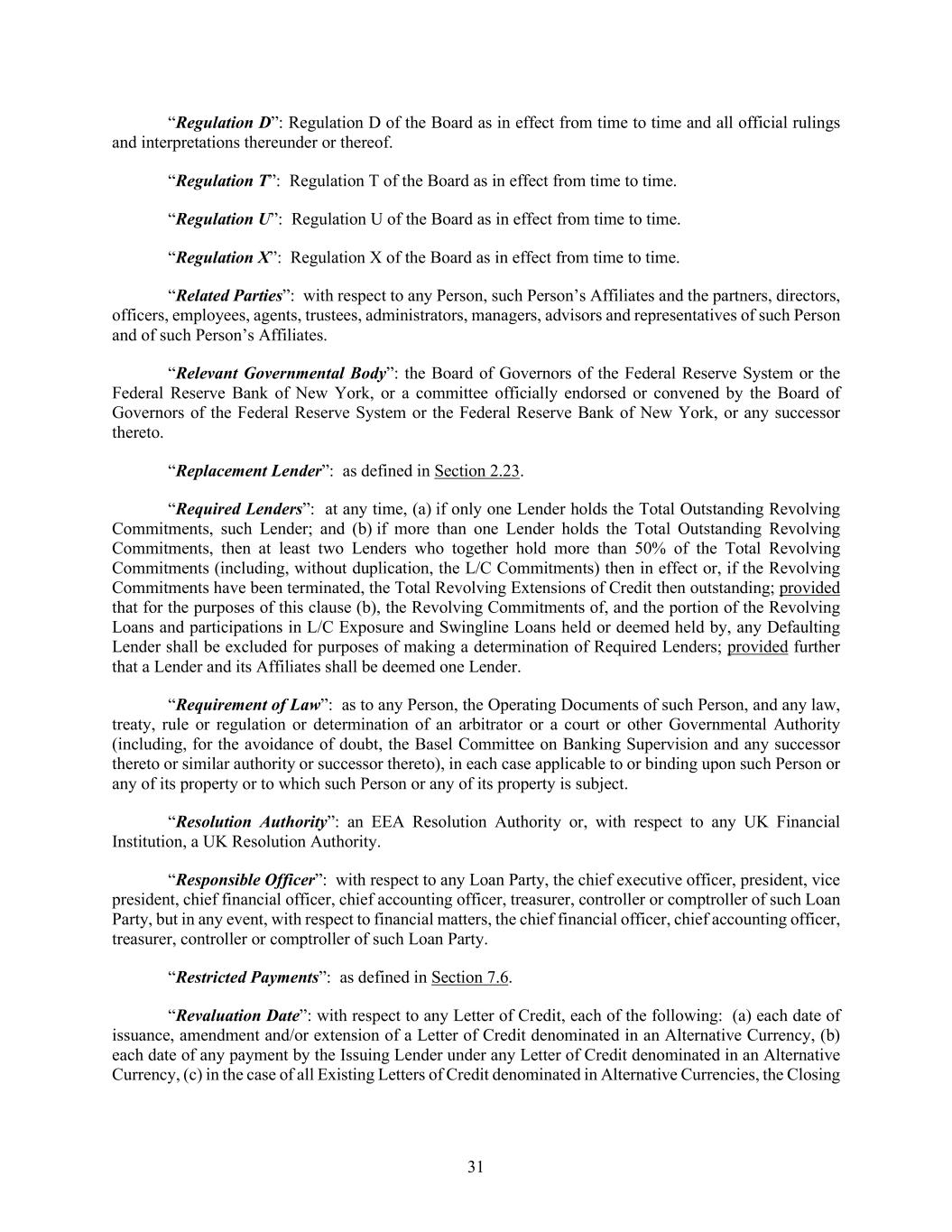 31 “Regulation D”: Regulation D of the Board as in effect from time to time and all official rulings and interpretations thereunder or thereof. “Regulation T”: Regulation T of the Board as in effect from time to time. “Regulation U”: Regulation U of the Board as in effect from time to time. “Regulation X”: Regulation X of the Board as in effect from time to time. “Related Parties”: with respect to any Person, such Person’s Affiliates and the partners, directors, officers, employees, agents, trustees, administrators, managers, advisors and representatives of such Person and of such Person’s Affiliates. “Relevant Governmental Body”: the Board of Governors of the Federal Reserve System or the Federal Reserve Bank of New York, or a committee officially endorsed or convened by the Board of Governors of the Federal Reserve System or the Federal Reserve Bank of New York, or any successor thereto. “Replacement Lender”: as defined in Section 2.23. “Required Lenders”: at any time, (a) if only one Lender holds the Total Outstanding Revolving Commitments, such Lender; and (b) if more than one Lender holds the Total Outstanding Revolving Commitments, then at least two Lenders who together hold more than 50% of the Total Revolving Commitments (including, without duplication, the L/C Commitments) then in effect or, if the Revolving Commitments have been terminated, the Total Revolving Extensions of Credit then outstanding; provided that for the purposes of this clause (b), the Revolving Commitments of, and the portion of the Revolving Loans and participations in L/C Exposure and Swingline Loans held or deemed held by, any Defaulting Lender shall be excluded for purposes of making a determination of Required Lenders; provided further that a Lender and its Affiliates shall be deemed one Lender. “Requirement of Law”: as to any Person, the Operating Documents of such Person, and any law, treaty, rule or regulation or determination of an arbitrator or a court or other Governmental Authority (including, for the avoidance of doubt, the Basel Committee on Banking Supervision and any successor thereto or similar authority or successor thereto), in each case applicable to or binding upon such Person or any of its property or to which such Person or any of its property is subject. “Resolution Authority”: an EEA Resolution Authority or, with respect to any UK Financial Institution, a UK Resolution Authority. “Responsible Officer”: with respect to any Loan Party, the chief executive officer, president, vice president, chief financial officer, chief accounting officer, treasurer, controller or comptroller of such Loan Party, but in any event, with respect to financial matters, the chief financial officer, chief accounting officer, treasurer, controller or comptroller of such Loan Party. “Restricted Payments”: as defined in Section 7.6. “Revaluation Date”: with respect to any Letter of Credit, each of the following: (a) each date of issuance, amendment and/or extension of a Letter of Credit denominated in an Alternative Currency, (b) each date of any payment by the Issuing Lender under any Letter of Credit denominated in an Alternative Currency, (c) in the case of all Existing Letters of Credit denominated in Alternative Currencies, the Closing