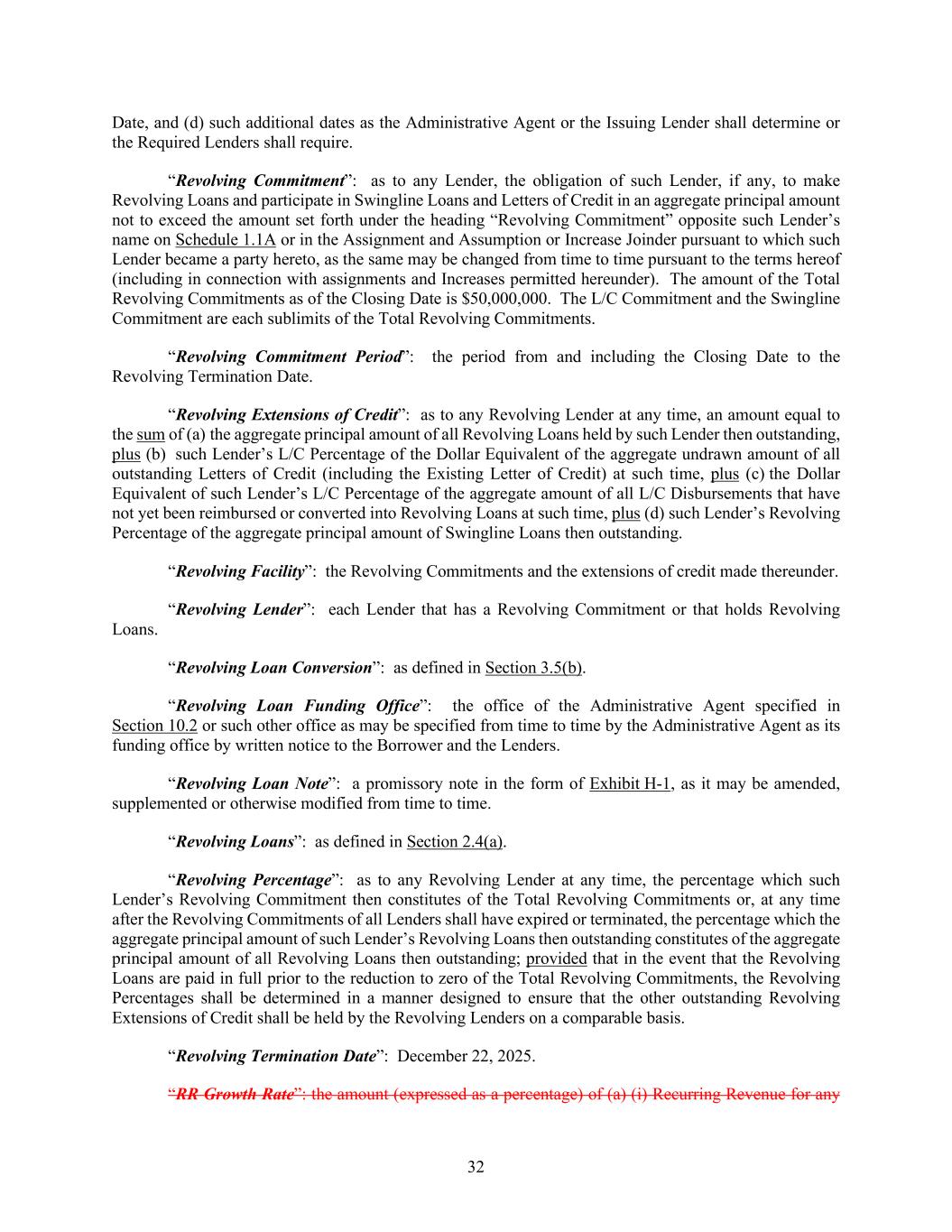 32 Date, and (d) such additional dates as the Administrative Agent or the Issuing Lender shall determine or the Required Lenders shall require. “Revolving Commitment”: as to any Lender, the obligation of such Lender, if any, to make Revolving Loans and participate in Swingline Loans and Letters of Credit in an aggregate principal amount not to exceed the amount set forth under the heading “Revolving Commitment” opposite such Lender’s name on Schedule 1.1A or in the Assignment and Assumption or Increase Joinder pursuant to which such Lender became a party hereto, as the same may be changed from time to time pursuant to the terms hereof (including in connection with assignments and Increases permitted hereunder). The amount of the Total Revolving Commitments as of the Closing Date is $50,000,000. The L/C Commitment and the Swingline Commitment are each sublimits of the Total Revolving Commitments. “Revolving Commitment Period”: the period from and including the Closing Date to the Revolving Termination Date. “Revolving Extensions of Credit”: as to any Revolving Lender at any time, an amount equal to the sum of (a) the aggregate principal amount of all Revolving Loans held by such Lender then outstanding, plus (b) such Lender’s L/C Percentage of the Dollar Equivalent of the aggregate undrawn amount of all outstanding Letters of Credit (including the Existing Letter of Credit) at such time, plus (c) the Dollar Equivalent of such Lender’s L/C Percentage of the aggregate amount of all L/C Disbursements that have not yet been reimbursed or converted into Revolving Loans at such time, plus (d) such Lender’s Revolving Percentage of the aggregate principal amount of Swingline Loans then outstanding. “Revolving Facility”: the Revolving Commitments and the extensions of credit made thereunder. “Revolving Lender”: each Lender that has a Revolving Commitment or that holds Revolving Loans. “Revolving Loan Conversion”: as defined in Section 3.5(b). “Revolving Loan Funding Office”: the office of the Administrative Agent specified in Section 10.2 or such other office as may be specified from time to time by the Administrative Agent as its funding office by written notice to the Borrower and the Lenders. “Revolving Loan Note”: a promissory note in the form of Exhibit H-1, as it may be amended, supplemented or otherwise modified from time to time. “Revolving Loans”: as defined in Section 2.4(a). “Revolving Percentage”: as to any Revolving Lender at any time, the percentage which such Lender’s Revolving Commitment then constitutes of the Total Revolving Commitments or, at any time after the Revolving Commitments of all Lenders shall have expired or terminated, the percentage which the aggregate principal amount of such Lender’s Revolving Loans then outstanding constitutes of the aggregate principal amount of all Revolving Loans then outstanding; provided that in the event that the Revolving Loans are paid in full prior to the reduction to zero of the Total Revolving Commitments, the Revolving Percentages shall be determined in a manner designed to ensure that the other outstanding Revolving Extensions of Credit shall be held by the Revolving Lenders on a comparable basis. “Revolving Termination Date”: December 22, 2025. “RR Growth Rate”: the amount (expressed as a percentage) of (a) (i) Recurring Revenue for any