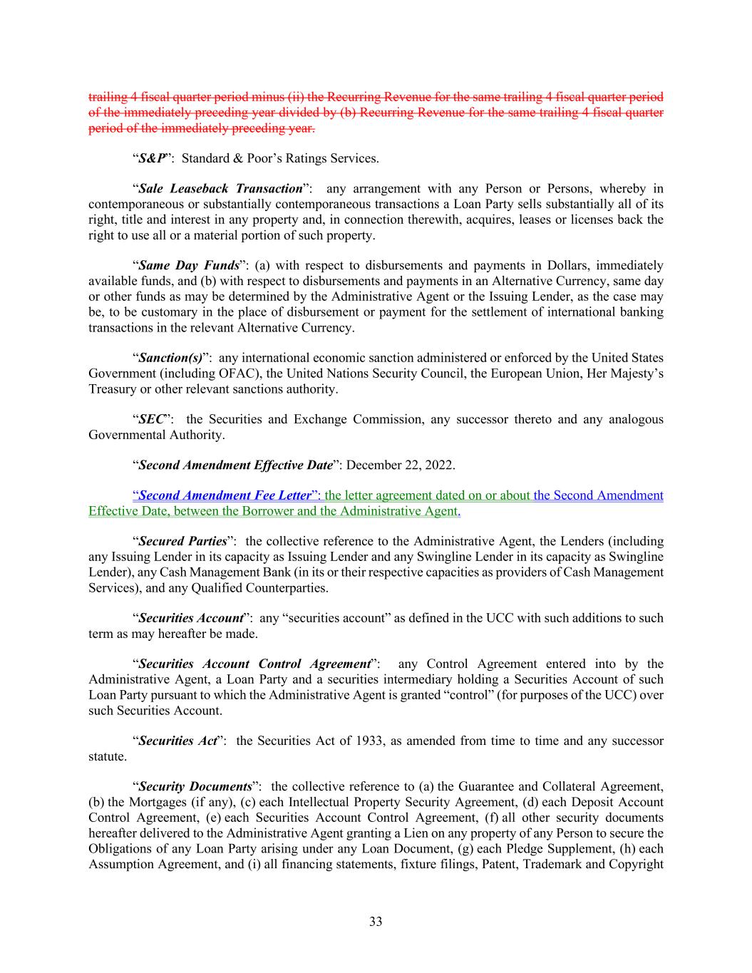 33 trailing 4 fiscal quarter period minus (ii) the Recurring Revenue for the same trailing 4 fiscal quarter period of the immediately preceding year divided by (b) Recurring Revenue for the same trailing 4 fiscal quarter period of the immediately preceding year. “S&P”: Standard & Poor’s Ratings Services. “Sale Leaseback Transaction”: any arrangement with any Person or Persons, whereby in contemporaneous or substantially contemporaneous transactions a Loan Party sells substantially all of its right, title and interest in any property and, in connection therewith, acquires, leases or licenses back the right to use all or a material portion of such property. “Same Day Funds”: (a) with respect to disbursements and payments in Dollars, immediately available funds, and (b) with respect to disbursements and payments in an Alternative Currency, same day or other funds as may be determined by the Administrative Agent or the Issuing Lender, as the case may be, to be customary in the place of disbursement or payment for the settlement of international banking transactions in the relevant Alternative Currency. “Sanction(s)”: any international economic sanction administered or enforced by the United States Government (including OFAC), the United Nations Security Council, the European Union, Her Majesty’s Treasury or other relevant sanctions authority. “SEC”: the Securities and Exchange Commission, any successor thereto and any analogous Governmental Authority. “Second Amendment Effective Date”: December 22, 2022. “Second Amendment Fee Letter”: the letter agreement dated on or about the Second Amendment Effective Date, between the Borrower and the Administrative Agent. “Secured Parties”: the collective reference to the Administrative Agent, the Lenders (including any Issuing Lender in its capacity as Issuing Lender and any Swingline Lender in its capacity as Swingline Lender), any Cash Management Bank (in its or their respective capacities as providers of Cash Management Services), and any Qualified Counterparties. “Securities Account”: any “securities account” as defined in the UCC with such additions to such term as may hereafter be made. “Securities Account Control Agreement”: any Control Agreement entered into by the Administrative Agent, a Loan Party and a securities intermediary holding a Securities Account of such Loan Party pursuant to which the Administrative Agent is granted “control” (for purposes of the UCC) over such Securities Account. “Securities Act”: the Securities Act of 1933, as amended from time to time and any successor statute. “Security Documents”: the collective reference to (a) the Guarantee and Collateral Agreement, (b) the Mortgages (if any), (c) each Intellectual Property Security Agreement, (d) each Deposit Account Control Agreement, (e) each Securities Account Control Agreement, (f) all other security documents hereafter delivered to the Administrative Agent granting a Lien on any property of any Person to secure the Obligations of any Loan Party arising under any Loan Document, (g) each Pledge Supplement, (h) each Assumption Agreement, and (i) all financing statements, fixture filings, Patent, Trademark and Copyright