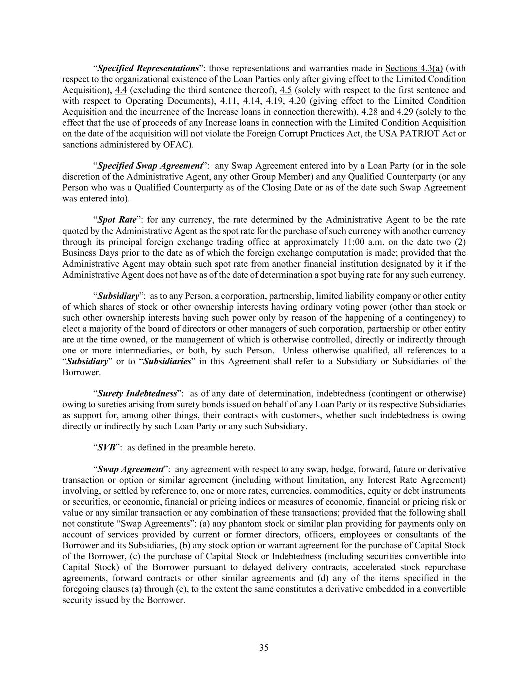 35 “Specified Representations”: those representations and warranties made in Sections 4.3(a) (with respect to the organizational existence of the Loan Parties only after giving effect to the Limited Condition Acquisition), 4.4 (excluding the third sentence thereof), 4.5 (solely with respect to the first sentence and with respect to Operating Documents), 4.11, 4.14, 4.19, 4.20 (giving effect to the Limited Condition Acquisition and the incurrence of the Increase loans in connection therewith), 4.28 and 4.29 (solely to the effect that the use of proceeds of any Increase loans in connection with the Limited Condition Acquisition on the date of the acquisition will not violate the Foreign Corrupt Practices Act, the USA PATRIOT Act or sanctions administered by OFAC). “Specified Swap Agreement”: any Swap Agreement entered into by a Loan Party (or in the sole discretion of the Administrative Agent, any other Group Member) and any Qualified Counterparty (or any Person who was a Qualified Counterparty as of the Closing Date or as of the date such Swap Agreement was entered into). “Spot Rate”: for any currency, the rate determined by the Administrative Agent to be the rate quoted by the Administrative Agent as the spot rate for the purchase of such currency with another currency through its principal foreign exchange trading office at approximately 11:00 a.m. on the date two (2) Business Days prior to the date as of which the foreign exchange computation is made; provided that the Administrative Agent may obtain such spot rate from another financial institution designated by it if the Administrative Agent does not have as of the date of determination a spot buying rate for any such currency. “Subsidiary”: as to any Person, a corporation, partnership, limited liability company or other entity of which shares of stock or other ownership interests having ordinary voting power (other than stock or such other ownership interests having such power only by reason of the happening of a contingency) to elect a majority of the board of directors or other managers of such corporation, partnership or other entity are at the time owned, or the management of which is otherwise controlled, directly or indirectly through one or more intermediaries, or both, by such Person. Unless otherwise qualified, all references to a “Subsidiary” or to “Subsidiaries” in this Agreement shall refer to a Subsidiary or Subsidiaries of the Borrower. “Surety Indebtedness”: as of any date of determination, indebtedness (contingent or otherwise) owing to sureties arising from surety bonds issued on behalf of any Loan Party or its respective Subsidiaries as support for, among other things, their contracts with customers, whether such indebtedness is owing directly or indirectly by such Loan Party or any such Subsidiary. “SVB”: as defined in the preamble hereto. “Swap Agreement”: any agreement with respect to any swap, hedge, forward, future or derivative transaction or option or similar agreement (including without limitation, any Interest Rate Agreement) involving, or settled by reference to, one or more rates, currencies, commodities, equity or debt instruments or securities, or economic, financial or pricing indices or measures of economic, financial or pricing risk or value or any similar transaction or any combination of these transactions; provided that the following shall not constitute “Swap Agreements”: (a) any phantom stock or similar plan providing for payments only on account of services provided by current or former directors, officers, employees or consultants of the Borrower and its Subsidiaries, (b) any stock option or warrant agreement for the purchase of Capital Stock of the Borrower, (c) the purchase of Capital Stock or Indebtedness (including securities convertible into Capital Stock) of the Borrower pursuant to delayed delivery contracts, accelerated stock repurchase agreements, forward contracts or other similar agreements and (d) any of the items specified in the foregoing clauses (a) through (c), to the extent the same constitutes a derivative embedded in a convertible security issued by the Borrower.
