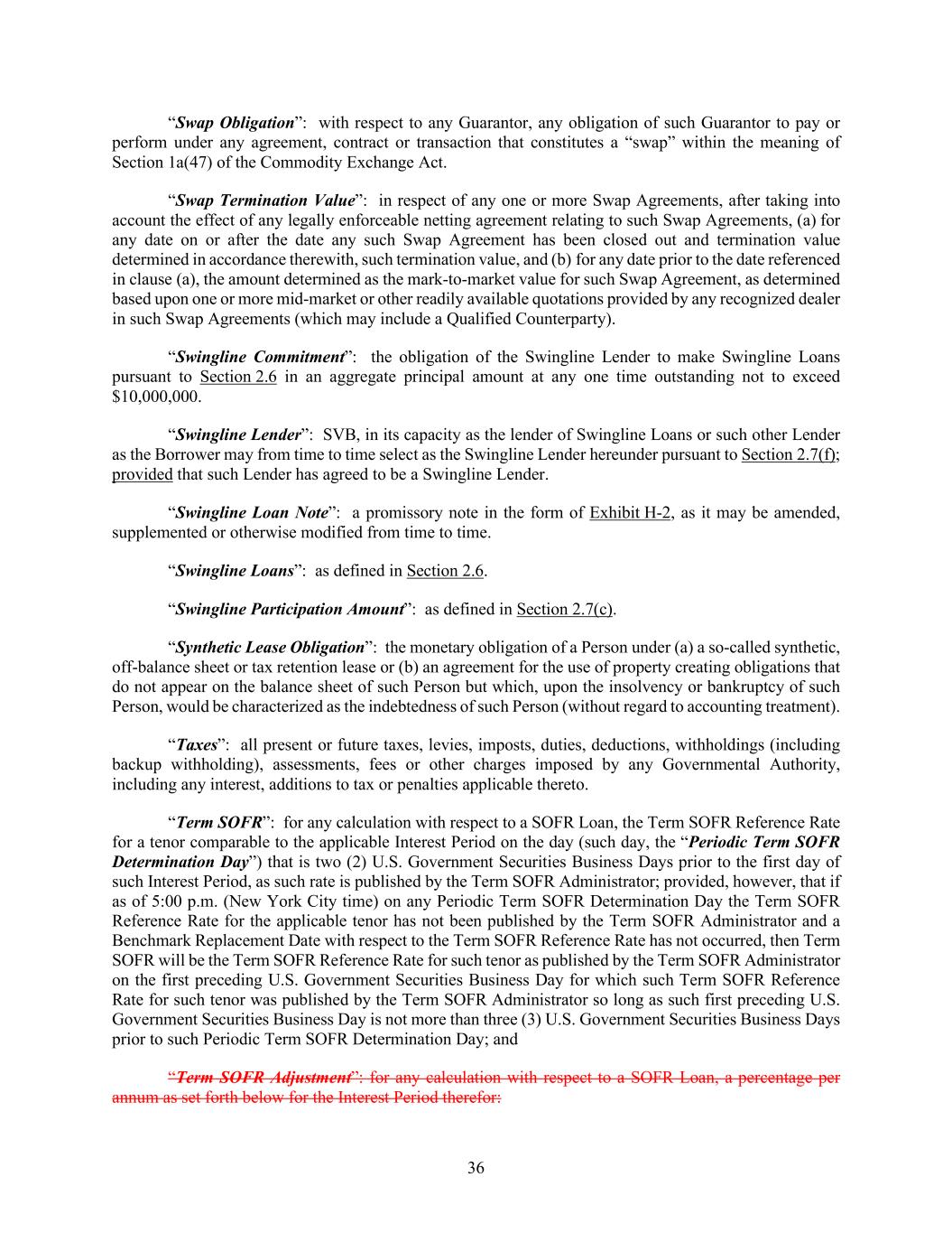 36 “Swap Obligation”: with respect to any Guarantor, any obligation of such Guarantor to pay or perform under any agreement, contract or transaction that constitutes a “swap” within the meaning of Section 1a(47) of the Commodity Exchange Act. “Swap Termination Value”: in respect of any one or more Swap Agreements, after taking into account the effect of any legally enforceable netting agreement relating to such Swap Agreements, (a) for any date on or after the date any such Swap Agreement has been closed out and termination value determined in accordance therewith, such termination value, and (b) for any date prior to the date referenced in clause (a), the amount determined as the mark-to-market value for such Swap Agreement, as determined based upon one or more mid-market or other readily available quotations provided by any recognized dealer in such Swap Agreements (which may include a Qualified Counterparty). “Swingline Commitment”: the obligation of the Swingline Lender to make Swingline Loans pursuant to Section 2.6 in an aggregate principal amount at any one time outstanding not to exceed $10,000,000. “Swingline Lender”: SVB, in its capacity as the lender of Swingline Loans or such other Lender as the Borrower may from time to time select as the Swingline Lender hereunder pursuant to Section 2.7(f); provided that such Lender has agreed to be a Swingline Lender. “Swingline Loan Note”: a promissory note in the form of Exhibit H-2, as it may be amended, supplemented or otherwise modified from time to time. “Swingline Loans”: as defined in Section 2.6. “Swingline Participation Amount”: as defined in Section 2.7(c). “Synthetic Lease Obligation”: the monetary obligation of a Person under (a) a so-called synthetic, off-balance sheet or tax retention lease or (b) an agreement for the use of property creating obligations that do not appear on the balance sheet of such Person but which, upon the insolvency or bankruptcy of such Person, would be characterized as the indebtedness of such Person (without regard to accounting treatment). “Taxes”: all present or future taxes, levies, imposts, duties, deductions, withholdings (including backup withholding), assessments, fees or other charges imposed by any Governmental Authority, including any interest, additions to tax or penalties applicable thereto. “Term SOFR”: for any calculation with respect to a SOFR Loan, the Term SOFR Reference Rate for a tenor comparable to the applicable Interest Period on the day (such day, the “Periodic Term SOFR Determination Day”) that is two (2) U.S. Government Securities Business Days prior to the first day of such Interest Period, as such rate is published by the Term SOFR Administrator; provided, however, that if as of 5:00 p.m. (New York City time) on any Periodic Term SOFR Determination Day the Term SOFR Reference Rate for the applicable tenor has not been published by the Term SOFR Administrator and a Benchmark Replacement Date with respect to the Term SOFR Reference Rate has not occurred, then Term SOFR will be the Term SOFR Reference Rate for such tenor as published by the Term SOFR Administrator on the first preceding U.S. Government Securities Business Day for which such Term SOFR Reference Rate for such tenor was published by the Term SOFR Administrator so long as such first preceding U.S. Government Securities Business Day is not more than three (3) U.S. Government Securities Business Days prior to such Periodic Term SOFR Determination Day; and “Term SOFR Adjustment”: for any calculation with respect to a SOFR Loan, a percentage per annum as set forth below for the Interest Period therefor: