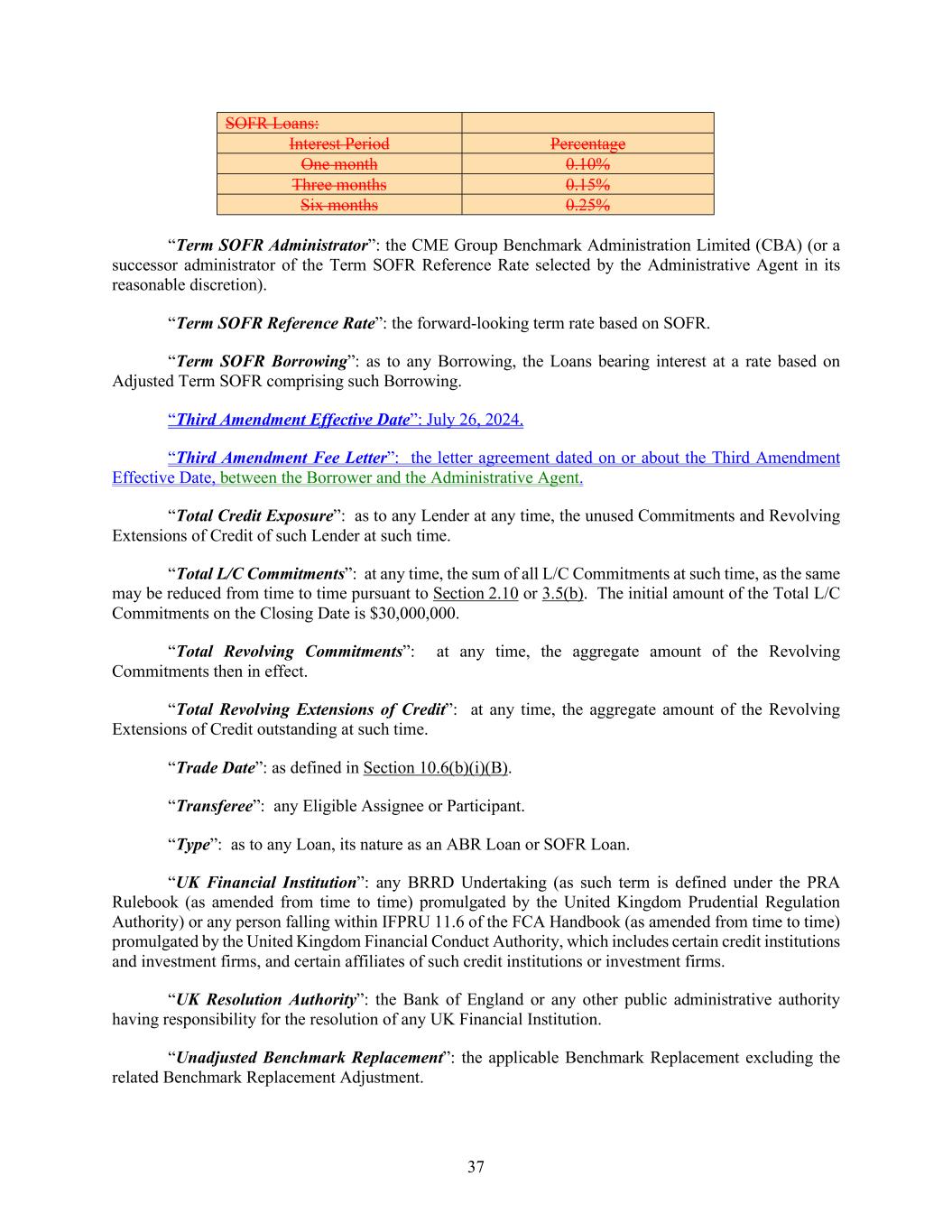 37 SOFR Loans: Interest Period Percentage One month 0.10% Three months 0.15% Six months 0.25% “Term SOFR Administrator”: the CME Group Benchmark Administration Limited (CBA) (or a successor administrator of the Term SOFR Reference Rate selected by the Administrative Agent in its reasonable discretion). “Term SOFR Reference Rate”: the forward-looking term rate based on SOFR. “Term SOFR Borrowing”: as to any Borrowing, the Loans bearing interest at a rate based on Adjusted Term SOFR comprising such Borrowing. “Third Amendment Effective Date”: July 26, 2024. “Third Amendment Fee Letter”: the letter agreement dated on or about the Third Amendment Effective Date, between the Borrower and the Administrative Agent. “Total Credit Exposure”: as to any Lender at any time, the unused Commitments and Revolving Extensions of Credit of such Lender at such time. “Total L/C Commitments”: at any time, the sum of all L/C Commitments at such time, as the same may be reduced from time to time pursuant to Section 2.10 or 3.5(b). The initial amount of the Total L/C Commitments on the Closing Date is $30,000,000. “Total Revolving Commitments”: at any time, the aggregate amount of the Revolving Commitments then in effect. “Total Revolving Extensions of Credit”: at any time, the aggregate amount of the Revolving Extensions of Credit outstanding at such time. “Trade Date”: as defined in Section 10.6(b)(i)(B). “Transferee”: any Eligible Assignee or Participant. “Type”: as to any Loan, its nature as an ABR Loan or SOFR Loan. “UK Financial Institution”: any BRRD Undertaking (as such term is defined under the PRA Rulebook (as amended from time to time) promulgated by the United Kingdom Prudential Regulation Authority) or any person falling within IFPRU 11.6 of the FCA Handbook (as amended from time to time) promulgated by the United Kingdom Financial Conduct Authority, which includes certain credit institutions and investment firms, and certain affiliates of such credit institutions or investment firms. “UK Resolution Authority”: the Bank of England or any other public administrative authority having responsibility for the resolution of any UK Financial Institution. “Unadjusted Benchmark Replacement”: the applicable Benchmark Replacement excluding the related Benchmark Replacement Adjustment.