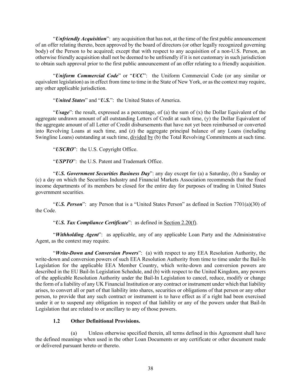 38 “Unfriendly Acquisition”: any acquisition that has not, at the time of the first public announcement of an offer relating thereto, been approved by the board of directors (or other legally recognized governing body) of the Person to be acquired; except that with respect to any acquisition of a non-U.S. Person, an otherwise friendly acquisition shall not be deemed to be unfriendly if it is not customary in such jurisdiction to obtain such approval prior to the first public announcement of an offer relating to a friendly acquisition. “Uniform Commercial Code” or “UCC”: the Uniform Commercial Code (or any similar or equivalent legislation) as in effect from time to time in the State of New York, or as the context may require, any other applicable jurisdiction. “United States” and “U.S.”: the United States of America. “Usage”: the result, expressed as a percentage, of (a) the sum of (x) the Dollar Equivalent of the aggregate undrawn amount of all outstanding Letters of Credit at such time, (y) the Dollar Equivalent of the aggregate amount of all Letter of Credit disbursements that have not yet been reimbursed or converted into Revolving Loans at such time, and (z) the aggregate principal balance of any Loans (including Swingline Loans) outstanding at such time, divided by (b) the Total Revolving Commitments at such time. “USCRO”: the U.S. Copyright Office. “USPTO”: the U.S. Patent and Trademark Office. “U.S. Government Securities Business Day”: any day except for (a) a Saturday, (b) a Sunday or (c) a day on which the Securities Industry and Financial Markets Association recommends that the fixed income departments of its members be closed for the entire day for purposes of trading in United States government securities. “U.S. Person”: any Person that is a “United States Person” as defined in Section 7701(a)(30) of the Code. “U.S. Tax Compliance Certificate”: as defined in Section 2.20(f). “Withholding Agent”: as applicable, any of any applicable Loan Party and the Administrative Agent, as the context may require. “Write-Down and Conversion Powers”: (a) with respect to any EEA Resolution Authority, the write-down and conversion powers of such EEA Resolution Authority from time to time under the Bail-In Legislation for the applicable EEA Member Country, which write-down and conversion powers are described in the EU Bail-In Legislation Schedule, and (b) with respect to the United Kingdom, any powers of the applicable Resolution Authority under the Bail-In Legislation to cancel, reduce, modify or change the form of a liability of any UK Financial Institution or any contract or instrument under which that liability arises, to convert all or part of that liability into shares, securities or obligations of that person or any other person, to provide that any such contract or instrument is to have effect as if a right had been exercised under it or to suspend any obligation in respect of that liability or any of the powers under that Bail-In Legislation that are related to or ancillary to any of those powers. Other Definitional Provisions. (a) Unless otherwise specified therein, all terms defined in this Agreement shall have the defined meanings when used in the other Loan Documents or any certificate or other document made or delivered pursuant hereto or thereto.