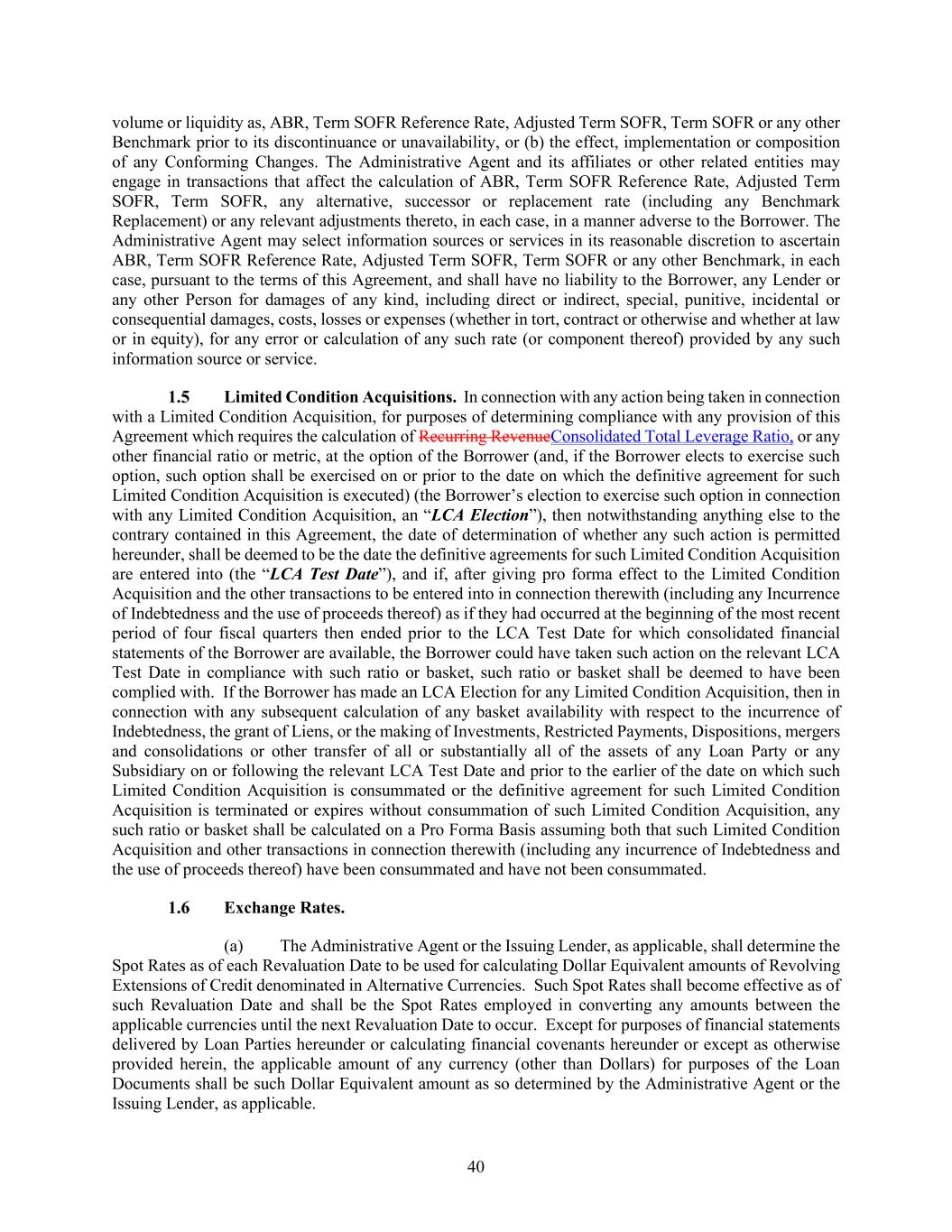 40 volume or liquidity as, ABR, Term SOFR Reference Rate, Adjusted Term SOFR, Term SOFR or any other Benchmark prior to its discontinuance or unavailability, or (b) the effect, implementation or composition of any Conforming Changes. The Administrative Agent and its affiliates or other related entities may engage in transactions that affect the calculation of ABR, Term SOFR Reference Rate, Adjusted Term SOFR, Term SOFR, any alternative, successor or replacement rate (including any Benchmark Replacement) or any relevant adjustments thereto, in each case, in a manner adverse to the Borrower. The Administrative Agent may select information sources or services in its reasonable discretion to ascertain ABR, Term SOFR Reference Rate, Adjusted Term SOFR, Term SOFR or any other Benchmark, in each case, pursuant to the terms of this Agreement, and shall have no liability to the Borrower, any Lender or any other Person for damages of any kind, including direct or indirect, special, punitive, incidental or consequential damages, costs, losses or expenses (whether in tort, contract or otherwise and whether at law or in equity), for any error or calculation of any such rate (or component thereof) provided by any such information source or service. Limited Condition Acquisitions. In connection with any action being taken in connection with a Limited Condition Acquisition, for purposes of determining compliance with any provision of this Agreement which requires the calculation of Recurring RevenueConsolidated Total Leverage Ratio, or any other financial ratio or metric, at the option of the Borrower (and, if the Borrower elects to exercise such option, such option shall be exercised on or prior to the date on which the definitive agreement for such Limited Condition Acquisition is executed) (the Borrower’s election to exercise such option in connection with any Limited Condition Acquisition, an “LCA Election”), then notwithstanding anything else to the contrary contained in this Agreement, the date of determination of whether any such action is permitted hereunder, shall be deemed to be the date the definitive agreements for such Limited Condition Acquisition are entered into (the “LCA Test Date”), and if, after giving pro forma effect to the Limited Condition Acquisition and the other transactions to be entered into in connection therewith (including any Incurrence of Indebtedness and the use of proceeds thereof) as if they had occurred at the beginning of the most recent period of four fiscal quarters then ended prior to the LCA Test Date for which consolidated financial statements of the Borrower are available, the Borrower could have taken such action on the relevant LCA Test Date in compliance with such ratio or basket, such ratio or basket shall be deemed to have been complied with. If the Borrower has made an LCA Election for any Limited Condition Acquisition, then in connection with any subsequent calculation of any basket availability with respect to the incurrence of Indebtedness, the grant of Liens, or the making of Investments, Restricted Payments, Dispositions, mergers and consolidations or other transfer of all or substantially all of the assets of any Loan Party or any Subsidiary on or following the relevant LCA Test Date and prior to the earlier of the date on which such Limited Condition Acquisition is consummated or the definitive agreement for such Limited Condition Acquisition is terminated or expires without consummation of such Limited Condition Acquisition, any such ratio or basket shall be calculated on a Pro Forma Basis assuming both that such Limited Condition Acquisition and other transactions in connection therewith (including any incurrence of Indebtedness and the use of proceeds thereof) have been consummated and have not been consummated. Exchange Rates. (a) The Administrative Agent or the Issuing Lender, as applicable, shall determine the Spot Rates as of each Revaluation Date to be used for calculating Dollar Equivalent amounts of Revolving Extensions of Credit denominated in Alternative Currencies. Such Spot Rates shall become effective as of such Revaluation Date and shall be the Spot Rates employed in converting any amounts between the applicable currencies until the next Revaluation Date to occur. Except for purposes of financial statements delivered by Loan Parties hereunder or calculating financial covenants hereunder or except as otherwise provided herein, the applicable amount of any currency (other than Dollars) for purposes of the Loan Documents shall be such Dollar Equivalent amount as so determined by the Administrative Agent or the Issuing Lender, as applicable.