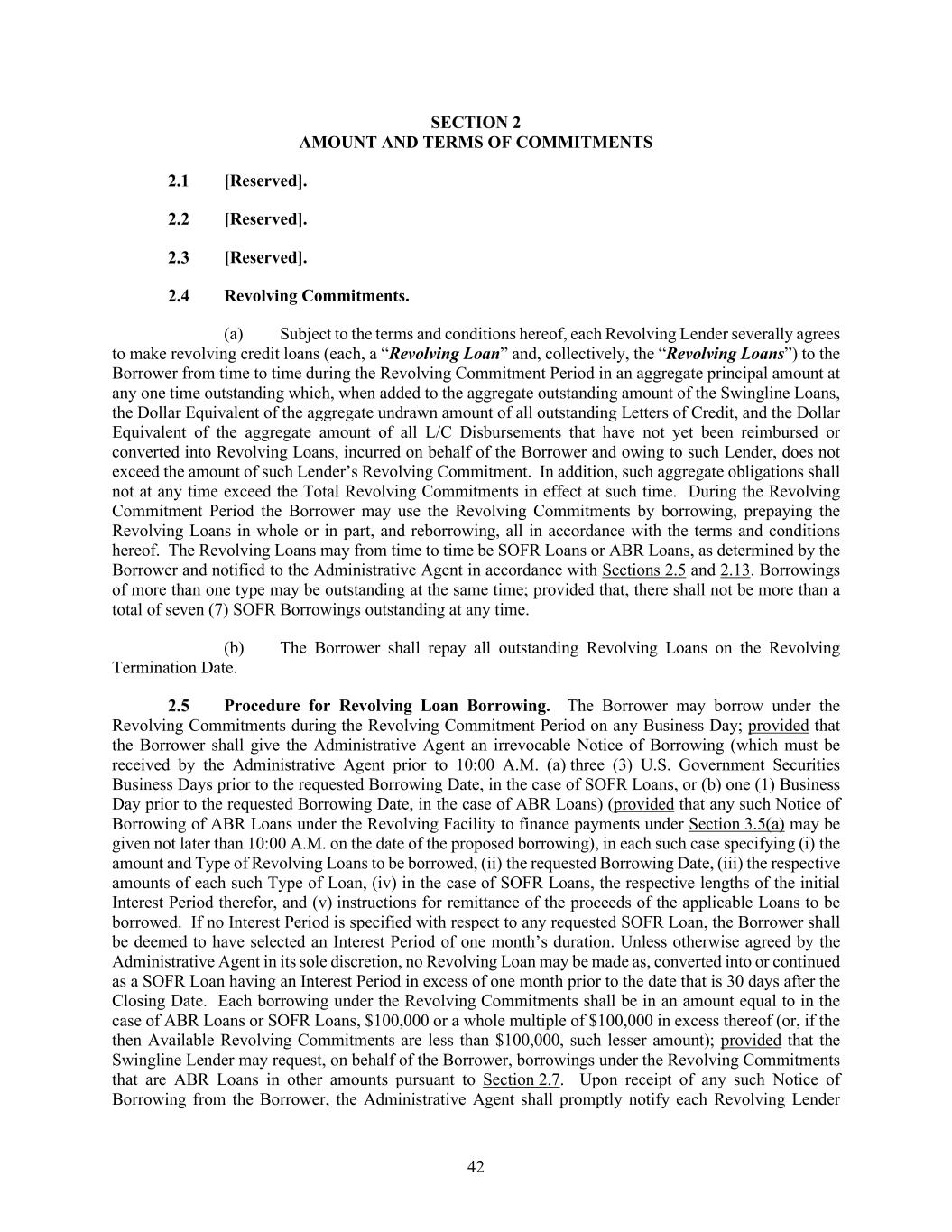 42 AMOUNT AND TERMS OF COMMITMENTS [Reserved]. [Reserved]. [Reserved]. Revolving Commitments. (a) Subject to the terms and conditions hereof, each Revolving Lender severally agrees to make revolving credit loans (each, a “Revolving Loan” and, collectively, the “Revolving Loans”) to the Borrower from time to time during the Revolving Commitment Period in an aggregate principal amount at any one time outstanding which, when added to the aggregate outstanding amount of the Swingline Loans, the Dollar Equivalent of the aggregate undrawn amount of all outstanding Letters of Credit, and the Dollar Equivalent of the aggregate amount of all L/C Disbursements that have not yet been reimbursed or converted into Revolving Loans, incurred on behalf of the Borrower and owing to such Lender, does not exceed the amount of such Lender’s Revolving Commitment. In addition, such aggregate obligations shall not at any time exceed the Total Revolving Commitments in effect at such time. During the Revolving Commitment Period the Borrower may use the Revolving Commitments by borrowing, prepaying the Revolving Loans in whole or in part, and reborrowing, all in accordance with the terms and conditions hereof. The Revolving Loans may from time to time be SOFR Loans or ABR Loans, as determined by the Borrower and notified to the Administrative Agent in accordance with Sections 2.5 and 2.13. Borrowings of more than one type may be outstanding at the same time; provided that, there shall not be more than a total of seven (7) SOFR Borrowings outstanding at any time. (b) The Borrower shall repay all outstanding Revolving Loans on the Revolving Termination Date. Procedure for Revolving Loan Borrowing. The Borrower may borrow under the Revolving Commitments during the Revolving Commitment Period on any Business Day; provided that the Borrower shall give the Administrative Agent an irrevocable Notice of Borrowing (which must be received by the Administrative Agent prior to 10:00 A.M. (a) three (3) U.S. Government Securities Business Days prior to the requested Borrowing Date, in the case of SOFR Loans, or (b) one (1) Business Day prior to the requested Borrowing Date, in the case of ABR Loans) (provided that any such Notice of Borrowing of ABR Loans under the Revolving Facility to finance payments under Section 3.5(a) may be given not later than 10:00 A.M. on the date of the proposed borrowing), in each such case specifying (i) the amount and Type of Revolving Loans to be borrowed, (ii) the requested Borrowing Date, (iii) the respective amounts of each such Type of Loan, (iv) in the case of SOFR Loans, the respective lengths of the initial Interest Period therefor, and (v) instructions for remittance of the proceeds of the applicable Loans to be borrowed. If no Interest Period is specified with respect to any requested SOFR Loan, the Borrower shall be deemed to have selected an Interest Period of one month’s duration. Unless otherwise agreed by the Administrative Agent in its sole discretion, no Revolving Loan may be made as, converted into or continued as a SOFR Loan having an Interest Period in excess of one month prior to the date that is 30 days after the Closing Date. Each borrowing under the Revolving Commitments shall be in an amount equal to in the case of ABR Loans or SOFR Loans, $100,000 or a whole multiple of $100,000 in excess thereof (or, if the then Available Revolving Commitments are less than $100,000, such lesser amount); provided that the Swingline Lender may request, on behalf of the Borrower, borrowings under the Revolving Commitments that are ABR Loans in other amounts pursuant to Section 2.7. Upon receipt of any such Notice of Borrowing from the Borrower, the Administrative Agent shall promptly notify each Revolving Lender