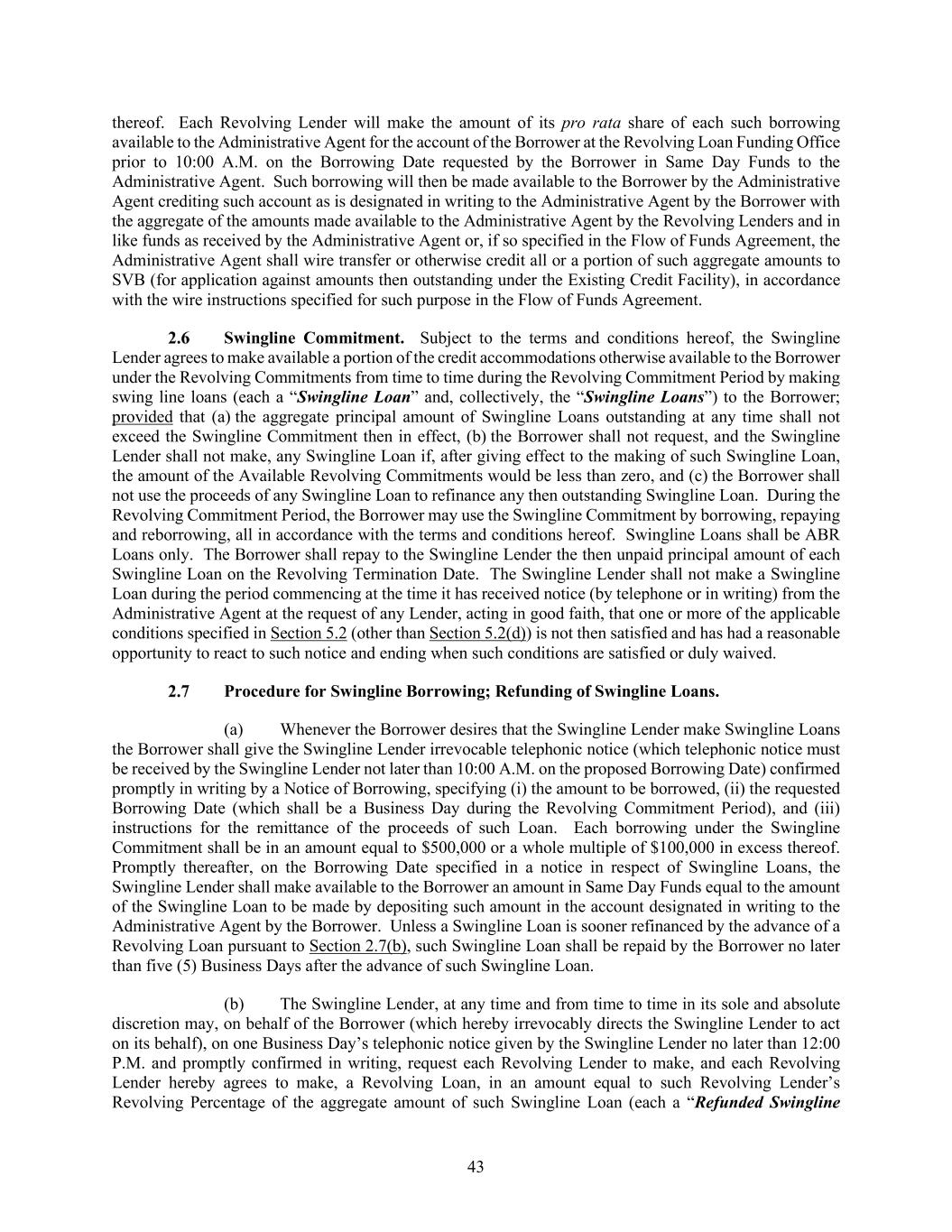 43 thereof. Each Revolving Lender will make the amount of its pro rata share of each such borrowing available to the Administrative Agent for the account of the Borrower at the Revolving Loan Funding Office prior to 10:00 A.M. on the Borrowing Date requested by the Borrower in Same Day Funds to the Administrative Agent. Such borrowing will then be made available to the Borrower by the Administrative Agent crediting such account as is designated in writing to the Administrative Agent by the Borrower with the aggregate of the amounts made available to the Administrative Agent by the Revolving Lenders and in like funds as received by the Administrative Agent or, if so specified in the Flow of Funds Agreement, the Administrative Agent shall wire transfer or otherwise credit all or a portion of such aggregate amounts to SVB (for application against amounts then outstanding under the Existing Credit Facility), in accordance with the wire instructions specified for such purpose in the Flow of Funds Agreement. Swingline Commitment. Subject to the terms and conditions hereof, the Swingline Lender agrees to make available a portion of the credit accommodations otherwise available to the Borrower under the Revolving Commitments from time to time during the Revolving Commitment Period by making swing line loans (each a “Swingline Loan” and, collectively, the “Swingline Loans”) to the Borrower; provided that (a) the aggregate principal amount of Swingline Loans outstanding at any time shall not exceed the Swingline Commitment then in effect, (b) the Borrower shall not request, and the Swingline Lender shall not make, any Swingline Loan if, after giving effect to the making of such Swingline Loan, the amount of the Available Revolving Commitments would be less than zero, and (c) the Borrower shall not use the proceeds of any Swingline Loan to refinance any then outstanding Swingline Loan. During the Revolving Commitment Period, the Borrower may use the Swingline Commitment by borrowing, repaying and reborrowing, all in accordance with the terms and conditions hereof. Swingline Loans shall be ABR Loans only. The Borrower shall repay to the Swingline Lender the then unpaid principal amount of each Swingline Loan on the Revolving Termination Date. The Swingline Lender shall not make a Swingline Loan during the period commencing at the time it has received notice (by telephone or in writing) from the Administrative Agent at the request of any Lender, acting in good faith, that one or more of the applicable conditions specified in Section 5.2 (other than Section 5.2(d)) is not then satisfied and has had a reasonable opportunity to react to such notice and ending when such conditions are satisfied or duly waived. Procedure for Swingline Borrowing; Refunding of Swingline Loans. (a) Whenever the Borrower desires that the Swingline Lender make Swingline Loans the Borrower shall give the Swingline Lender irrevocable telephonic notice (which telephonic notice must be received by the Swingline Lender not later than 10:00 A.M. on the proposed Borrowing Date) confirmed promptly in writing by a Notice of Borrowing, specifying (i) the amount to be borrowed, (ii) the requested Borrowing Date (which shall be a Business Day during the Revolving Commitment Period), and (iii) instructions for the remittance of the proceeds of such Loan. Each borrowing under the Swingline Commitment shall be in an amount equal to $500,000 or a whole multiple of $100,000 in excess thereof. Promptly thereafter, on the Borrowing Date specified in a notice in respect of Swingline Loans, the Swingline Lender shall make available to the Borrower an amount in Same Day Funds equal to the amount of the Swingline Loan to be made by depositing such amount in the account designated in writing to the Administrative Agent by the Borrower. Unless a Swingline Loan is sooner refinanced by the advance of a Revolving Loan pursuant to Section 2.7(b), such Swingline Loan shall be repaid by the Borrower no later than five (5) Business Days after the advance of such Swingline Loan. (b) The Swingline Lender, at any time and from time to time in its sole and absolute discretion may, on behalf of the Borrower (which hereby irrevocably directs the Swingline Lender to act on its behalf), on one Business Day’s telephonic notice given by the Swingline Lender no later than 12:00 P.M. and promptly confirmed in writing, request each Revolving Lender to make, and each Revolving Lender hereby agrees to make, a Revolving Loan, in an amount equal to such Revolving Lender’s Revolving Percentage of the aggregate amount of such Swingline Loan (each a “Refunded Swingline
