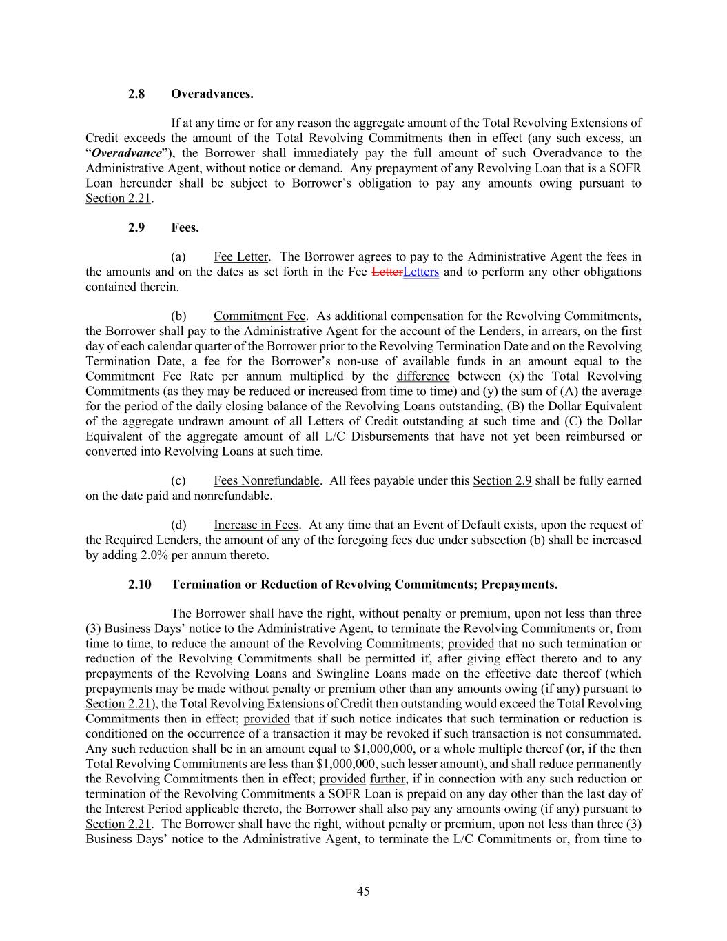 45 Overadvances. If at any time or for any reason the aggregate amount of the Total Revolving Extensions of Credit exceeds the amount of the Total Revolving Commitments then in effect (any such excess, an “Overadvance”), the Borrower shall immediately pay the full amount of such Overadvance to the Administrative Agent, without notice or demand. Any prepayment of any Revolving Loan that is a SOFR Loan hereunder shall be subject to Borrower’s obligation to pay any amounts owing pursuant to Section 2.21. Fees. (a) Fee Letter. The Borrower agrees to pay to the Administrative Agent the fees in the amounts and on the dates as set forth in the Fee LetterLetters and to perform any other obligations contained therein. (b) Commitment Fee. As additional compensation for the Revolving Commitments, the Borrower shall pay to the Administrative Agent for the account of the Lenders, in arrears, on the first day of each calendar quarter of the Borrower prior to the Revolving Termination Date and on the Revolving Termination Date, a fee for the Borrower’s non-use of available funds in an amount equal to the Commitment Fee Rate per annum multiplied by the difference between (x) the Total Revolving Commitments (as they may be reduced or increased from time to time) and (y) the sum of (A) the average for the period of the daily closing balance of the Revolving Loans outstanding, (B) the Dollar Equivalent of the aggregate undrawn amount of all Letters of Credit outstanding at such time and (C) the Dollar Equivalent of the aggregate amount of all L/C Disbursements that have not yet been reimbursed or converted into Revolving Loans at such time. (c) Fees Nonrefundable. All fees payable under this Section 2.9 shall be fully earned on the date paid and nonrefundable. (d) Increase in Fees. At any time that an Event of Default exists, upon the request of the Required Lenders, the amount of any of the foregoing fees due under subsection (b) shall be increased by adding 2.0% per annum thereto. Termination or Reduction of Revolving Commitments; Prepayments. The Borrower shall have the right, without penalty or premium, upon not less than three (3) Business Days’ notice to the Administrative Agent, to terminate the Revolving Commitments or, from time to time, to reduce the amount of the Revolving Commitments; provided that no such termination or reduction of the Revolving Commitments shall be permitted if, after giving effect thereto and to any prepayments of the Revolving Loans and Swingline Loans made on the effective date thereof (which prepayments may be made without penalty or premium other than any amounts owing (if any) pursuant to Section 2.21), the Total Revolving Extensions of Credit then outstanding would exceed the Total Revolving Commitments then in effect; provided that if such notice indicates that such termination or reduction is conditioned on the occurrence of a transaction it may be revoked if such transaction is not consummated. Any such reduction shall be in an amount equal to $1,000,000, or a whole multiple thereof (or, if the then Total Revolving Commitments are less than $1,000,000, such lesser amount), and shall reduce permanently the Revolving Commitments then in effect; provided further, if in connection with any such reduction or termination of the Revolving Commitments a SOFR Loan is prepaid on any day other than the last day of the Interest Period applicable thereto, the Borrower shall also pay any amounts owing (if any) pursuant to Section 2.21. The Borrower shall have the right, without penalty or premium, upon not less than three (3) Business Days’ notice to the Administrative Agent, to terminate the L/C Commitments or, from time to