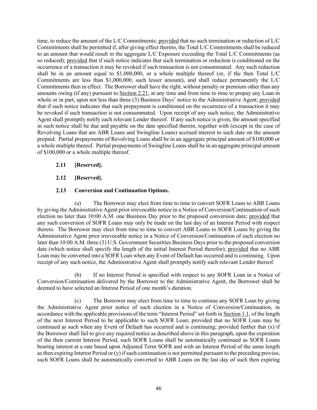 46 time, to reduce the amount of the L/C Commitments; provided that no such termination or reduction of L/C Commitments shall be permitted if, after giving effect thereto, the Total L/C Commitments shall be reduced to an amount that would result in the aggregate L/C Exposure exceeding the Total L/C Commitments (as so reduced); provided that if such notice indicates that such termination or reduction is conditioned on the occurrence of a transaction it may be revoked if such transaction is not consummated. Any such reduction shall be in an amount equal to $1,000,000, or a whole multiple thereof (or, if the then Total L/C Commitments are less than $1,000,000, such lesser amount), and shall reduce permanently the L/C Commitments then in effect. The Borrower shall have the right, without penalty or premium other than any amounts owing (if any) pursuant to Section 2.21, at any time and from time to time to prepay any Loan in whole or in part, upon not less than three (3) Business Days’ notice to the Administrative Agent; provided that if such notice indicates that such prepayment is conditioned on the occurrence of a transaction it may be revoked if such transaction is not consummated. Upon receipt of any such notice, the Administrative Agent shall promptly notify each relevant Lender thereof. If any such notice is given, the amount specified in such notice shall be due and payable on the date specified therein, together with (except in the case of Revolving Loans that are ABR Loans and Swingline Loans) accrued interest to such date on the amount prepaid. Partial prepayments of Revolving Loans shall be in an aggregate principal amount of $100,000 or a whole multiple thereof. Partial prepayments of Swingline Loans shall be in an aggregate principal amount of $100,000 or a whole multiple thereof. [Reserved]. [Reserved]. Conversion and Continuation Options. (a) The Borrower may elect from time to time to convert SOFR Loans to ABR Loans by giving the Administrative Agent prior irrevocable notice in a Notice of Conversion/Continuation of such election no later than 10:00 A.M. one Business Day prior to the proposed conversion date; provided that any such conversion of SOFR Loans may only be made on the last day of an Interest Period with respect thereto. The Borrower may elect from time to time to convert ABR Loans to SOFR Loans by giving the Administrative Agent prior irrevocable notice in a Notice of Conversion/Continuation of such election no later than 10:00 A.M. three (3) U.S. Government Securities Business Days prior to the proposed conversion date (which notice shall specify the length of the initial Interest Period therefor); provided that no ABR Loan may be converted into a SOFR Loan when any Event of Default has occurred and is continuing. Upon receipt of any such notice, the Administrative Agent shall promptly notify each relevant Lender thereof. (b) If no Interest Period is specified with respect to any SOFR Loan in a Notice of Conversion/Continuation delivered by the Borrower to the Administrative Agent, the Borrower shall be deemed to have selected an Interest Period of one month’s duration. (c) The Borrower may elect from time to time to continue any SOFR Loan by giving the Administrative Agent prior notice of such election in a Notice of Conversion/Continuation, in accordance with the applicable provisions of the term “Interest Period” set forth in Section 1.1, of the length of the next Interest Period to be applicable to such SOFR Loan; provided that no SOFR Loan may be continued as such when any Event of Default has occurred and is continuing; provided further that (x) if the Borrower shall fail to give any required notice as described above in this paragraph, upon the expiration of the then current Interest Period, such SOFR Loans shall be automatically continued as SOFR Loans bearing interest at a rate based upon Adjusted Term SOFR and with an Interest Period of the same length as then expiring Interest Period or (y) if such continuation is not permitted pursuant to the preceding proviso, such SOFR Loans shall be automatically converted to ABR Loans on the last day of such then expiring