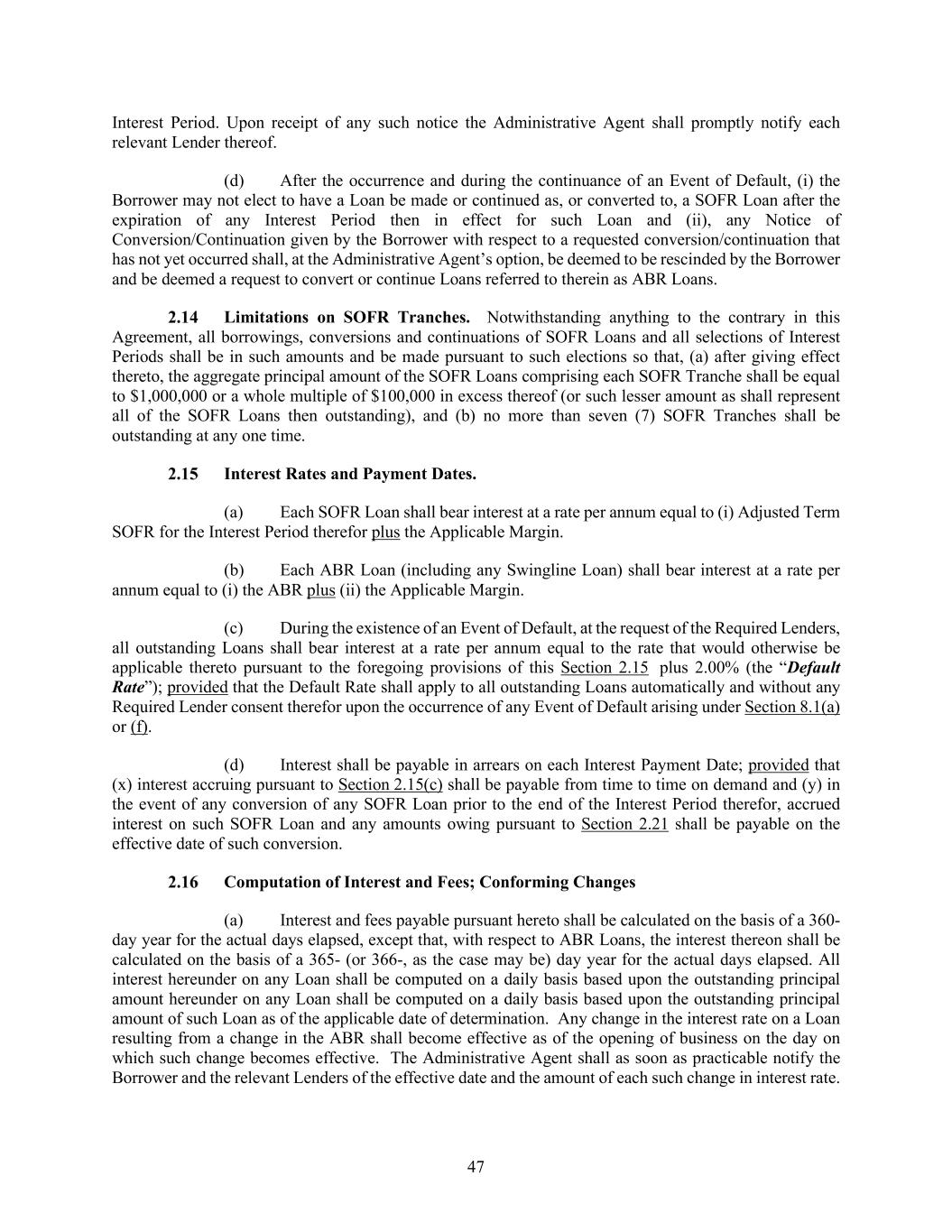 47 Interest Period. Upon receipt of any such notice the Administrative Agent shall promptly notify each relevant Lender thereof. (d) After the occurrence and during the continuance of an Event of Default, (i) the Borrower may not elect to have a Loan be made or continued as, or converted to, a SOFR Loan after the expiration of any Interest Period then in effect for such Loan and (ii), any Notice of Conversion/Continuation given by the Borrower with respect to a requested conversion/continuation that has not yet occurred shall, at the Administrative Agent’s option, be deemed to be rescinded by the Borrower and be deemed a request to convert or continue Loans referred to therein as ABR Loans. Limitations on SOFR Tranches. Notwithstanding anything to the contrary in this Agreement, all borrowings, conversions and continuations of SOFR Loans and all selections of Interest Periods shall be in such amounts and be made pursuant to such elections so that, (a) after giving effect thereto, the aggregate principal amount of the SOFR Loans comprising each SOFR Tranche shall be equal to $1,000,000 or a whole multiple of $100,000 in excess thereof (or such lesser amount as shall represent all of the SOFR Loans then outstanding), and (b) no more than seven (7) SOFR Tranches shall be outstanding at any one time. Interest Rates and Payment Dates. (a) Each SOFR Loan shall bear interest at a rate per annum equal to (i) Adjusted Term SOFR for the Interest Period therefor plus the Applicable Margin. (b) Each ABR Loan (including any Swingline Loan) shall bear interest at a rate per annum equal to (i) the ABR plus (ii) the Applicable Margin. (c) During the existence of an Event of Default, at the request of the Required Lenders, all outstanding Loans shall bear interest at a rate per annum equal to the rate that would otherwise be applicable thereto pursuant to the foregoing provisions of this Section 2.15 plus 2.00% (the “Default Rate”); provided that the Default Rate shall apply to all outstanding Loans automatically and without any Required Lender consent therefor upon the occurrence of any Event of Default arising under Section 8.1(a) or (f). (d) Interest shall be payable in arrears on each Interest Payment Date; provided that (x) interest accruing pursuant to Section 2.15(c) shall be payable from time to time on demand and (y) in the event of any conversion of any SOFR Loan prior to the end of the Interest Period therefor, accrued interest on such SOFR Loan and any amounts owing pursuant to Section 2.21 shall be payable on the effective date of such conversion. Computation of Interest and Fees; Conforming Changes (a) Interest and fees payable pursuant hereto shall be calculated on the basis of a 360- day year for the actual days elapsed, except that, with respect to ABR Loans, the interest thereon shall be calculated on the basis of a 365- (or 366-, as the case may be) day year for the actual days elapsed. All interest hereunder on any Loan shall be computed on a daily basis based upon the outstanding principal amount hereunder on any Loan shall be computed on a daily basis based upon the outstanding principal amount of such Loan as of the applicable date of determination. Any change in the interest rate on a Loan resulting from a change in the ABR shall become effective as of the opening of business on the day on which such change becomes effective. The Administrative Agent shall as soon as practicable notify the Borrower and the relevant Lenders of the effective date and the amount of each such change in interest rate.