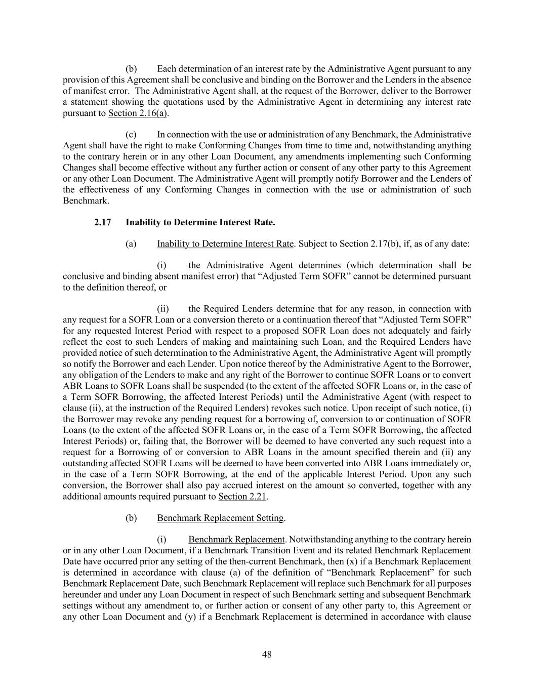 48 (b) Each determination of an interest rate by the Administrative Agent pursuant to any provision of this Agreement shall be conclusive and binding on the Borrower and the Lenders in the absence of manifest error. The Administrative Agent shall, at the request of the Borrower, deliver to the Borrower a statement showing the quotations used by the Administrative Agent in determining any interest rate pursuant to Section 2.16(a). (c) In connection with the use or administration of any Benchmark, the Administrative Agent shall have the right to make Conforming Changes from time to time and, notwithstanding anything to the contrary herein or in any other Loan Document, any amendments implementing such Conforming Changes shall become effective without any further action or consent of any other party to this Agreement or any other Loan Document. The Administrative Agent will promptly notify Borrower and the Lenders of the effectiveness of any Conforming Changes in connection with the use or administration of such Benchmark. Inability to Determine Interest Rate. (a) Inability to Determine Interest Rate. Subject to Section 2.17(b), if, as of any date: (i) the Administrative Agent determines (which determination shall be conclusive and binding absent manifest error) that “Adjusted Term SOFR” cannot be determined pursuant to the definition thereof, or (ii) the Required Lenders determine that for any reason, in connection with any request for a SOFR Loan or a conversion thereto or a continuation thereof that “Adjusted Term SOFR” for any requested Interest Period with respect to a proposed SOFR Loan does not adequately and fairly reflect the cost to such Lenders of making and maintaining such Loan, and the Required Lenders have provided notice of such determination to the Administrative Agent, the Administrative Agent will promptly so notify the Borrower and each Lender. Upon notice thereof by the Administrative Agent to the Borrower, any obligation of the Lenders to make and any right of the Borrower to continue SOFR Loans or to convert ABR Loans to SOFR Loans shall be suspended (to the extent of the affected SOFR Loans or, in the case of a Term SOFR Borrowing, the affected Interest Periods) until the Administrative Agent (with respect to clause (ii), at the instruction of the Required Lenders) revokes such notice. Upon receipt of such notice, (i) the Borrower may revoke any pending request for a borrowing of, conversion to or continuation of SOFR Loans (to the extent of the affected SOFR Loans or, in the case of a Term SOFR Borrowing, the affected Interest Periods) or, failing that, the Borrower will be deemed to have converted any such request into a request for a Borrowing of or conversion to ABR Loans in the amount specified therein and (ii) any outstanding affected SOFR Loans will be deemed to have been converted into ABR Loans immediately or, in the case of a Term SOFR Borrowing, at the end of the applicable Interest Period. Upon any such conversion, the Borrower shall also pay accrued interest on the amount so converted, together with any additional amounts required pursuant to Section 2.21. (b) Benchmark Replacement Setting. (i) Benchmark Replacement. Notwithstanding anything to the contrary herein or in any other Loan Document, if a Benchmark Transition Event and its related Benchmark Replacement Date have occurred prior any setting of the then-current Benchmark, then (x) if a Benchmark Replacement is determined in accordance with clause (a) of the definition of “Benchmark Replacement” for such Benchmark Replacement Date, such Benchmark Replacement will replace such Benchmark for all purposes hereunder and under any Loan Document in respect of such Benchmark setting and subsequent Benchmark settings without any amendment to, or further action or consent of any other party to, this Agreement or any other Loan Document and (y) if a Benchmark Replacement is determined in accordance with clause