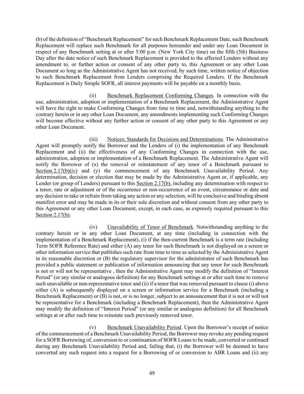 49 (b) of the definition of “Benchmark Replacement” for such Benchmark Replacement Date, such Benchmark Replacement will replace such Benchmark for all purposes hereunder and under any Loan Document in respect of any Benchmark setting at or after 5:00 p.m. (New York City time) on the fifth (5th) Business Day after the date notice of such Benchmark Replacement is provided to the affected Lenders without any amendment to, or further action or consent of any other party to, this Agreement or any other Loan Document so long as the Administrative Agent has not received, by such time, written notice of objection to such Benchmark Replacement from Lenders comprising the Required Lenders. If the Benchmark Replacement is Daily Simple SOFR, all interest payments will be payable on a monthly basis. (ii) Benchmark Replacement Conforming Changes. In connection with the use, administration, adoption or implementation of a Benchmark Replacement, the Administrative Agent will have the right to make Conforming Changes from time to time and, notwithstanding anything to the contrary herein or in any other Loan Document, any amendments implementing such Conforming Changes will become effective without any further action or consent of any other party to this Agreement or any other Loan Document. (iii) Notices; Standards for Decisions and Determinations. The Administrative Agent will promptly notify the Borrower and the Lenders of (i) the implementation of any Benchmark Replacement and (ii) the effectiveness of any Conforming Changes in connection with the use, administration, adoption or implementation of a Benchmark Replacement. The Administrative Agent will notify the Borrower of (x) the removal or reinstatement of any tenor of a Benchmark pursuant to Section 2.17(b)(iv) and (y) the commencement of any Benchmark Unavailability Period. Any determination, decision or election that may be made by the Administrative Agent or, if applicable, any Lender (or group of Lenders) pursuant to this Section 2.17(b), including any determination with respect to a tenor, rate or adjustment or of the occurrence or non-occurrence of an event, circumstance or date and any decision to take or refrain from taking any action or any selection, will be conclusive and binding absent manifest error and may be made in its or their sole discretion and without consent from any other party to this Agreement or any other Loan Document, except, in each case, as expressly required pursuant to this Section 2.17(b). (iv) Unavailability of Tenor of Benchmark. Notwithstanding anything to the contrary herein or in any other Loan Document, at any time (including in connection with the implementation of a Benchmark Replacement), (i) if the then-current Benchmark is a term rate (including Term SOFR Reference Rate) and either (A) any tenor for such Benchmark is not displayed on a screen or other information service that publishes such rate from time to time as selected by the Administrative Agent in its reasonable discretion or (B) the regulatory supervisor for the administrator of such Benchmark has provided a public statement or publication of information announcing that any tenor for such Benchmark is not or will not be representative , then the Administrative Agent may modify the definition of “Interest Period” (or any similar or analogous definition) for any Benchmark settings at or after such time to remove such unavailable or non-representative tenor and (ii) if a tenor that was removed pursuant to clause (i) above either (A) is subsequently displayed on a screen or information service for a Benchmark (including a Benchmark Replacement) or (B) is not, or is no longer, subject to an announcement that it is not or will not be representative for a Benchmark (including a Benchmark Replacement), then the Administrative Agent may modify the definition of “Interest Period” (or any similar or analogous definition) for all Benchmark settings at or after such time to reinstate such previously removed tenor. (v) Benchmark Unavailability Period. Upon the Borrower’s receipt of notice of the commencement of a Benchmark Unavailability Period, the Borrower may revoke any pending request for a SOFR Borrowing of, conversion to or continuation of SOFR Loans to be made, converted or continued during any Benchmark Unavailability Period and, failing that, (i) the Borrower will be deemed to have converted any such request into a request for a Borrowing of or conversion to ABR Loans and (ii) any