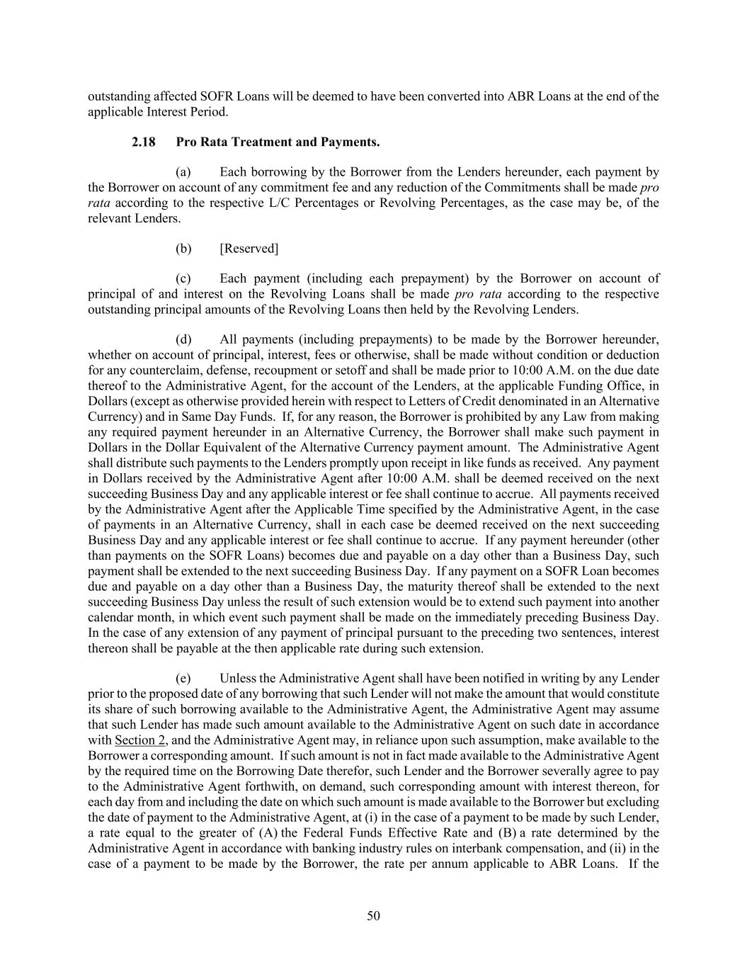 50 outstanding affected SOFR Loans will be deemed to have been converted into ABR Loans at the end of the applicable Interest Period. Pro Rata Treatment and Payments. (a) Each borrowing by the Borrower from the Lenders hereunder, each payment by the Borrower on account of any commitment fee and any reduction of the Commitments shall be made pro rata according to the respective L/C Percentages or Revolving Percentages, as the case may be, of the relevant Lenders. (b) [Reserved] (c) Each payment (including each prepayment) by the Borrower on account of principal of and interest on the Revolving Loans shall be made pro rata according to the respective outstanding principal amounts of the Revolving Loans then held by the Revolving Lenders. (d) All payments (including prepayments) to be made by the Borrower hereunder, whether on account of principal, interest, fees or otherwise, shall be made without condition or deduction for any counterclaim, defense, recoupment or setoff and shall be made prior to 10:00 A.M. on the due date thereof to the Administrative Agent, for the account of the Lenders, at the applicable Funding Office, in Dollars (except as otherwise provided herein with respect to Letters of Credit denominated in an Alternative Currency) and in Same Day Funds. If, for any reason, the Borrower is prohibited by any Law from making any required payment hereunder in an Alternative Currency, the Borrower shall make such payment in Dollars in the Dollar Equivalent of the Alternative Currency payment amount. The Administrative Agent shall distribute such payments to the Lenders promptly upon receipt in like funds as received. Any payment in Dollars received by the Administrative Agent after 10:00 A.M. shall be deemed received on the next succeeding Business Day and any applicable interest or fee shall continue to accrue. All payments received by the Administrative Agent after the Applicable Time specified by the Administrative Agent, in the case of payments in an Alternative Currency, shall in each case be deemed received on the next succeeding Business Day and any applicable interest or fee shall continue to accrue. If any payment hereunder (other than payments on the SOFR Loans) becomes due and payable on a day other than a Business Day, such payment shall be extended to the next succeeding Business Day. If any payment on a SOFR Loan becomes due and payable on a day other than a Business Day, the maturity thereof shall be extended to the next succeeding Business Day unless the result of such extension would be to extend such payment into another calendar month, in which event such payment shall be made on the immediately preceding Business Day. In the case of any extension of any payment of principal pursuant to the preceding two sentences, interest thereon shall be payable at the then applicable rate during such extension. (e) Unless the Administrative Agent shall have been notified in writing by any Lender prior to the proposed date of any borrowing that such Lender will not make the amount that would constitute its share of such borrowing available to the Administrative Agent, the Administrative Agent may assume that such Lender has made such amount available to the Administrative Agent on such date in accordance with Section 2, and the Administrative Agent may, in reliance upon such assumption, make available to the Borrower a corresponding amount. If such amount is not in fact made available to the Administrative Agent by the required time on the Borrowing Date therefor, such Lender and the Borrower severally agree to pay to the Administrative Agent forthwith, on demand, such corresponding amount with interest thereon, for each day from and including the date on which such amount is made available to the Borrower but excluding the date of payment to the Administrative Agent, at (i) in the case of a payment to be made by such Lender, a rate equal to the greater of (A) the Federal Funds Effective Rate and (B) a rate determined by the Administrative Agent in accordance with banking industry rules on interbank compensation, and (ii) in the case of a payment to be made by the Borrower, the rate per annum applicable to ABR Loans. If the