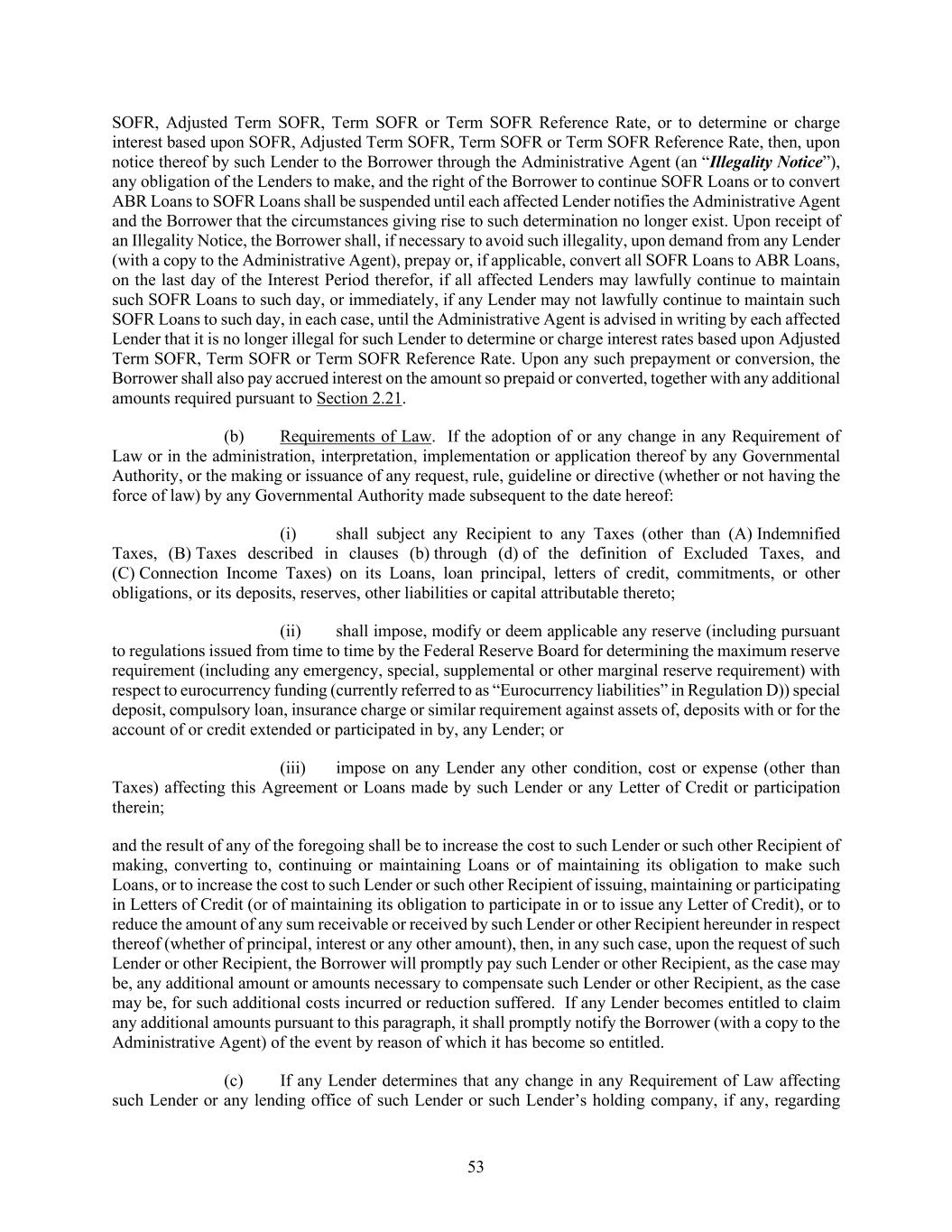 53 SOFR, Adjusted Term SOFR, Term SOFR or Term SOFR Reference Rate, or to determine or charge interest based upon SOFR, Adjusted Term SOFR, Term SOFR or Term SOFR Reference Rate, then, upon notice thereof by such Lender to the Borrower through the Administrative Agent (an “Illegality Notice”), any obligation of the Lenders to make, and the right of the Borrower to continue SOFR Loans or to convert ABR Loans to SOFR Loans shall be suspended until each affected Lender notifies the Administrative Agent and the Borrower that the circumstances giving rise to such determination no longer exist. Upon receipt of an Illegality Notice, the Borrower shall, if necessary to avoid such illegality, upon demand from any Lender (with a copy to the Administrative Agent), prepay or, if applicable, convert all SOFR Loans to ABR Loans, on the last day of the Interest Period therefor, if all affected Lenders may lawfully continue to maintain such SOFR Loans to such day, or immediately, if any Lender may not lawfully continue to maintain such SOFR Loans to such day, in each case, until the Administrative Agent is advised in writing by each affected Lender that it is no longer illegal for such Lender to determine or charge interest rates based upon Adjusted Term SOFR, Term SOFR or Term SOFR Reference Rate. Upon any such prepayment or conversion, the Borrower shall also pay accrued interest on the amount so prepaid or converted, together with any additional amounts required pursuant to Section 2.21. (b) Requirements of Law. If the adoption of or any change in any Requirement of Law or in the administration, interpretation, implementation or application thereof by any Governmental Authority, or the making or issuance of any request, rule, guideline or directive (whether or not having the force of law) by any Governmental Authority made subsequent to the date hereof: (i) shall subject any Recipient to any Taxes (other than (A) Indemnified Taxes, (B) Taxes described in clauses (b) through (d) of the definition of Excluded Taxes, and (C) Connection Income Taxes) on its Loans, loan principal, letters of credit, commitments, or other obligations, or its deposits, reserves, other liabilities or capital attributable thereto; (ii) shall impose, modify or deem applicable any reserve (including pursuant to regulations issued from time to time by the Federal Reserve Board for determining the maximum reserve requirement (including any emergency, special, supplemental or other marginal reserve requirement) with respect to eurocurrency funding (currently referred to as “Eurocurrency liabilities” in Regulation D)) special deposit, compulsory loan, insurance charge or similar requirement against assets of, deposits with or for the account of or credit extended or participated in by, any Lender; or (iii) impose on any Lender any other condition, cost or expense (other than Taxes) affecting this Agreement or Loans made by such Lender or any Letter of Credit or participation therein; and the result of any of the foregoing shall be to increase the cost to such Lender or such other Recipient of making, converting to, continuing or maintaining Loans or of maintaining its obligation to make such Loans, or to increase the cost to such Lender or such other Recipient of issuing, maintaining or participating in Letters of Credit (or of maintaining its obligation to participate in or to issue any Letter of Credit), or to reduce the amount of any sum receivable or received by such Lender or other Recipient hereunder in respect thereof (whether of principal, interest or any other amount), then, in any such case, upon the request of such Lender or other Recipient, the Borrower will promptly pay such Lender or other Recipient, as the case may be, any additional amount or amounts necessary to compensate such Lender or other Recipient, as the case may be, for such additional costs incurred or reduction suffered. If any Lender becomes entitled to claim any additional amounts pursuant to this paragraph, it shall promptly notify the Borrower (with a copy to the Administrative Agent) of the event by reason of which it has become so entitled. (c) If any Lender determines that any change in any Requirement of Law affecting such Lender or any lending office of such Lender or such Lender’s holding company, if any, regarding