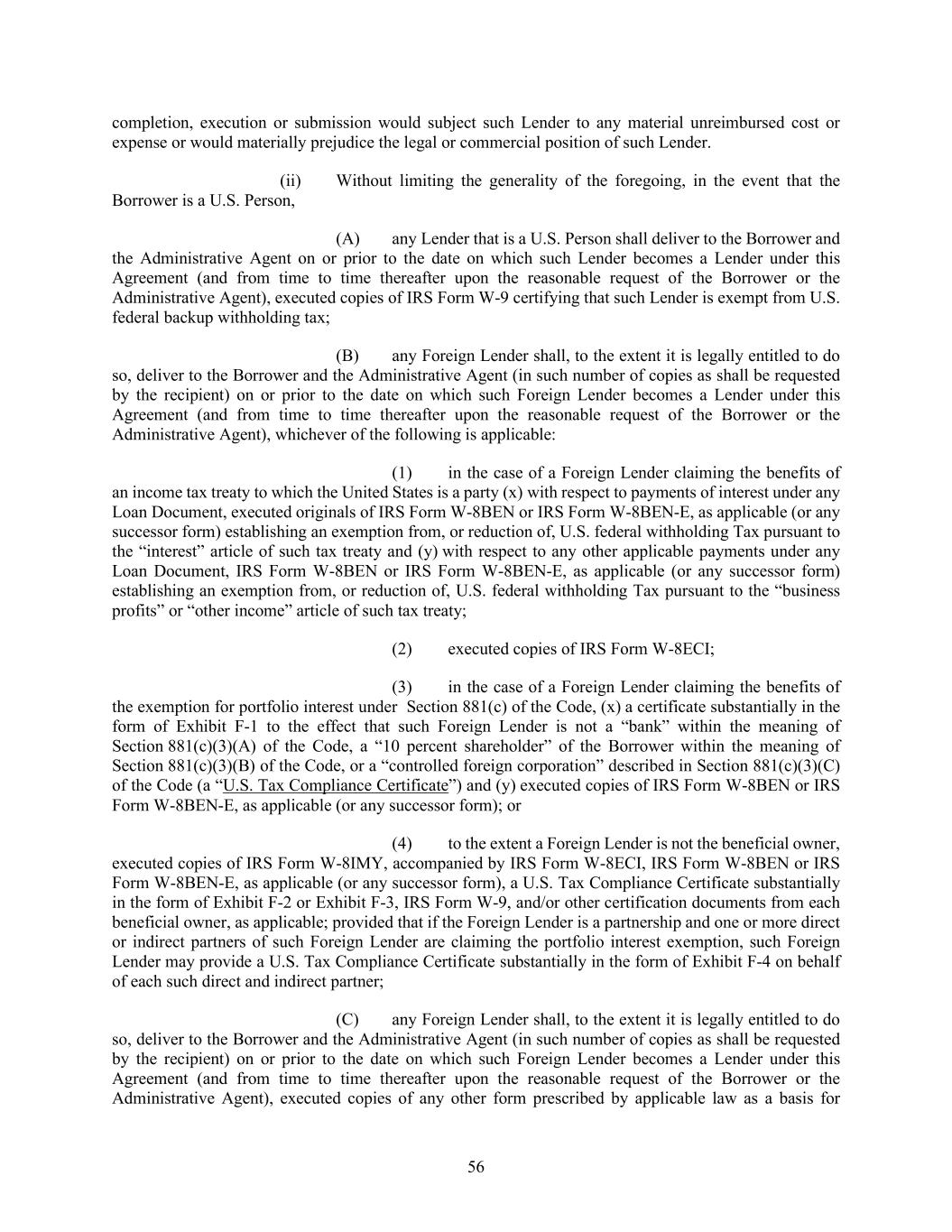 56 completion, execution or submission would subject such Lender to any material unreimbursed cost or expense or would materially prejudice the legal or commercial position of such Lender. (ii) Without limiting the generality of the foregoing, in the event that the Borrower is a U.S. Person, (A) any Lender that is a U.S. Person shall deliver to the Borrower and the Administrative Agent on or prior to the date on which such Lender becomes a Lender under this Agreement (and from time to time thereafter upon the reasonable request of the Borrower or the Administrative Agent), executed copies of IRS Form W-9 certifying that such Lender is exempt from U.S. federal backup withholding tax; (B) any Foreign Lender shall, to the extent it is legally entitled to do so, deliver to the Borrower and the Administrative Agent (in such number of copies as shall be requested by the recipient) on or prior to the date on which such Foreign Lender becomes a Lender under this Agreement (and from time to time thereafter upon the reasonable request of the Borrower or the Administrative Agent), whichever of the following is applicable: (1) in the case of a Foreign Lender claiming the benefits of an income tax treaty to which the United States is a party (x) with respect to payments of interest under any Loan Document, executed originals of IRS Form W-8BEN or IRS Form W-8BEN-E, as applicable (or any successor form) establishing an exemption from, or reduction of, U.S. federal withholding Tax pursuant to the “interest” article of such tax treaty and (y) with respect to any other applicable payments under any Loan Document, IRS Form W-8BEN or IRS Form W-8BEN-E, as applicable (or any successor form) establishing an exemption from, or reduction of, U.S. federal withholding Tax pursuant to the “business profits” or “other income” article of such tax treaty; (2) executed copies of IRS Form W-8ECI; (3) in the case of a Foreign Lender claiming the benefits of the exemption for portfolio interest under Section 881(c) of the Code, (x) a certificate substantially in the form of Exhibit F-1 to the effect that such Foreign Lender is not a “bank” within the meaning of Section 881(c)(3)(A) of the Code, a “10 percent shareholder” of the Borrower within the meaning of Section 881(c)(3)(B) of the Code, or a “controlled foreign corporation” described in Section 881(c)(3)(C) of the Code (a “U.S. Tax Compliance Certificate”) and (y) executed copies of IRS Form W-8BEN or IRS Form W-8BEN-E, as applicable (or any successor form); or (4) to the extent a Foreign Lender is not the beneficial owner, executed copies of IRS Form W-8IMY, accompanied by IRS Form W-8ECI, IRS Form W-8BEN or IRS Form W-8BEN-E, as applicable (or any successor form), a U.S. Tax Compliance Certificate substantially in the form of Exhibit F-2 or Exhibit F-3, IRS Form W-9, and/or other certification documents from each beneficial owner, as applicable; provided that if the Foreign Lender is a partnership and one or more direct or indirect partners of such Foreign Lender are claiming the portfolio interest exemption, such Foreign Lender may provide a U.S. Tax Compliance Certificate substantially in the form of Exhibit F-4 on behalf of each such direct and indirect partner; (C) any Foreign Lender shall, to the extent it is legally entitled to do so, deliver to the Borrower and the Administrative Agent (in such number of copies as shall be requested by the recipient) on or prior to the date on which such Foreign Lender becomes a Lender under this Agreement (and from time to time thereafter upon the reasonable request of the Borrower or the Administrative Agent), executed copies of any other form prescribed by applicable law as a basis for