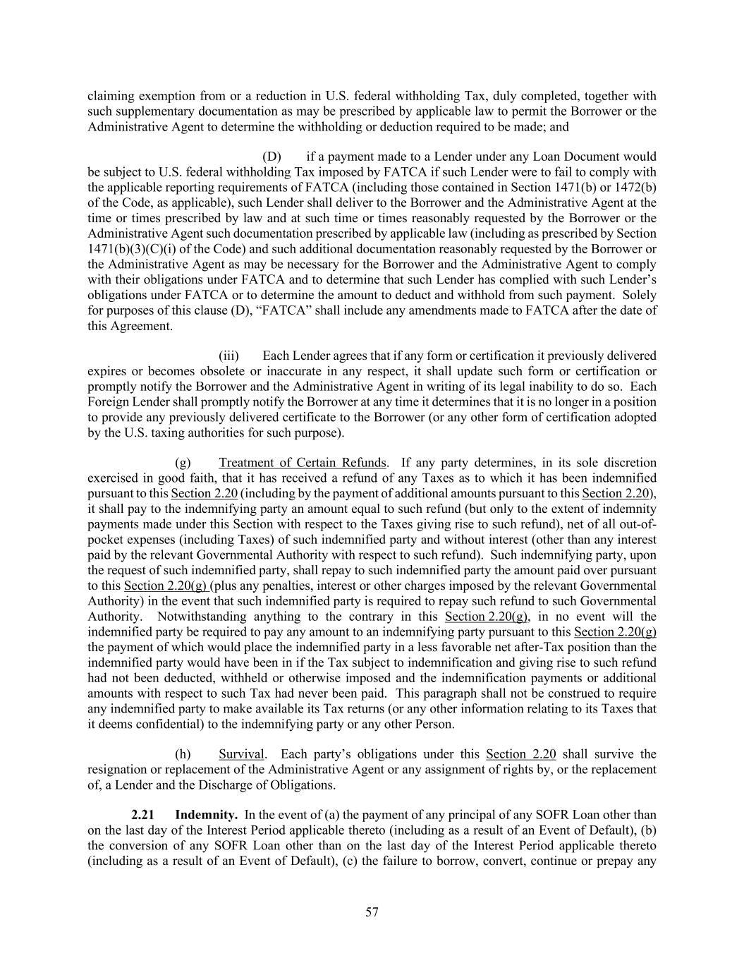 57 claiming exemption from or a reduction in U.S. federal withholding Tax, duly completed, together with such supplementary documentation as may be prescribed by applicable law to permit the Borrower or the Administrative Agent to determine the withholding or deduction required to be made; and (D) if a payment made to a Lender under any Loan Document would be subject to U.S. federal withholding Tax imposed by FATCA if such Lender were to fail to comply with the applicable reporting requirements of FATCA (including those contained in Section 1471(b) or 1472(b) of the Code, as applicable), such Lender shall deliver to the Borrower and the Administrative Agent at the time or times prescribed by law and at such time or times reasonably requested by the Borrower or the Administrative Agent such documentation prescribed by applicable law (including as prescribed by Section 1471(b)(3)(C)(i) of the Code) and such additional documentation reasonably requested by the Borrower or the Administrative Agent as may be necessary for the Borrower and the Administrative Agent to comply with their obligations under FATCA and to determine that such Lender has complied with such Lender’s obligations under FATCA or to determine the amount to deduct and withhold from such payment. Solely for purposes of this clause (D), “FATCA” shall include any amendments made to FATCA after the date of this Agreement. (iii) Each Lender agrees that if any form or certification it previously delivered expires or becomes obsolete or inaccurate in any respect, it shall update such form or certification or promptly notify the Borrower and the Administrative Agent in writing of its legal inability to do so. Each Foreign Lender shall promptly notify the Borrower at any time it determines that it is no longer in a position to provide any previously delivered certificate to the Borrower (or any other form of certification adopted by the U.S. taxing authorities for such purpose). (g) Treatment of Certain Refunds. If any party determines, in its sole discretion exercised in good faith, that it has received a refund of any Taxes as to which it has been indemnified pursuant to this Section 2.20 (including by the payment of additional amounts pursuant to this Section 2.20), it shall pay to the indemnifying party an amount equal to such refund (but only to the extent of indemnity payments made under this Section with respect to the Taxes giving rise to such refund), net of all out-of- pocket expenses (including Taxes) of such indemnified party and without interest (other than any interest paid by the relevant Governmental Authority with respect to such refund). Such indemnifying party, upon the request of such indemnified party, shall repay to such indemnified party the amount paid over pursuant to this Section 2.20(g) (plus any penalties, interest or other charges imposed by the relevant Governmental Authority) in the event that such indemnified party is required to repay such refund to such Governmental Authority. Notwithstanding anything to the contrary in this Section 2.20(g), in no event will the indemnified party be required to pay any amount to an indemnifying party pursuant to this Section 2.20(g) the payment of which would place the indemnified party in a less favorable net after-Tax position than the indemnified party would have been in if the Tax subject to indemnification and giving rise to such refund had not been deducted, withheld or otherwise imposed and the indemnification payments or additional amounts with respect to such Tax had never been paid. This paragraph shall not be construed to require any indemnified party to make available its Tax returns (or any other information relating to its Taxes that it deems confidential) to the indemnifying party or any other Person. (h) Survival. Each party’s obligations under this Section 2.20 shall survive the resignation or replacement of the Administrative Agent or any assignment of rights by, or the replacement of, a Lender and the Discharge of Obligations. Indemnity. In the event of (a) the payment of any principal of any SOFR Loan other than on the last day of the Interest Period applicable thereto (including as a result of an Event of Default), (b) the conversion of any SOFR Loan other than on the last day of the Interest Period applicable thereto (including as a result of an Event of Default), (c) the failure to borrow, convert, continue or prepay any