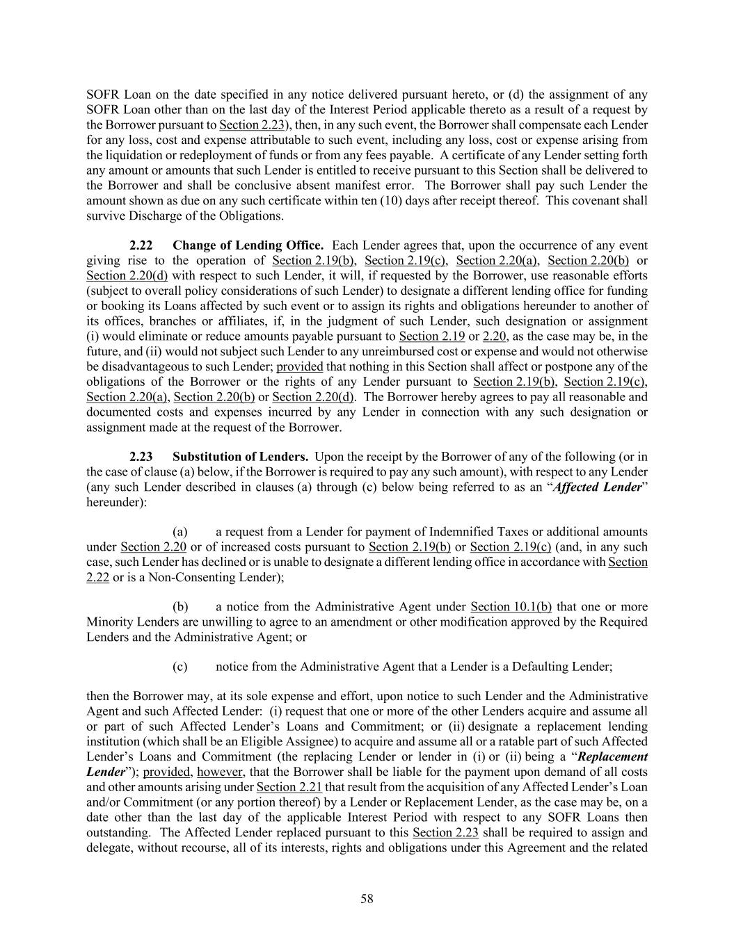58 SOFR Loan on the date specified in any notice delivered pursuant hereto, or (d) the assignment of any SOFR Loan other than on the last day of the Interest Period applicable thereto as a result of a request by the Borrower pursuant to Section 2.23), then, in any such event, the Borrower shall compensate each Lender for any loss, cost and expense attributable to such event, including any loss, cost or expense arising from the liquidation or redeployment of funds or from any fees payable. A certificate of any Lender setting forth any amount or amounts that such Lender is entitled to receive pursuant to this Section shall be delivered to the Borrower and shall be conclusive absent manifest error. The Borrower shall pay such Lender the amount shown as due on any such certificate within ten (10) days after receipt thereof. This covenant shall survive Discharge of the Obligations. Change of Lending Office. Each Lender agrees that, upon the occurrence of any event giving rise to the operation of Section 2.19(b), Section 2.19(c), Section 2.20(a), Section 2.20(b) or Section 2.20(d) with respect to such Lender, it will, if requested by the Borrower, use reasonable efforts (subject to overall policy considerations of such Lender) to designate a different lending office for funding or booking its Loans affected by such event or to assign its rights and obligations hereunder to another of its offices, branches or affiliates, if, in the judgment of such Lender, such designation or assignment (i) would eliminate or reduce amounts payable pursuant to Section 2.19 or 2.20, as the case may be, in the future, and (ii) would not subject such Lender to any unreimbursed cost or expense and would not otherwise be disadvantageous to such Lender; provided that nothing in this Section shall affect or postpone any of the obligations of the Borrower or the rights of any Lender pursuant to Section 2.19(b), Section 2.19(c), Section 2.20(a), Section 2.20(b) or Section 2.20(d). The Borrower hereby agrees to pay all reasonable and documented costs and expenses incurred by any Lender in connection with any such designation or assignment made at the request of the Borrower. Substitution of Lenders. Upon the receipt by the Borrower of any of the following (or in the case of clause (a) below, if the Borrower is required to pay any such amount), with respect to any Lender (any such Lender described in clauses (a) through (c) below being referred to as an “Affected Lender” hereunder): (a) a request from a Lender for payment of Indemnified Taxes or additional amounts under Section 2.20 or of increased costs pursuant to Section 2.19(b) or Section 2.19(c) (and, in any such case, such Lender has declined or is unable to designate a different lending office in accordance with Section 2.22 or is a Non-Consenting Lender); (b) a notice from the Administrative Agent under Section 10.1(b) that one or more Minority Lenders are unwilling to agree to an amendment or other modification approved by the Required Lenders and the Administrative Agent; or (c) notice from the Administrative Agent that a Lender is a Defaulting Lender; then the Borrower may, at its sole expense and effort, upon notice to such Lender and the Administrative Agent and such Affected Lender: (i) request that one or more of the other Lenders acquire and assume all or part of such Affected Lender’s Loans and Commitment; or (ii) designate a replacement lending institution (which shall be an Eligible Assignee) to acquire and assume all or a ratable part of such Affected Lender’s Loans and Commitment (the replacing Lender or lender in (i) or (ii) being a “Replacement Lender”); provided, however, that the Borrower shall be liable for the payment upon demand of all costs and other amounts arising under Section 2.21 that result from the acquisition of any Affected Lender’s Loan and/or Commitment (or any portion thereof) by a Lender or Replacement Lender, as the case may be, on a date other than the last day of the applicable Interest Period with respect to any SOFR Loans then outstanding. The Affected Lender replaced pursuant to this Section 2.23 shall be required to assign and delegate, without recourse, all of its interests, rights and obligations under this Agreement and the related