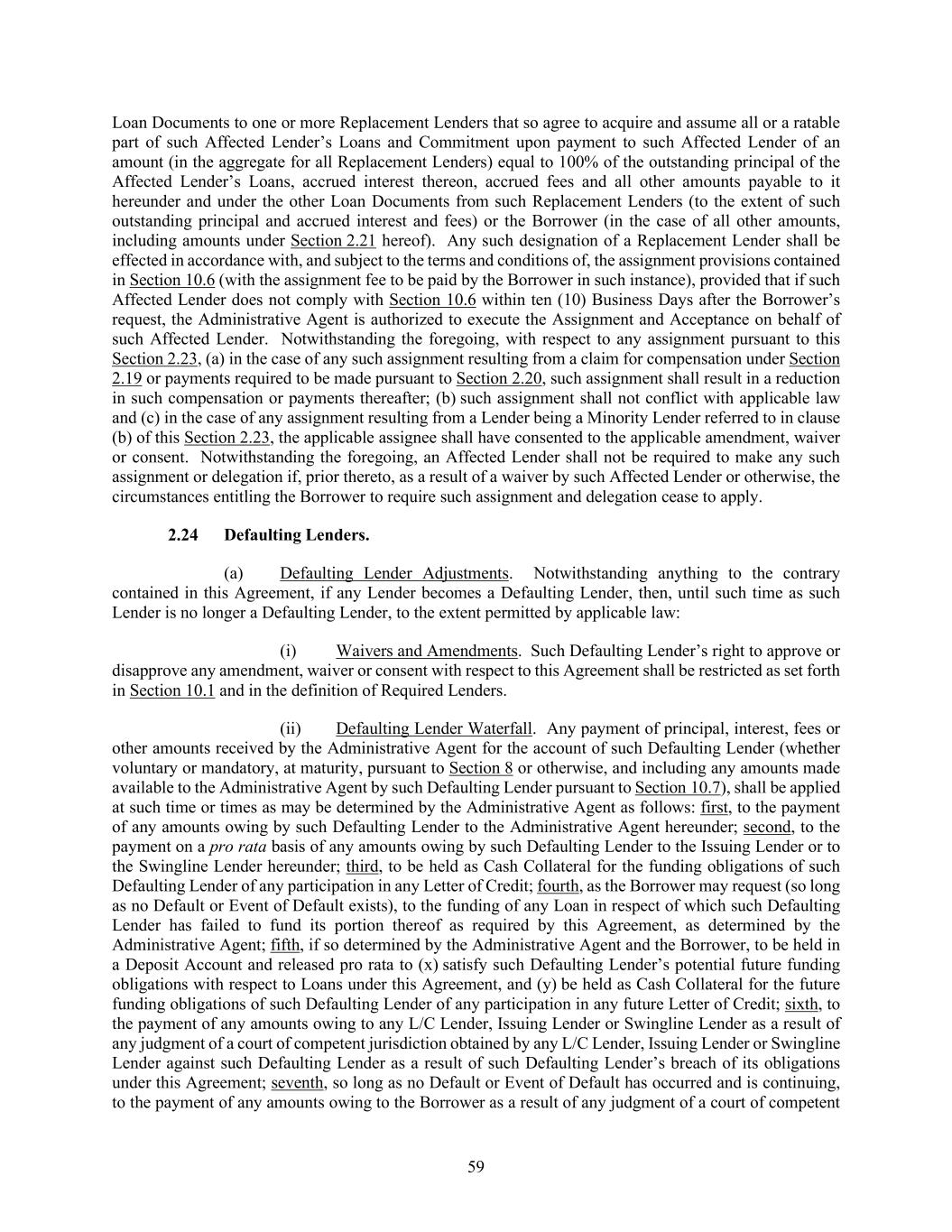 59 Loan Documents to one or more Replacement Lenders that so agree to acquire and assume all or a ratable part of such Affected Lender’s Loans and Commitment upon payment to such Affected Lender of an amount (in the aggregate for all Replacement Lenders) equal to 100% of the outstanding principal of the Affected Lender’s Loans, accrued interest thereon, accrued fees and all other amounts payable to it hereunder and under the other Loan Documents from such Replacement Lenders (to the extent of such outstanding principal and accrued interest and fees) or the Borrower (in the case of all other amounts, including amounts under Section 2.21 hereof). Any such designation of a Replacement Lender shall be effected in accordance with, and subject to the terms and conditions of, the assignment provisions contained in Section 10.6 (with the assignment fee to be paid by the Borrower in such instance), provided that if such Affected Lender does not comply with Section 10.6 within ten (10) Business Days after the Borrower’s request, the Administrative Agent is authorized to execute the Assignment and Acceptance on behalf of such Affected Lender. Notwithstanding the foregoing, with respect to any assignment pursuant to this Section 2.23, (a) in the case of any such assignment resulting from a claim for compensation under Section 2.19 or payments required to be made pursuant to Section 2.20, such assignment shall result in a reduction in such compensation or payments thereafter; (b) such assignment shall not conflict with applicable law and (c) in the case of any assignment resulting from a Lender being a Minority Lender referred to in clause (b) of this Section 2.23, the applicable assignee shall have consented to the applicable amendment, waiver or consent. Notwithstanding the foregoing, an Affected Lender shall not be required to make any such assignment or delegation if, prior thereto, as a result of a waiver by such Affected Lender or otherwise, the circumstances entitling the Borrower to require such assignment and delegation cease to apply. Defaulting Lenders. (a) Defaulting Lender Adjustments. Notwithstanding anything to the contrary contained in this Agreement, if any Lender becomes a Defaulting Lender, then, until such time as such Lender is no longer a Defaulting Lender, to the extent permitted by applicable law: (i) Waivers and Amendments. Such Defaulting Lender’s right to approve or disapprove any amendment, waiver or consent with respect to this Agreement shall be restricted as set forth in Section 10.1 and in the definition of Required Lenders. (ii) Defaulting Lender Waterfall. Any payment of principal, interest, fees or other amounts received by the Administrative Agent for the account of such Defaulting Lender (whether voluntary or mandatory, at maturity, pursuant to Section 8 or otherwise, and including any amounts made available to the Administrative Agent by such Defaulting Lender pursuant to Section 10.7), shall be applied at such time or times as may be determined by the Administrative Agent as follows: first, to the payment of any amounts owing by such Defaulting Lender to the Administrative Agent hereunder; second, to the payment on a pro rata basis of any amounts owing by such Defaulting Lender to the Issuing Lender or to the Swingline Lender hereunder; third, to be held as Cash Collateral for the funding obligations of such Defaulting Lender of any participation in any Letter of Credit; fourth, as the Borrower may request (so long as no Default or Event of Default exists), to the funding of any Loan in respect of which such Defaulting Lender has failed to fund its portion thereof as required by this Agreement, as determined by the Administrative Agent; fifth, if so determined by the Administrative Agent and the Borrower, to be held in a Deposit Account and released pro rata to (x) satisfy such Defaulting Lender’s potential future funding obligations with respect to Loans under this Agreement, and (y) be held as Cash Collateral for the future funding obligations of such Defaulting Lender of any participation in any future Letter of Credit; sixth, to the payment of any amounts owing to any L/C Lender, Issuing Lender or Swingline Lender as a result of any judgment of a court of competent jurisdiction obtained by any L/C Lender, Issuing Lender or Swingline Lender against such Defaulting Lender as a result of such Defaulting Lender’s breach of its obligations under this Agreement; seventh, so long as no Default or Event of Default has occurred and is continuing, to the payment of any amounts owing to the Borrower as a result of any judgment of a court of competent