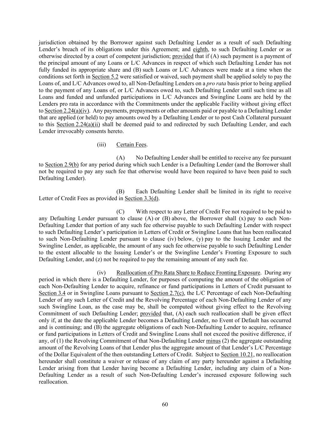 60 jurisdiction obtained by the Borrower against such Defaulting Lender as a result of such Defaulting Lender’s breach of its obligations under this Agreement; and eighth, to such Defaulting Lender or as otherwise directed by a court of competent jurisdiction; provided that if (A) such payment is a payment of the principal amount of any Loans or L/C Advances in respect of which such Defaulting Lender has not fully funded its appropriate share and (B) such Loans or L/C Advances were made at a time when the conditions set forth in Section 5.2 were satisfied or waived, such payment shall be applied solely to pay the Loans of, and L/C Advances owed to, all Non-Defaulting Lenders on a pro rata basis prior to being applied to the payment of any Loans of, or L/C Advances owed to, such Defaulting Lender until such time as all Loans and funded and unfunded participations in L/C Advances and Swingline Loans are held by the Lenders pro rata in accordance with the Commitments under the applicable Facility without giving effect to Section 2.24(a)(iv). Any payments, prepayments or other amounts paid or payable to a Defaulting Lender that are applied (or held) to pay amounts owed by a Defaulting Lender or to post Cash Collateral pursuant to this Section 2.24(a)(ii) shall be deemed paid to and redirected by such Defaulting Lender, and each Lender irrevocably consents hereto. (iii) Certain Fees. (A) No Defaulting Lender shall be entitled to receive any fee pursuant to Section 2.9(b) for any period during which such Lender is a Defaulting Lender (and the Borrower shall not be required to pay any such fee that otherwise would have been required to have been paid to such Defaulting Lender). (B) Each Defaulting Lender shall be limited in its right to receive Letter of Credit Fees as provided in Section 3.3(d). (C) With respect to any Letter of Credit Fee not required to be paid to any Defaulting Lender pursuant to clause (A) or (B) above, the Borrower shall (x) pay to each Non- Defaulting Lender that portion of any such fee otherwise payable to such Defaulting Lender with respect to such Defaulting Lender’s participation in Letters of Credit or Swingline Loans that has been reallocated to such Non-Defaulting Lender pursuant to clause (iv) below, (y) pay to the Issuing Lender and the Swingline Lender, as applicable, the amount of any such fee otherwise payable to such Defaulting Lender to the extent allocable to the Issuing Lender’s or the Swingline Lender’s Fronting Exposure to such Defaulting Lender, and (z) not be required to pay the remaining amount of any such fee. (iv) Reallocation of Pro Rata Share to Reduce Fronting Exposure. During any period in which there is a Defaulting Lender, for purposes of computing the amount of the obligation of each Non-Defaulting Lender to acquire, refinance or fund participations in Letters of Credit pursuant to Section 3.4 or in Swingline Loans pursuant to Section 2.7(c), the L/C Percentage of each Non-Defaulting Lender of any such Letter of Credit and the Revolving Percentage of each Non-Defaulting Lender of any such Swingline Loan, as the case may be, shall be computed without giving effect to the Revolving Commitment of such Defaulting Lender; provided that, (A) each such reallocation shall be given effect only if, at the date the applicable Lender becomes a Defaulting Lender, no Event of Default has occurred and is continuing; and (B) the aggregate obligations of each Non-Defaulting Lender to acquire, refinance or fund participations in Letters of Credit and Swingline Loans shall not exceed the positive difference, if any, of (1) the Revolving Commitment of that Non-Defaulting Lender minus (2) the aggregate outstanding amount of the Revolving Loans of that Lender plus the aggregate amount of that Lender’s L/C Percentage of the Dollar Equivalent of the then outstanding Letters of Credit. Subject to Section 10.21, no reallocation hereunder shall constitute a waiver or release of any claim of any party hereunder against a Defaulting Lender arising from that Lender having become a Defaulting Lender, including any claim of a Non- Defaulting Lender as a result of such Non-Defaulting Lender’s increased exposure following such reallocation.