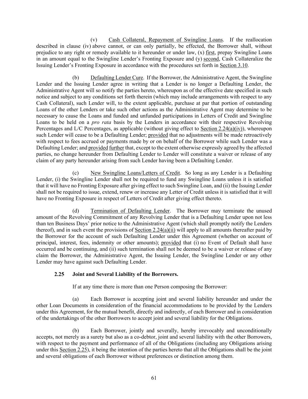 61 (v) Cash Collateral, Repayment of Swingline Loans. If the reallocation described in clause (iv) above cannot, or can only partially, be effected, the Borrower shall, without prejudice to any right or remedy available to it hereunder or under law, (x) first, prepay Swingline Loans in an amount equal to the Swingline Lender’s Fronting Exposure and (y) second, Cash Collateralize the Issuing Lender’s Fronting Exposure in accordance with the procedures set forth in Section 3.10. (b) Defaulting Lender Cure. If the Borrower, the Administrative Agent, the Swingline Lender and the Issuing Lender agree in writing that a Lender is no longer a Defaulting Lender, the Administrative Agent will so notify the parties hereto, whereupon as of the effective date specified in such notice and subject to any conditions set forth therein (which may include arrangements with respect to any Cash Collateral), such Lender will, to the extent applicable, purchase at par that portion of outstanding Loans of the other Lenders or take such other actions as the Administrative Agent may determine to be necessary to cause the Loans and funded and unfunded participations in Letters of Credit and Swingline Loans to be held on a pro rata basis by the Lenders in accordance with their respective Revolving Percentages and L/C Percentages, as applicable (without giving effect to Section 2.24(a)(iv)), whereupon such Lender will cease to be a Defaulting Lender; provided that no adjustments will be made retroactively with respect to fees accrued or payments made by or on behalf of the Borrower while such Lender was a Defaulting Lender; and provided further that, except to the extent otherwise expressly agreed by the affected parties, no change hereunder from Defaulting Lender to Lender will constitute a waiver or release of any claim of any party hereunder arising from such Lender having been a Defaulting Lender. (c) New Swingline Loans/Letters of Credit. So long as any Lender is a Defaulting Lender, (i) the Swingline Lender shall not be required to fund any Swingline Loans unless it is satisfied that it will have no Fronting Exposure after giving effect to such Swingline Loan, and (ii) the Issuing Lender shall not be required to issue, extend, renew or increase any Letter of Credit unless it is satisfied that it will have no Fronting Exposure in respect of Letters of Credit after giving effect thereto. (d) Termination of Defaulting Lender. The Borrower may terminate the unused amount of the Revolving Commitment of any Revolving Lender that is a Defaulting Lender upon not less than ten Business Days’ prior notice to the Administrative Agent (which shall promptly notify the Lenders thereof), and in such event the provisions of Section 2.24(a)(ii) will apply to all amounts thereafter paid by the Borrower for the account of such Defaulting Lender under this Agreement (whether on account of principal, interest, fees, indemnity or other amounts); provided that (i) no Event of Default shall have occurred and be continuing, and (ii) such termination shall not be deemed to be a waiver or release of any claim the Borrower, the Administrative Agent, the Issuing Lender, the Swingline Lender or any other Lender may have against such Defaulting Lender. Joint and Several Liability of the Borrowers. If at any time there is more than one Person composing the Borrower: (a) Each Borrower is accepting joint and several liability hereunder and under the other Loan Documents in consideration of the financial accommodations to be provided by the Lenders under this Agreement, for the mutual benefit, directly and indirectly, of each Borrower and in consideration of the undertakings of the other Borrowers to accept joint and several liability for the Obligations. (b) Each Borrower, jointly and severally, hereby irrevocably and unconditionally accepts, not merely as a surety but also as a co-debtor, joint and several liability with the other Borrowers, with respect to the payment and performance of all of the Obligations (including any Obligations arising under this Section 2.25), it being the intention of the parties hereto that all the Obligations shall be the joint and several obligations of each Borrower without preferences or distinction among them.