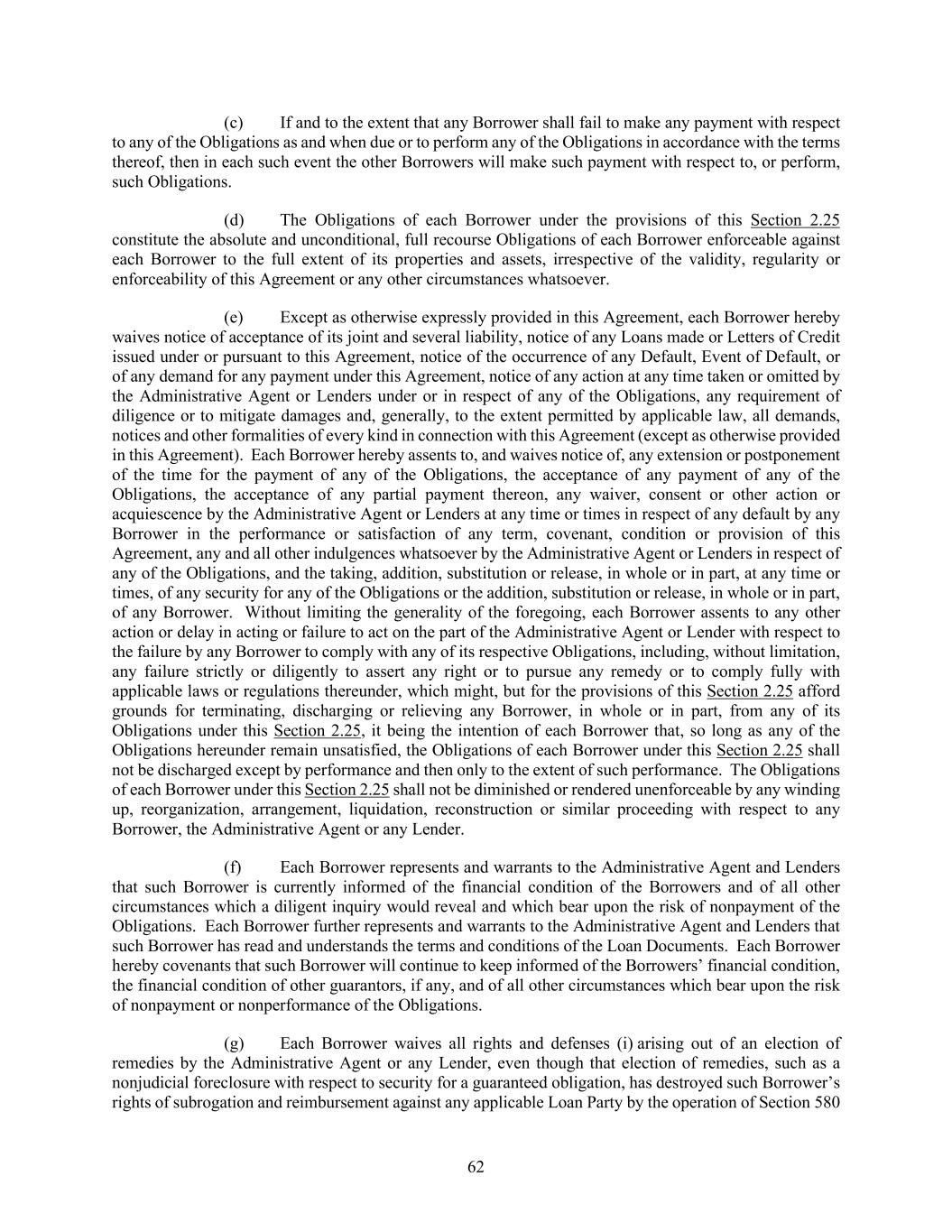 62 (c) If and to the extent that any Borrower shall fail to make any payment with respect to any of the Obligations as and when due or to perform any of the Obligations in accordance with the terms thereof, then in each such event the other Borrowers will make such payment with respect to, or perform, such Obligations. (d) The Obligations of each Borrower under the provisions of this Section 2.25 constitute the absolute and unconditional, full recourse Obligations of each Borrower enforceable against each Borrower to the full extent of its properties and assets, irrespective of the validity, regularity or enforceability of this Agreement or any other circumstances whatsoever. (e) Except as otherwise expressly provided in this Agreement, each Borrower hereby waives notice of acceptance of its joint and several liability, notice of any Loans made or Letters of Credit issued under or pursuant to this Agreement, notice of the occurrence of any Default, Event of Default, or of any demand for any payment under this Agreement, notice of any action at any time taken or omitted by the Administrative Agent or Lenders under or in respect of any of the Obligations, any requirement of diligence or to mitigate damages and, generally, to the extent permitted by applicable law, all demands, notices and other formalities of every kind in connection with this Agreement (except as otherwise provided in this Agreement). Each Borrower hereby assents to, and waives notice of, any extension or postponement of the time for the payment of any of the Obligations, the acceptance of any payment of any of the Obligations, the acceptance of any partial payment thereon, any waiver, consent or other action or acquiescence by the Administrative Agent or Lenders at any time or times in respect of any default by any Borrower in the performance or satisfaction of any term, covenant, condition or provision of this Agreement, any and all other indulgences whatsoever by the Administrative Agent or Lenders in respect of any of the Obligations, and the taking, addition, substitution or release, in whole or in part, at any time or times, of any security for any of the Obligations or the addition, substitution or release, in whole or in part, of any Borrower. Without limiting the generality of the foregoing, each Borrower assents to any other action or delay in acting or failure to act on the part of the Administrative Agent or Lender with respect to the failure by any Borrower to comply with any of its respective Obligations, including, without limitation, any failure strictly or diligently to assert any right or to pursue any remedy or to comply fully with applicable laws or regulations thereunder, which might, but for the provisions of this Section 2.25 afford grounds for terminating, discharging or relieving any Borrower, in whole or in part, from any of its Obligations under this Section 2.25, it being the intention of each Borrower that, so long as any of the Obligations hereunder remain unsatisfied, the Obligations of each Borrower under this Section 2.25 shall not be discharged except by performance and then only to the extent of such performance. The Obligations of each Borrower under this Section 2.25 shall not be diminished or rendered unenforceable by any winding up, reorganization, arrangement, liquidation, reconstruction or similar proceeding with respect to any Borrower, the Administrative Agent or any Lender. (f) Each Borrower represents and warrants to the Administrative Agent and Lenders that such Borrower is currently informed of the financial condition of the Borrowers and of all other circumstances which a diligent inquiry would reveal and which bear upon the risk of nonpayment of the Obligations. Each Borrower further represents and warrants to the Administrative Agent and Lenders that such Borrower has read and understands the terms and conditions of the Loan Documents. Each Borrower hereby covenants that such Borrower will continue to keep informed of the Borrowers’ financial condition, the financial condition of other guarantors, if any, and of all other circumstances which bear upon the risk of nonpayment or nonperformance of the Obligations. (g) Each Borrower waives all rights and defenses (i) arising out of an election of remedies by the Administrative Agent or any Lender, even though that election of remedies, such as a nonjudicial foreclosure with respect to security for a guaranteed obligation, has destroyed such Borrower’s rights of subrogation and reimbursement against any applicable Loan Party by the operation of Section 580