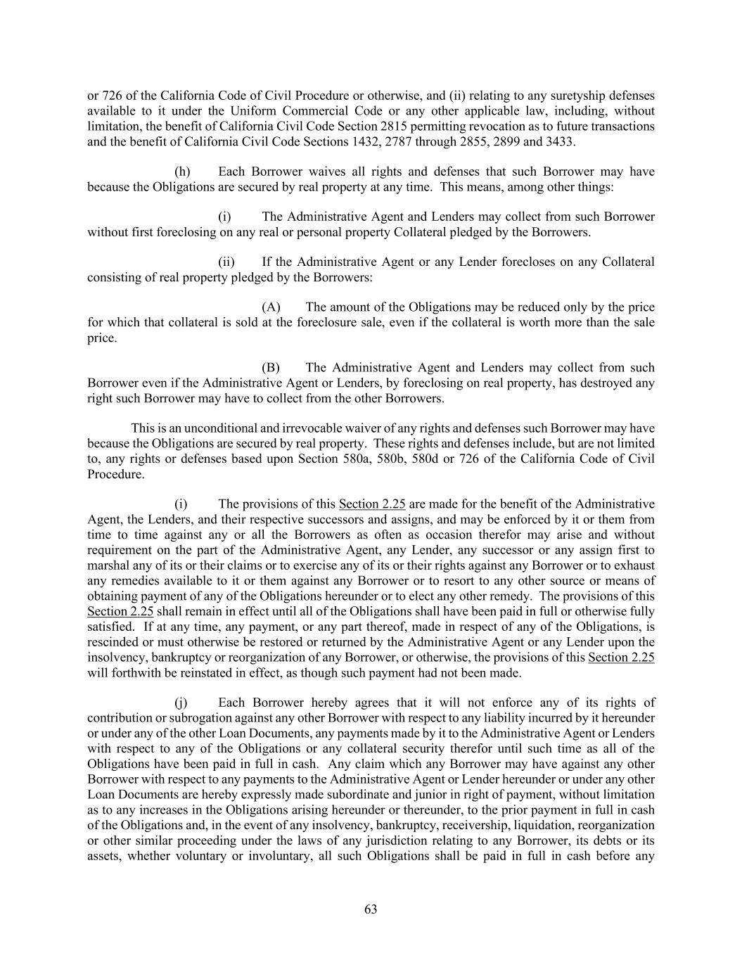 63 or 726 of the California Code of Civil Procedure or otherwise, and (ii) relating to any suretyship defenses available to it under the Uniform Commercial Code or any other applicable law, including, without limitation, the benefit of California Civil Code Section 2815 permitting revocation as to future transactions and the benefit of California Civil Code Sections 1432, 2787 through 2855, 2899 and 3433. (h) Each Borrower waives all rights and defenses that such Borrower may have because the Obligations are secured by real property at any time. This means, among other things: (i) The Administrative Agent and Lenders may collect from such Borrower without first foreclosing on any real or personal property Collateral pledged by the Borrowers. (ii) If the Administrative Agent or any Lender forecloses on any Collateral consisting of real property pledged by the Borrowers: (A) The amount of the Obligations may be reduced only by the price for which that collateral is sold at the foreclosure sale, even if the collateral is worth more than the sale price. (B) The Administrative Agent and Lenders may collect from such Borrower even if the Administrative Agent or Lenders, by foreclosing on real property, has destroyed any right such Borrower may have to collect from the other Borrowers. This is an unconditional and irrevocable waiver of any rights and defenses such Borrower may have because the Obligations are secured by real property. These rights and defenses include, but are not limited to, any rights or defenses based upon Section 580a, 580b, 580d or 726 of the California Code of Civil Procedure. (i) The provisions of this Section 2.25 are made for the benefit of the Administrative Agent, the Lenders, and their respective successors and assigns, and may be enforced by it or them from time to time against any or all the Borrowers as often as occasion therefor may arise and without requirement on the part of the Administrative Agent, any Lender, any successor or any assign first to marshal any of its or their claims or to exercise any of its or their rights against any Borrower or to exhaust any remedies available to it or them against any Borrower or to resort to any other source or means of obtaining payment of any of the Obligations hereunder or to elect any other remedy. The provisions of this Section 2.25 shall remain in effect until all of the Obligations shall have been paid in full or otherwise fully satisfied. If at any time, any payment, or any part thereof, made in respect of any of the Obligations, is rescinded or must otherwise be restored or returned by the Administrative Agent or any Lender upon the insolvency, bankruptcy or reorganization of any Borrower, or otherwise, the provisions of this Section 2.25 will forthwith be reinstated in effect, as though such payment had not been made. (j) Each Borrower hereby agrees that it will not enforce any of its rights of contribution or subrogation against any other Borrower with respect to any liability incurred by it hereunder or under any of the other Loan Documents, any payments made by it to the Administrative Agent or Lenders with respect to any of the Obligations or any collateral security therefor until such time as all of the Obligations have been paid in full in cash. Any claim which any Borrower may have against any other Borrower with respect to any payments to the Administrative Agent or Lender hereunder or under any other Loan Documents are hereby expressly made subordinate and junior in right of payment, without limitation as to any increases in the Obligations arising hereunder or thereunder, to the prior payment in full in cash of the Obligations and, in the event of any insolvency, bankruptcy, receivership, liquidation, reorganization or other similar proceeding under the laws of any jurisdiction relating to any Borrower, its debts or its assets, whether voluntary or involuntary, all such Obligations shall be paid in full in cash before any
