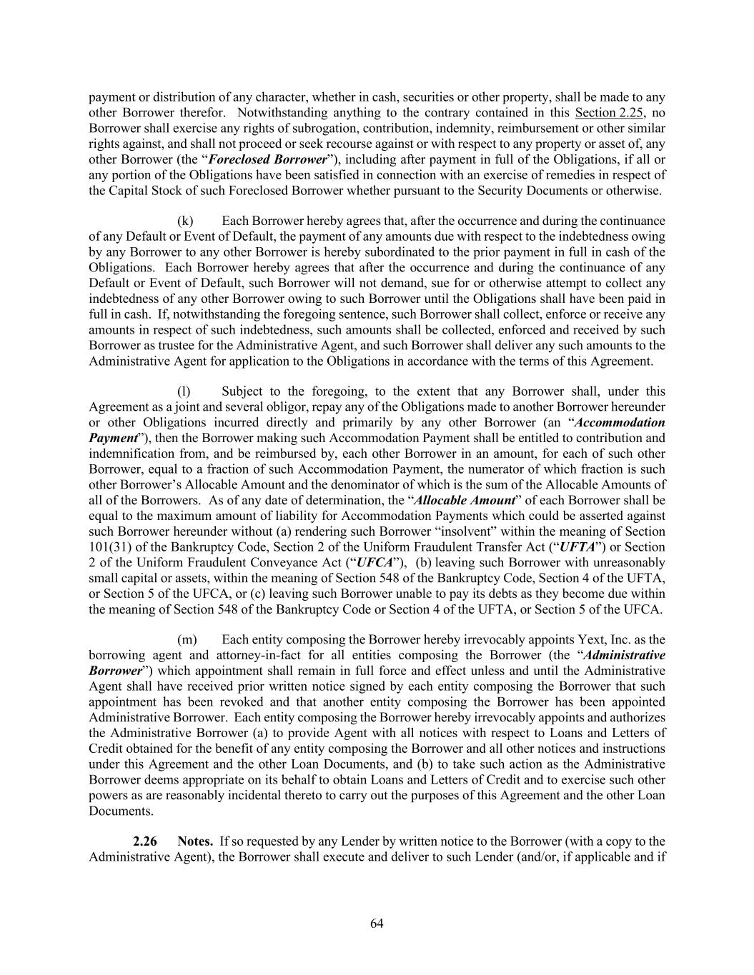 64 payment or distribution of any character, whether in cash, securities or other property, shall be made to any other Borrower therefor. Notwithstanding anything to the contrary contained in this Section 2.25, no Borrower shall exercise any rights of subrogation, contribution, indemnity, reimbursement or other similar rights against, and shall not proceed or seek recourse against or with respect to any property or asset of, any other Borrower (the “Foreclosed Borrower”), including after payment in full of the Obligations, if all or any portion of the Obligations have been satisfied in connection with an exercise of remedies in respect of the Capital Stock of such Foreclosed Borrower whether pursuant to the Security Documents or otherwise. (k) Each Borrower hereby agrees that, after the occurrence and during the continuance of any Default or Event of Default, the payment of any amounts due with respect to the indebtedness owing by any Borrower to any other Borrower is hereby subordinated to the prior payment in full in cash of the Obligations. Each Borrower hereby agrees that after the occurrence and during the continuance of any Default or Event of Default, such Borrower will not demand, sue for or otherwise attempt to collect any indebtedness of any other Borrower owing to such Borrower until the Obligations shall have been paid in full in cash. If, notwithstanding the foregoing sentence, such Borrower shall collect, enforce or receive any amounts in respect of such indebtedness, such amounts shall be collected, enforced and received by such Borrower as trustee for the Administrative Agent, and such Borrower shall deliver any such amounts to the Administrative Agent for application to the Obligations in accordance with the terms of this Agreement. (l) Subject to the foregoing, to the extent that any Borrower shall, under this Agreement as a joint and several obligor, repay any of the Obligations made to another Borrower hereunder or other Obligations incurred directly and primarily by any other Borrower (an “Accommodation Payment”), then the Borrower making such Accommodation Payment shall be entitled to contribution and indemnification from, and be reimbursed by, each other Borrower in an amount, for each of such other Borrower, equal to a fraction of such Accommodation Payment, the numerator of which fraction is such other Borrower’s Allocable Amount and the denominator of which is the sum of the Allocable Amounts of all of the Borrowers. As of any date of determination, the “Allocable Amount” of each Borrower shall be equal to the maximum amount of liability for Accommodation Payments which could be asserted against such Borrower hereunder without (a) rendering such Borrower “insolvent” within the meaning of Section 101(31) of the Bankruptcy Code, Section 2 of the Uniform Fraudulent Transfer Act (“UFTA”) or Section 2 of the Uniform Fraudulent Conveyance Act (“UFCA”), (b) leaving such Borrower with unreasonably small capital or assets, within the meaning of Section 548 of the Bankruptcy Code, Section 4 of the UFTA, or Section 5 of the UFCA, or (c) leaving such Borrower unable to pay its debts as they become due within the meaning of Section 548 of the Bankruptcy Code or Section 4 of the UFTA, or Section 5 of the UFCA. (m) Each entity composing the Borrower hereby irrevocably appoints Yext, Inc. as the borrowing agent and attorney-in-fact for all entities composing the Borrower (the “Administrative Borrower”) which appointment shall remain in full force and effect unless and until the Administrative Agent shall have received prior written notice signed by each entity composing the Borrower that such appointment has been revoked and that another entity composing the Borrower has been appointed Administrative Borrower. Each entity composing the Borrower hereby irrevocably appoints and authorizes the Administrative Borrower (a) to provide Agent with all notices with respect to Loans and Letters of Credit obtained for the benefit of any entity composing the Borrower and all other notices and instructions under this Agreement and the other Loan Documents, and (b) to take such action as the Administrative Borrower deems appropriate on its behalf to obtain Loans and Letters of Credit and to exercise such other powers as are reasonably incidental thereto to carry out the purposes of this Agreement and the other Loan Documents. Notes. If so requested by any Lender by written notice to the Borrower (with a copy to the Administrative Agent), the Borrower shall execute and deliver to such Lender (and/or, if applicable and if
