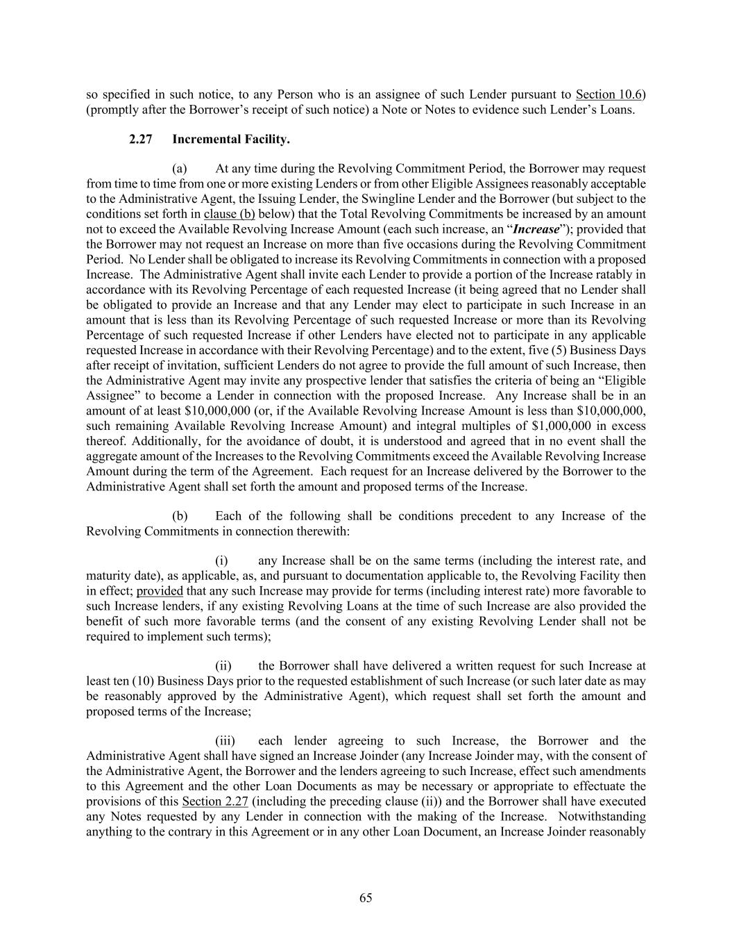 65 so specified in such notice, to any Person who is an assignee of such Lender pursuant to Section 10.6) (promptly after the Borrower’s receipt of such notice) a Note or Notes to evidence such Lender’s Loans. Incremental Facility. (a) At any time during the Revolving Commitment Period, the Borrower may request from time to time from one or more existing Lenders or from other Eligible Assignees reasonably acceptable to the Administrative Agent, the Issuing Lender, the Swingline Lender and the Borrower (but subject to the conditions set forth in clause (b) below) that the Total Revolving Commitments be increased by an amount not to exceed the Available Revolving Increase Amount (each such increase, an “Increase”); provided that the Borrower may not request an Increase on more than five occasions during the Revolving Commitment Period. No Lender shall be obligated to increase its Revolving Commitments in connection with a proposed Increase. The Administrative Agent shall invite each Lender to provide a portion of the Increase ratably in accordance with its Revolving Percentage of each requested Increase (it being agreed that no Lender shall be obligated to provide an Increase and that any Lender may elect to participate in such Increase in an amount that is less than its Revolving Percentage of such requested Increase or more than its Revolving Percentage of such requested Increase if other Lenders have elected not to participate in any applicable requested Increase in accordance with their Revolving Percentage) and to the extent, five (5) Business Days after receipt of invitation, sufficient Lenders do not agree to provide the full amount of such Increase, then the Administrative Agent may invite any prospective lender that satisfies the criteria of being an “Eligible Assignee” to become a Lender in connection with the proposed Increase. Any Increase shall be in an amount of at least $10,000,000 (or, if the Available Revolving Increase Amount is less than $10,000,000, such remaining Available Revolving Increase Amount) and integral multiples of $1,000,000 in excess thereof. Additionally, for the avoidance of doubt, it is understood and agreed that in no event shall the aggregate amount of the Increases to the Revolving Commitments exceed the Available Revolving Increase Amount during the term of the Agreement. Each request for an Increase delivered by the Borrower to the Administrative Agent shall set forth the amount and proposed terms of the Increase. (b) Each of the following shall be conditions precedent to any Increase of the Revolving Commitments in connection therewith: (i) any Increase shall be on the same terms (including the interest rate, and maturity date), as applicable, as, and pursuant to documentation applicable to, the Revolving Facility then in effect; provided that any such Increase may provide for terms (including interest rate) more favorable to such Increase lenders, if any existing Revolving Loans at the time of such Increase are also provided the benefit of such more favorable terms (and the consent of any existing Revolving Lender shall not be required to implement such terms); (ii) the Borrower shall have delivered a written request for such Increase at least ten (10) Business Days prior to the requested establishment of such Increase (or such later date as may be reasonably approved by the Administrative Agent), which request shall set forth the amount and proposed terms of the Increase; (iii) each lender agreeing to such Increase, the Borrower and the Administrative Agent shall have signed an Increase Joinder (any Increase Joinder may, with the consent of the Administrative Agent, the Borrower and the lenders agreeing to such Increase, effect such amendments to this Agreement and the other Loan Documents as may be necessary or appropriate to effectuate the provisions of this Section 2.27 (including the preceding clause (ii)) and the Borrower shall have executed any Notes requested by any Lender in connection with the making of the Increase. Notwithstanding anything to the contrary in this Agreement or in any other Loan Document, an Increase Joinder reasonably