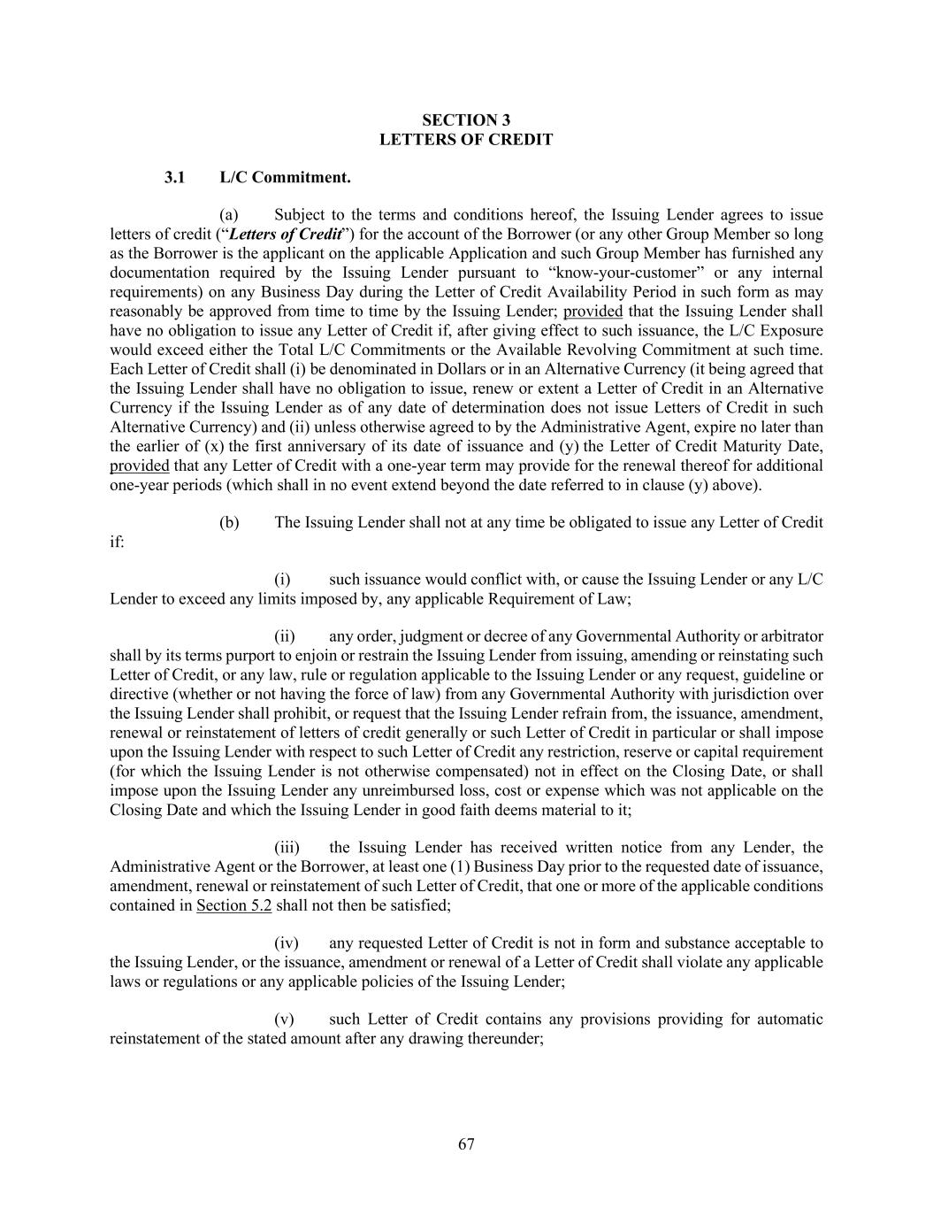 67 LETTERS OF CREDIT L/C Commitment. (a) Subject to the terms and conditions hereof, the Issuing Lender agrees to issue letters of credit (“Letters of Credit”) for the account of the Borrower (or any other Group Member so long as the Borrower is the applicant on the applicable Application and such Group Member has furnished any documentation required by the Issuing Lender pursuant to “know-your-customer” or any internal requirements) on any Business Day during the Letter of Credit Availability Period in such form as may reasonably be approved from time to time by the Issuing Lender; provided that the Issuing Lender shall have no obligation to issue any Letter of Credit if, after giving effect to such issuance, the L/C Exposure would exceed either the Total L/C Commitments or the Available Revolving Commitment at such time. Each Letter of Credit shall (i) be denominated in Dollars or in an Alternative Currency (it being agreed that the Issuing Lender shall have no obligation to issue, renew or extent a Letter of Credit in an Alternative Currency if the Issuing Lender as of any date of determination does not issue Letters of Credit in such Alternative Currency) and (ii) unless otherwise agreed to by the Administrative Agent, expire no later than the earlier of (x) the first anniversary of its date of issuance and (y) the Letter of Credit Maturity Date, provided that any Letter of Credit with a one-year term may provide for the renewal thereof for additional one-year periods (which shall in no event extend beyond the date referred to in clause (y) above). (b) The Issuing Lender shall not at any time be obligated to issue any Letter of Credit if: (i) such issuance would conflict with, or cause the Issuing Lender or any L/C Lender to exceed any limits imposed by, any applicable Requirement of Law; (ii) any order, judgment or decree of any Governmental Authority or arbitrator shall by its terms purport to enjoin or restrain the Issuing Lender from issuing, amending or reinstating such Letter of Credit, or any law, rule or regulation applicable to the Issuing Lender or any request, guideline or directive (whether or not having the force of law) from any Governmental Authority with jurisdiction over the Issuing Lender shall prohibit, or request that the Issuing Lender refrain from, the issuance, amendment, renewal or reinstatement of letters of credit generally or such Letter of Credit in particular or shall impose upon the Issuing Lender with respect to such Letter of Credit any restriction, reserve or capital requirement (for which the Issuing Lender is not otherwise compensated) not in effect on the Closing Date, or shall impose upon the Issuing Lender any unreimbursed loss, cost or expense which was not applicable on the Closing Date and which the Issuing Lender in good faith deems material to it; (iii) the Issuing Lender has received written notice from any Lender, the Administrative Agent or the Borrower, at least one (1) Business Day prior to the requested date of issuance, amendment, renewal or reinstatement of such Letter of Credit, that one or more of the applicable conditions contained in Section 5.2 shall not then be satisfied; (iv) any requested Letter of Credit is not in form and substance acceptable to the Issuing Lender, or the issuance, amendment or renewal of a Letter of Credit shall violate any applicable laws or regulations or any applicable policies of the Issuing Lender; (v) such Letter of Credit contains any provisions providing for automatic reinstatement of the stated amount after any drawing thereunder;