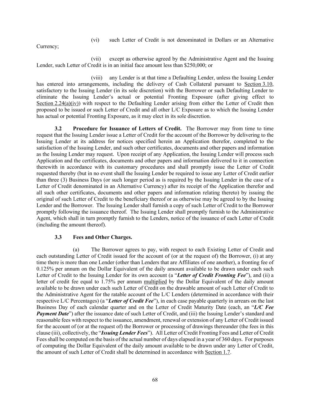68 (vi) such Letter of Credit is not denominated in Dollars or an Alternative Currency; (vii) except as otherwise agreed by the Administrative Agent and the Issuing Lender, such Letter of Credit is in an initial face amount less than $250,000; or (viii) any Lender is at that time a Defaulting Lender, unless the Issuing Lender has entered into arrangements, including the delivery of Cash Collateral pursuant to Section 3.10, satisfactory to the Issuing Lender (in its sole discretion) with the Borrower or such Defaulting Lender to eliminate the Issuing Lender’s actual or potential Fronting Exposure (after giving effect to Section 2.24(a)(iv)) with respect to the Defaulting Lender arising from either the Letter of Credit then proposed to be issued or such Letter of Credit and all other L/C Exposure as to which the Issuing Lender has actual or potential Fronting Exposure, as it may elect in its sole discretion. Procedure for Issuance of Letters of Credit. The Borrower may from time to time request that the Issuing Lender issue a Letter of Credit for the account of the Borrower by delivering to the Issuing Lender at its address for notices specified herein an Application therefor, completed to the satisfaction of the Issuing Lender, and such other certificates, documents and other papers and information as the Issuing Lender may request. Upon receipt of any Application, the Issuing Lender will process such Application and the certificates, documents and other papers and information delivered to it in connection therewith in accordance with its customary procedures and shall promptly issue the Letter of Credit requested thereby (but in no event shall the Issuing Lender be required to issue any Letter of Credit earlier than three (3) Business Days (or such longer period as is required by the Issuing Lender in the case of a Letter of Credit denominated in an Alternative Currency) after its receipt of the Application therefor and all such other certificates, documents and other papers and information relating thereto) by issuing the original of such Letter of Credit to the beneficiary thereof or as otherwise may be agreed to by the Issuing Lender and the Borrower. The Issuing Lender shall furnish a copy of such Letter of Credit to the Borrower promptly following the issuance thereof. The Issuing Lender shall promptly furnish to the Administrative Agent, which shall in turn promptly furnish to the Lenders, notice of the issuance of each Letter of Credit (including the amount thereof). Fees and Other Charges. (a) The Borrower agrees to pay, with respect to each Existing Letter of Credit and each outstanding Letter of Credit issued for the account of (or at the request of) the Borrower, (i) at any time there is more than one Lender (other than Lenders that are Affiliates of one another), a fronting fee of 0.125% per annum on the Dollar Equivalent of the daily amount available to be drawn under each such Letter of Credit to the Issuing Lender for its own account (a “Letter of Credit Fronting Fee”), and (ii) a letter of credit fee equal to 1.75% per annum multiplied by the Dollar Equivalent of the daily amount available to be drawn under each such Letter of Credit on the drawable amount of such Letter of Credit to the Administrative Agent for the ratable account of the L/C Lenders (determined in accordance with their respective L/C Percentages) (a “Letter of Credit Fee”), in each case payable quarterly in arrears on the last Business Day of each calendar quarter and on the Letter of Credit Maturity Date (each, an “L/C Fee Payment Date”) after the issuance date of such Letter of Credit, and (iii) the Issuing Lender’s standard and reasonable fees with respect to the issuance, amendment, renewal or extension of any Letter of Credit issued for the account of (or at the request of) the Borrower or processing of drawings thereunder (the fees in this clause (iii), collectively, the “Issuing Lender Fees”). All Letter of Credit Fronting Fees and Letter of Credit Fees shall be computed on the basis of the actual number of days elapsed in a year of 360 days. For purposes of computing the Dollar Equivalent of the daily amount available to be drawn under any Letter of Credit, the amount of such Letter of Credit shall be determined in accordance with Section 1.7.